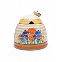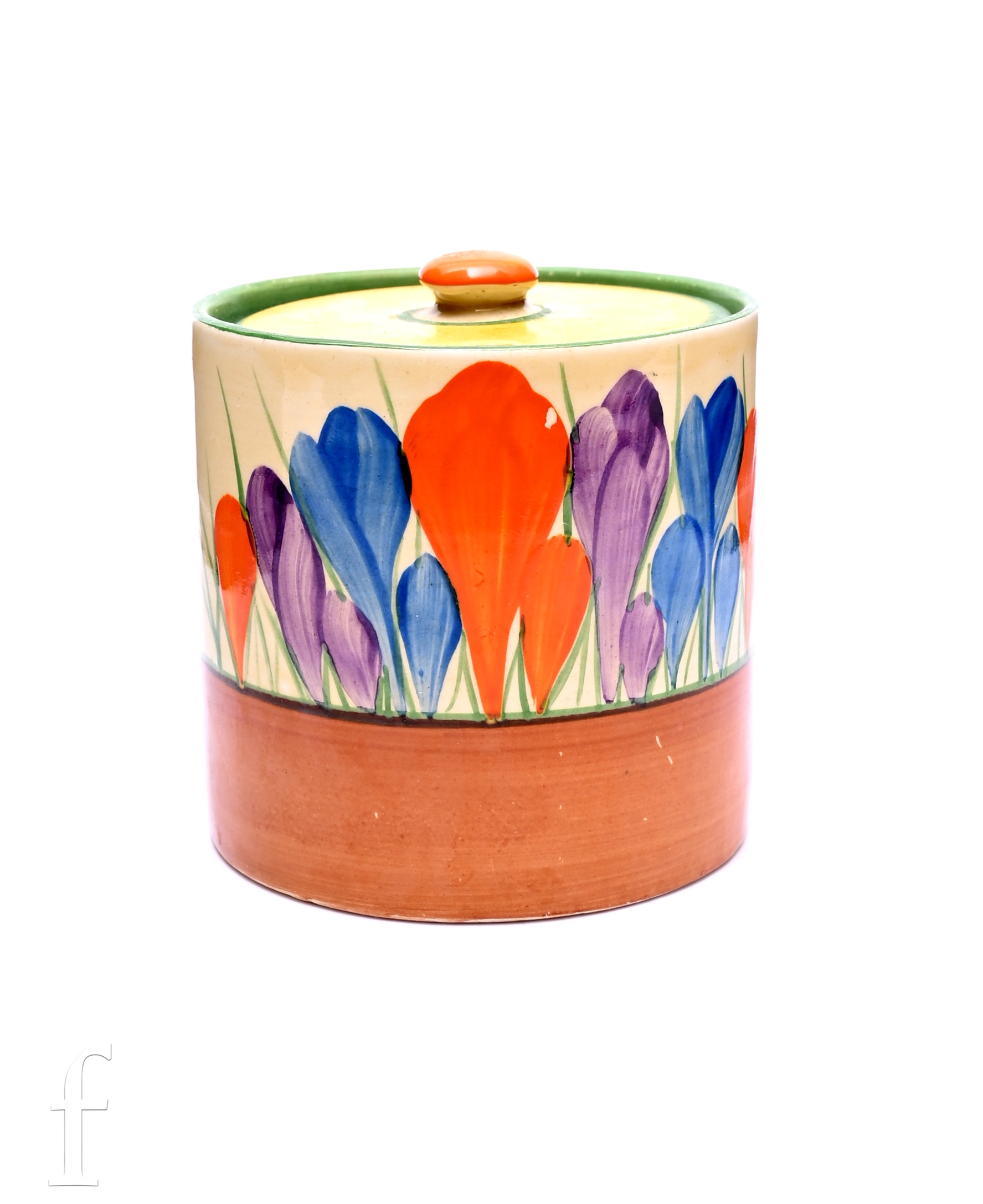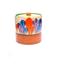 A Clarice Cliff size 3 drum shaped preserve circa 1930, hand painted with Crocus sprays with yellow, green and brown banding, CROCUS and Bizarre mark, height 8cm.