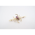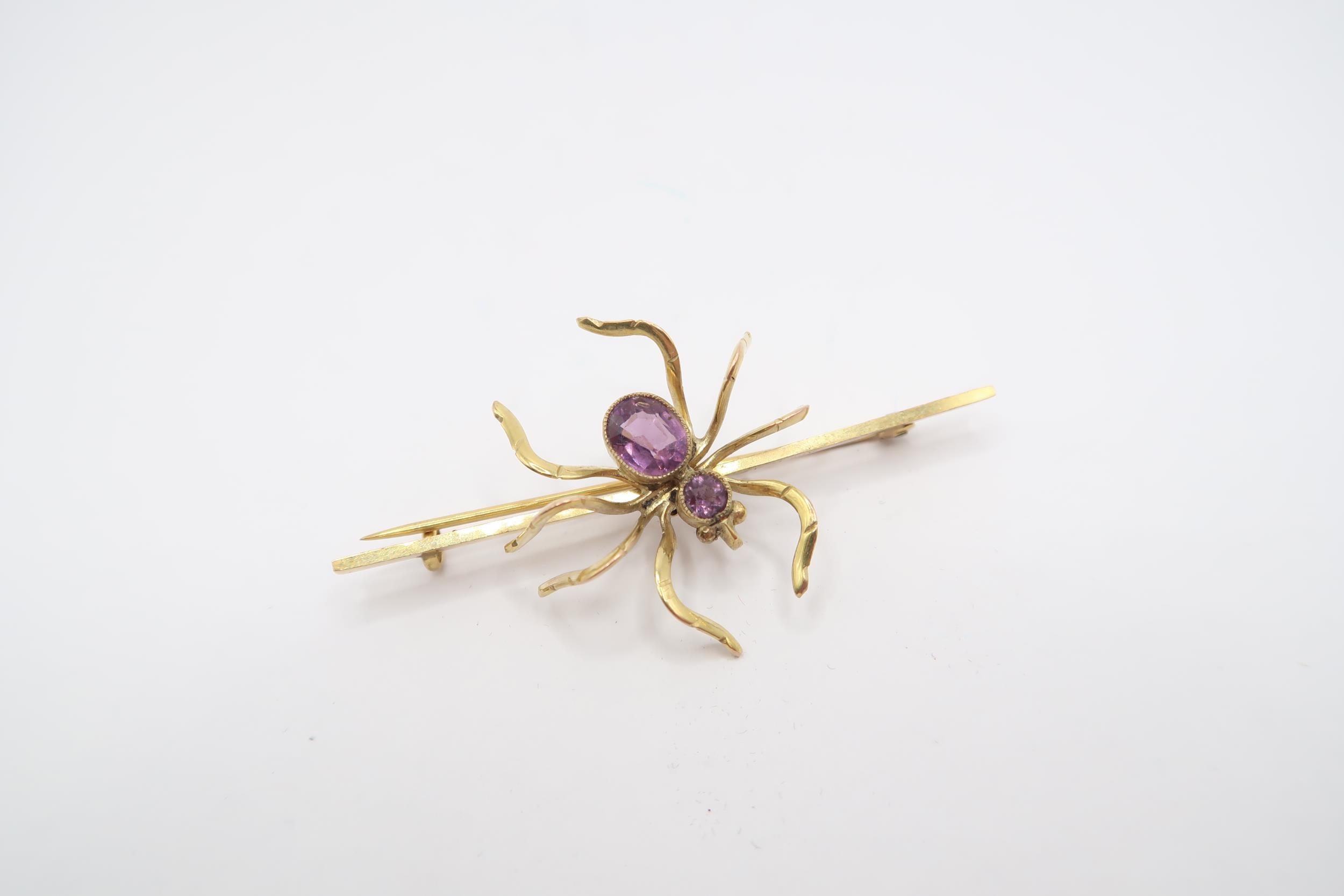 A 9ct Spider Design Brooch, Body featuring two bezel set Amethyst, size pin 6cm, spider approx 3cm x 3cm