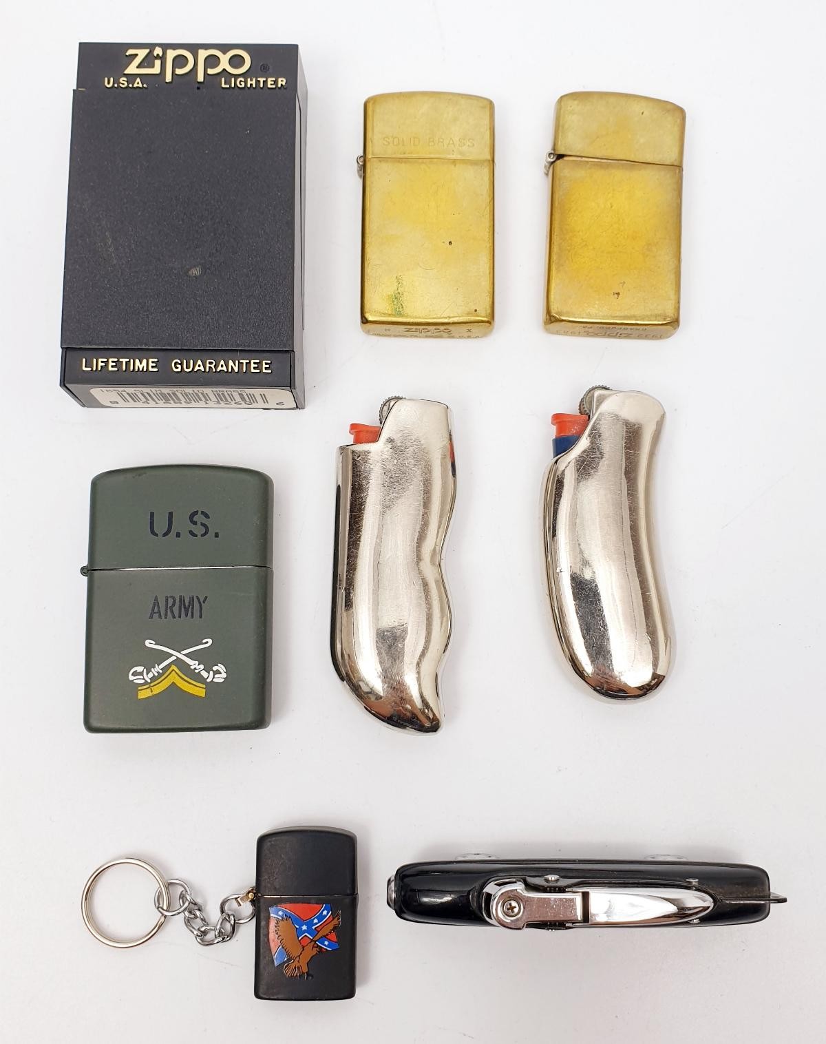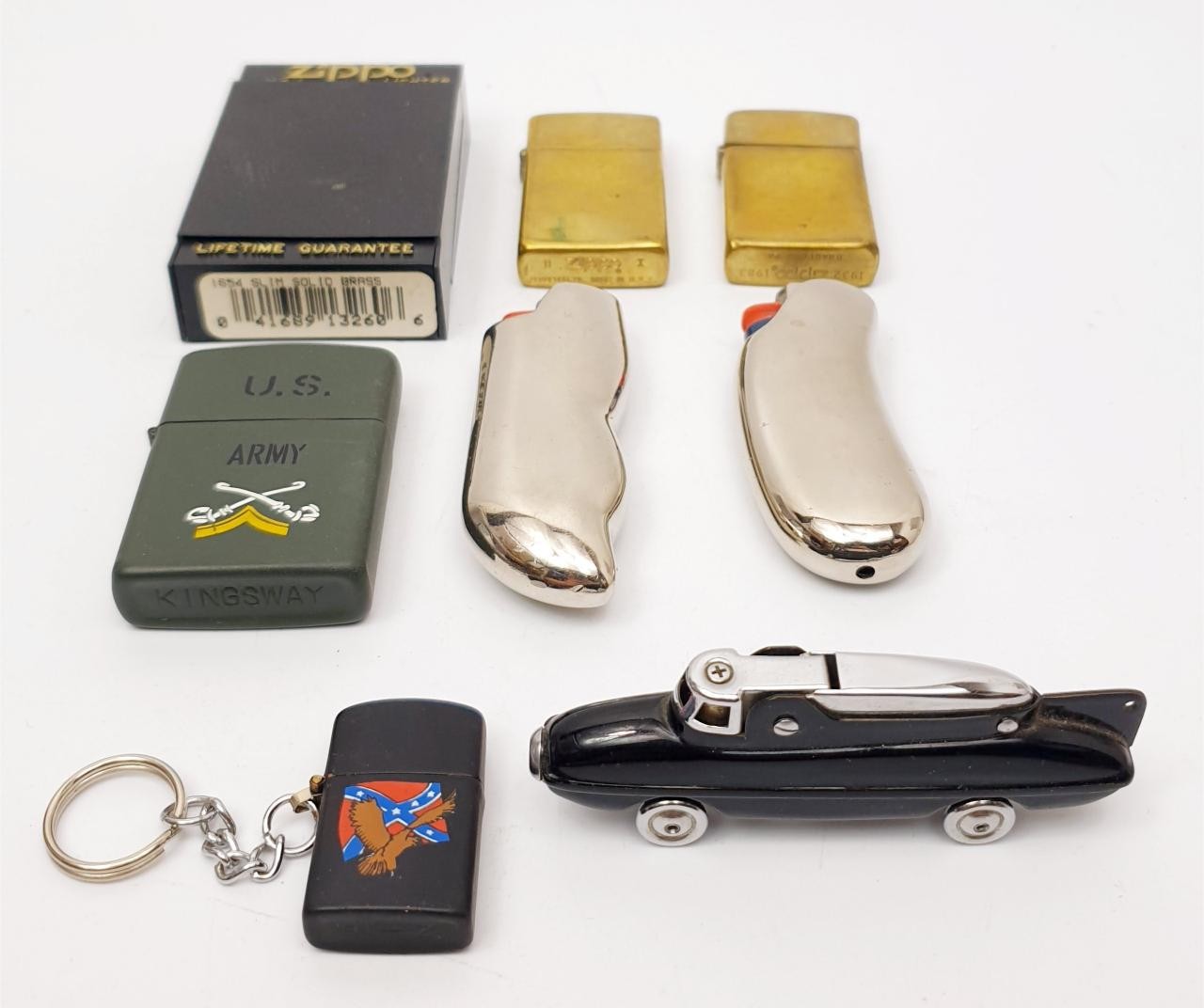 A selection of cigarette lighters including two Zippos, one A/F. UK shipping £14.