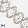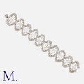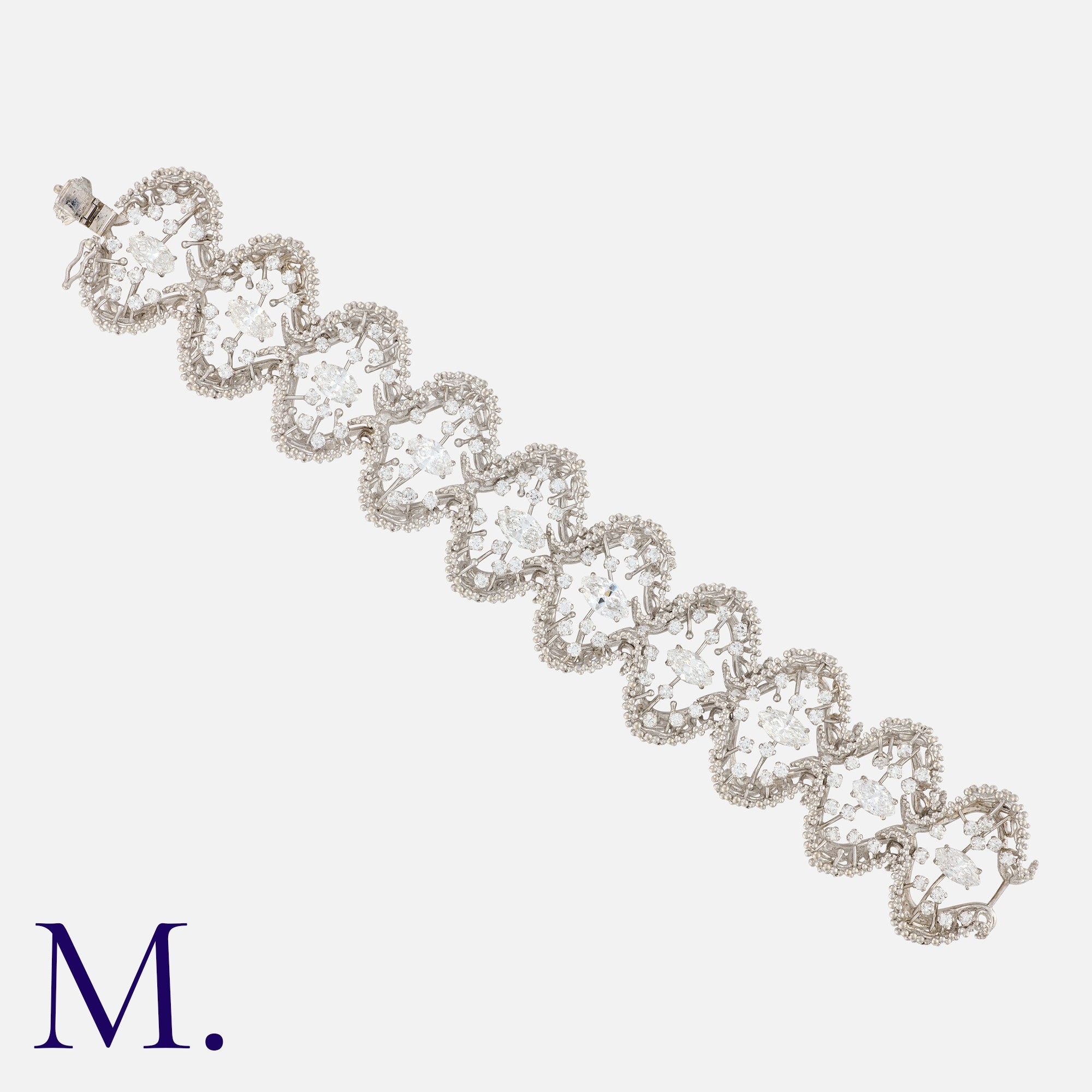 JOHN DONALD, A Modernist Diamond Bracelet in 18 carat white gold, comprising ten abstract textured links, each set with a principal marquise cut diamond to the centre and twelve round cut diamonds in surround. All diamonds totalling approximately 10.00 carats. Maker's Mark JAD. Each link marked 18.