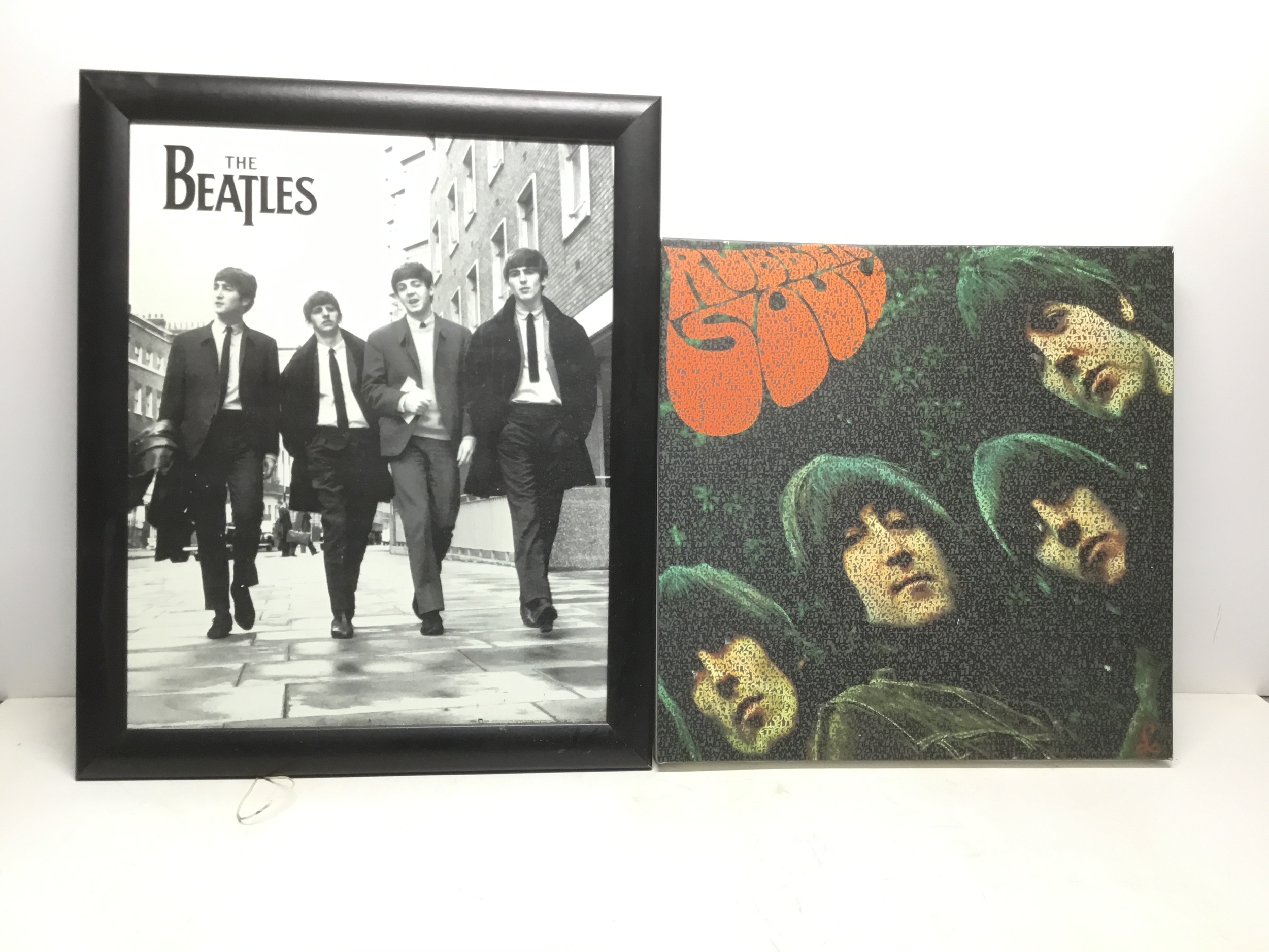 Two Beatles pictures including Rubber Soul canvas album cover