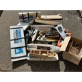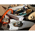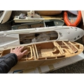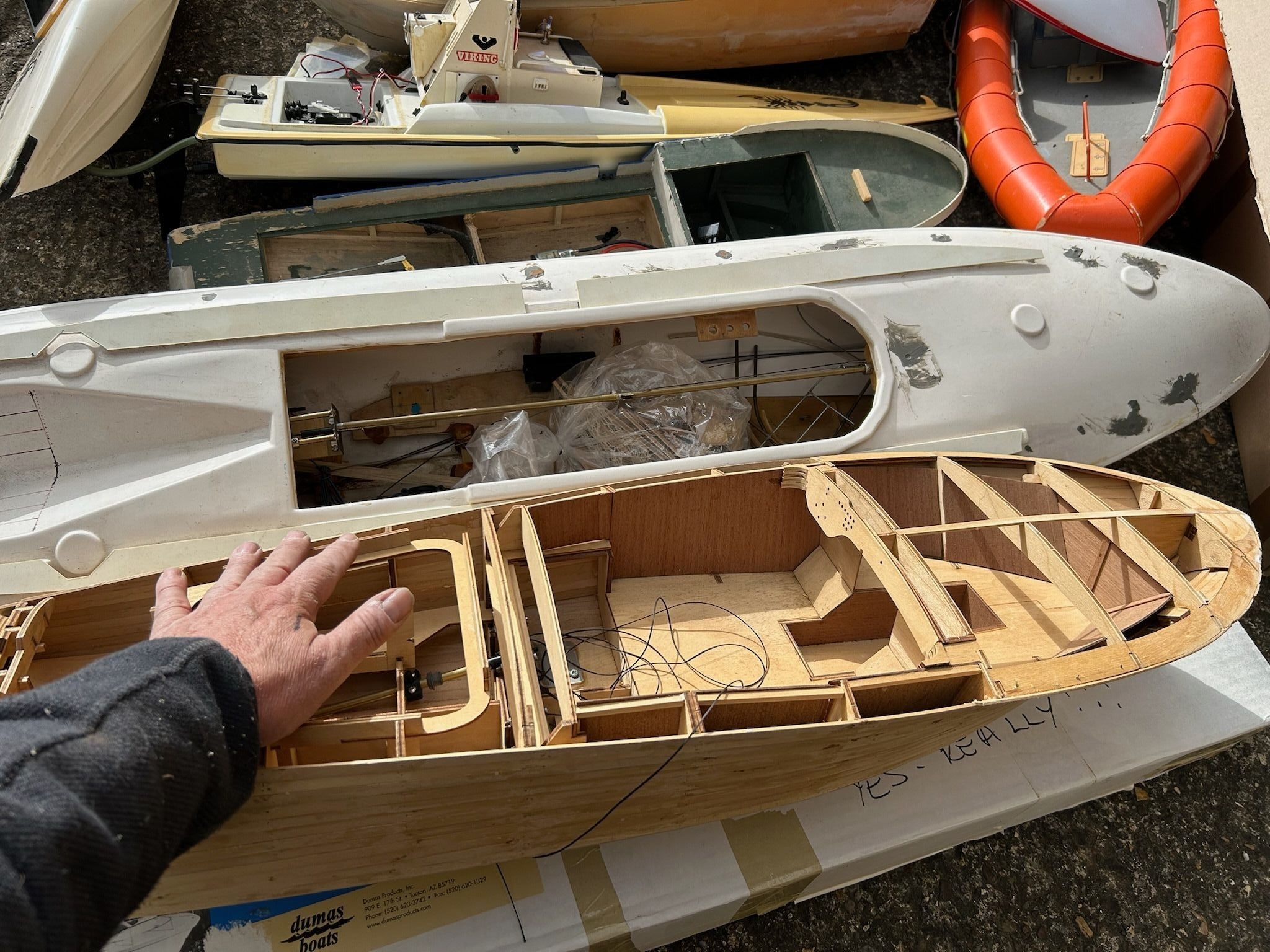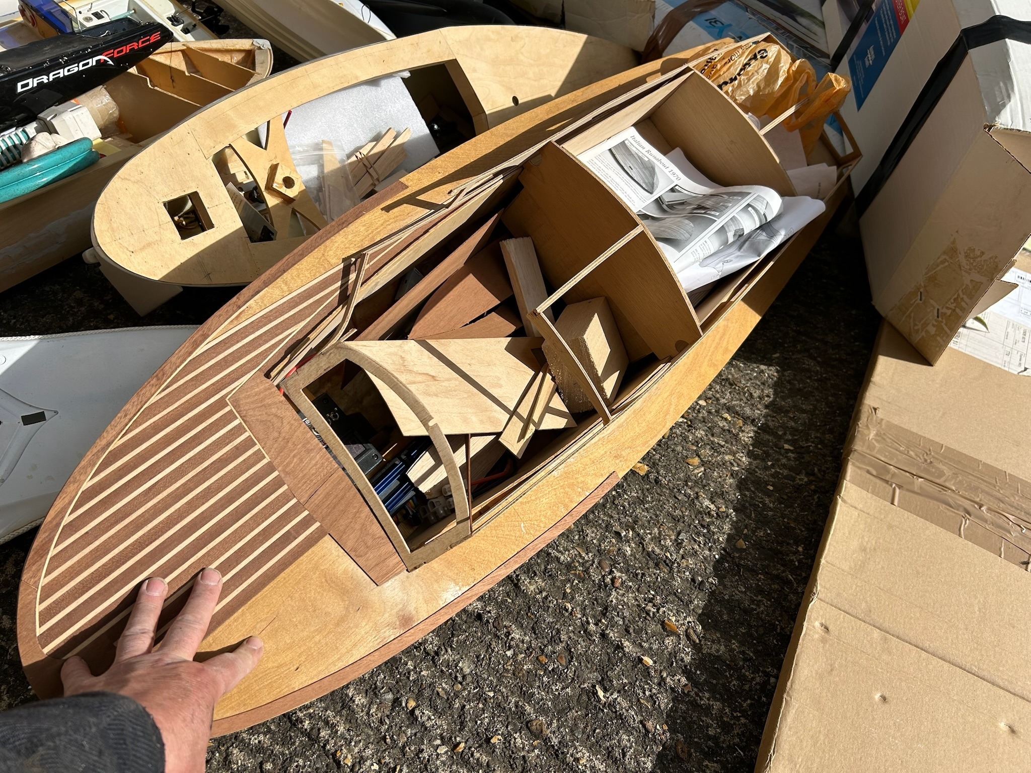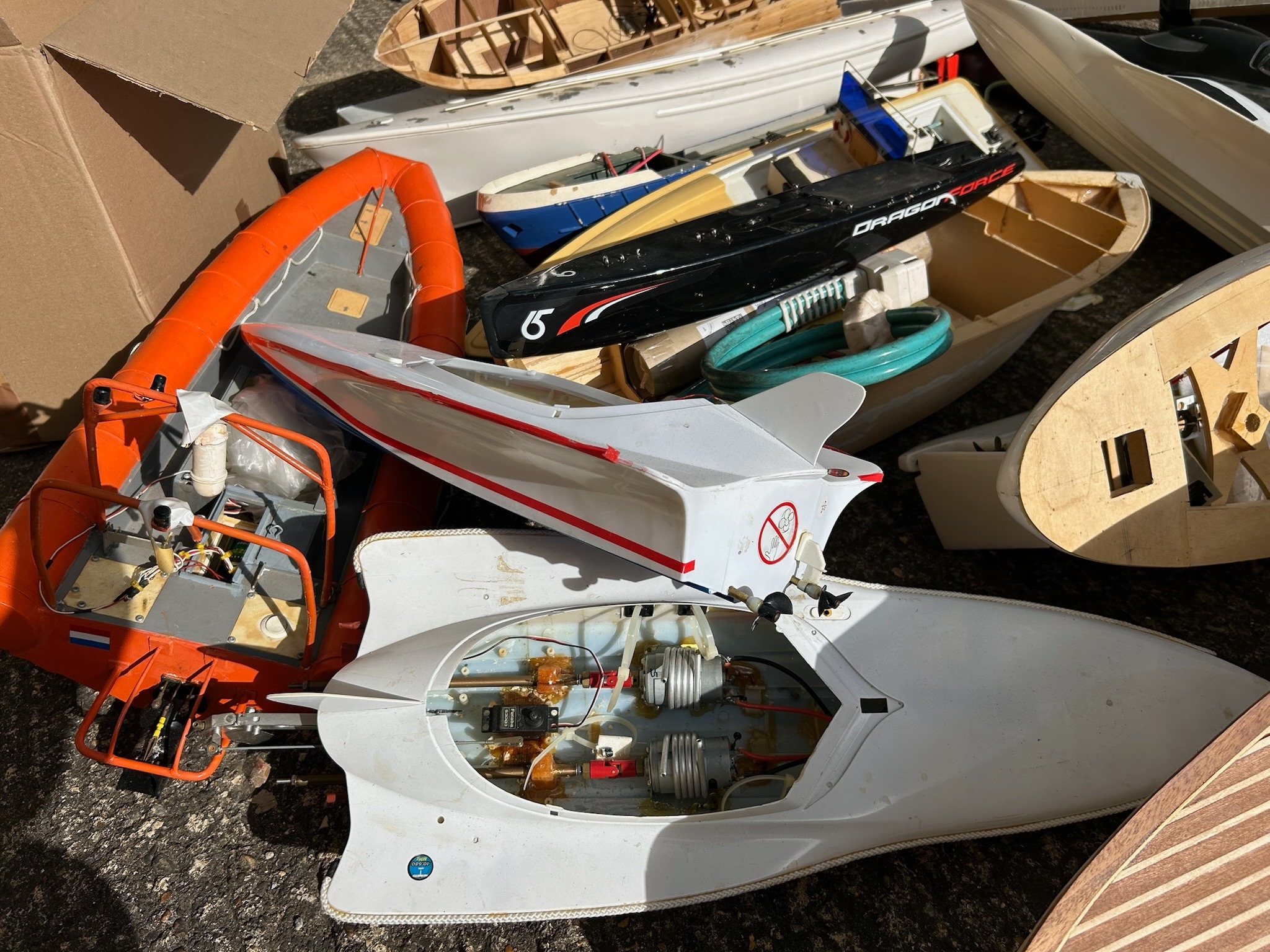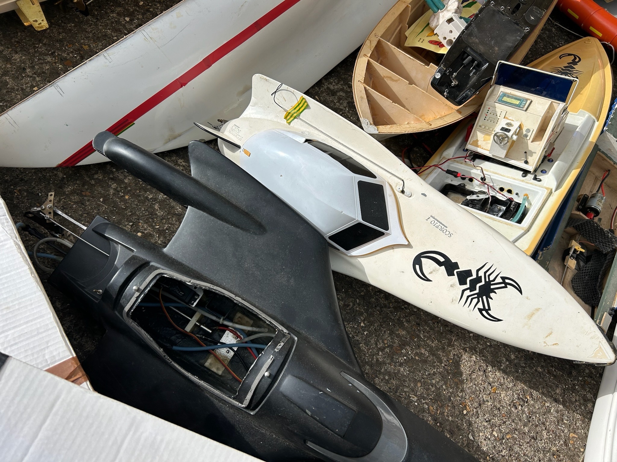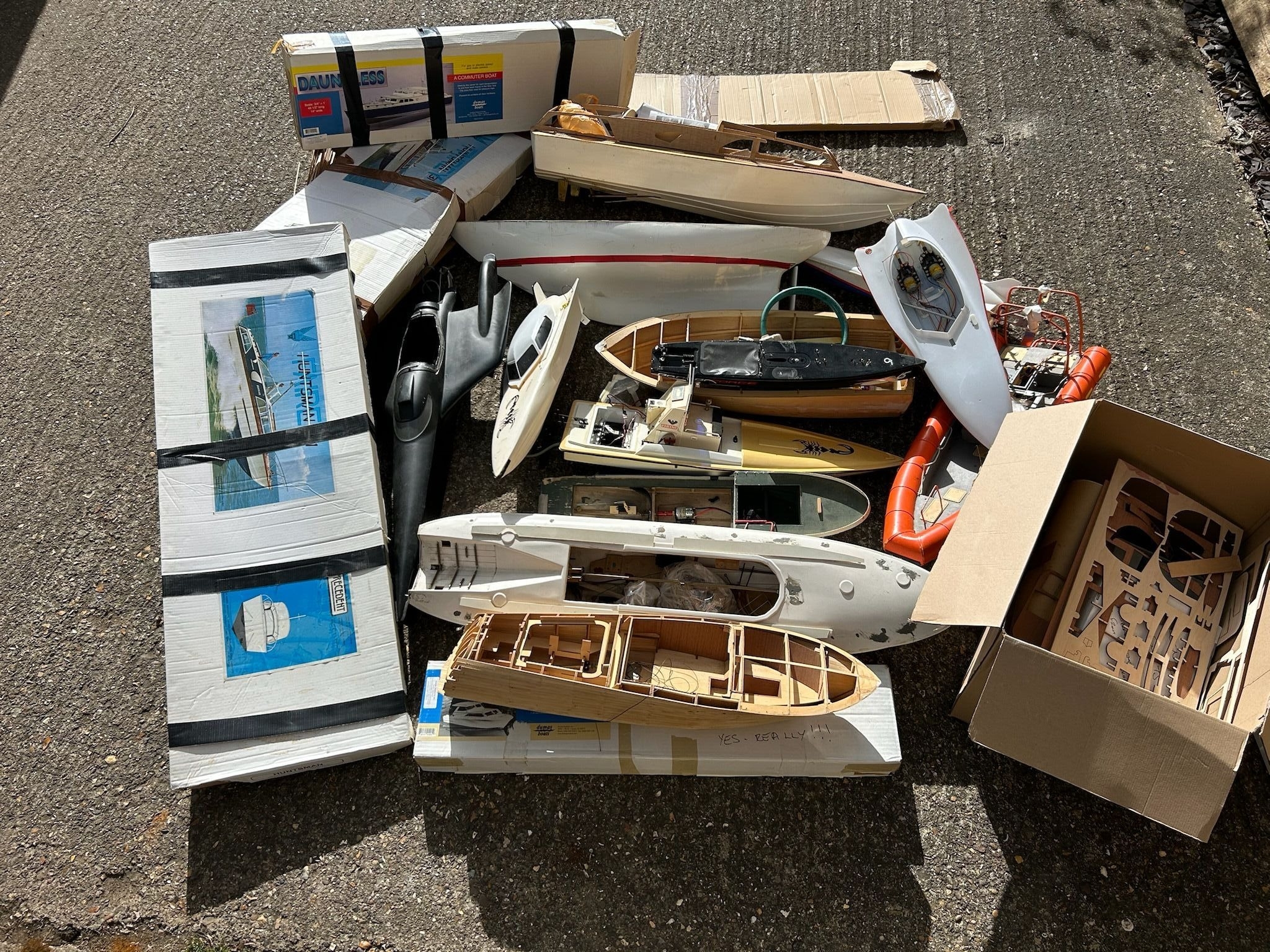 Substantial quantity of remote control boats in various stages of build, wooden and plastic hulled some with motors and complete with wood parts etc