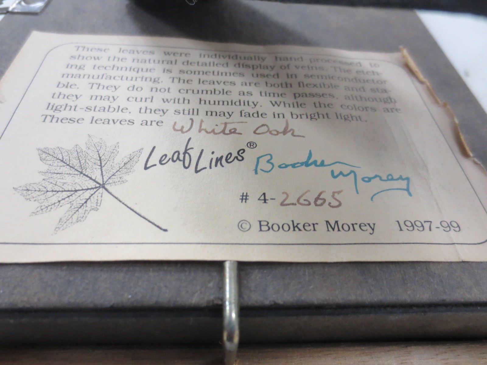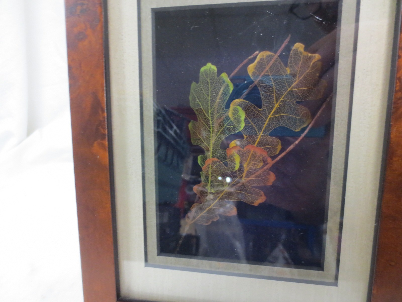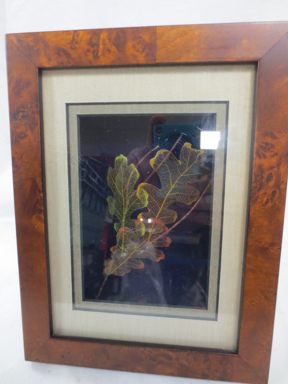 A framed and glazed set of 'Leaf Lines' White Oak leaves reduced by hand to show the veins, interesting little item