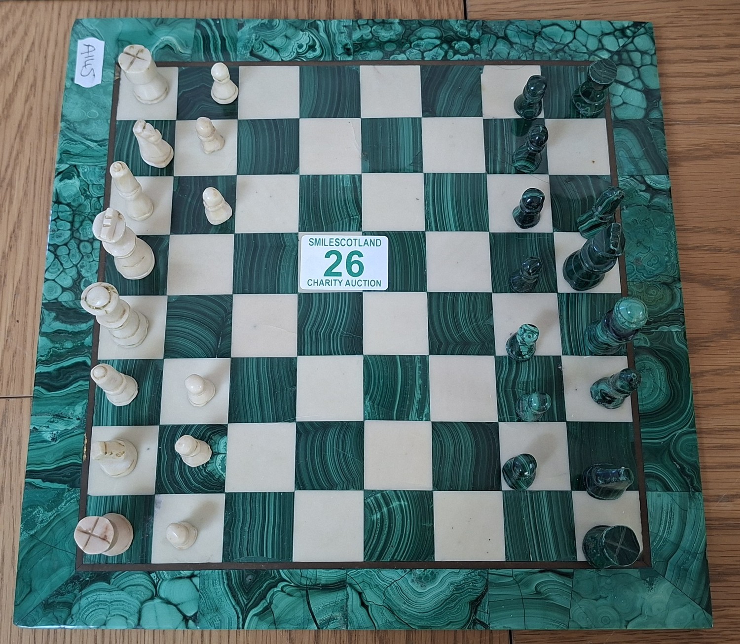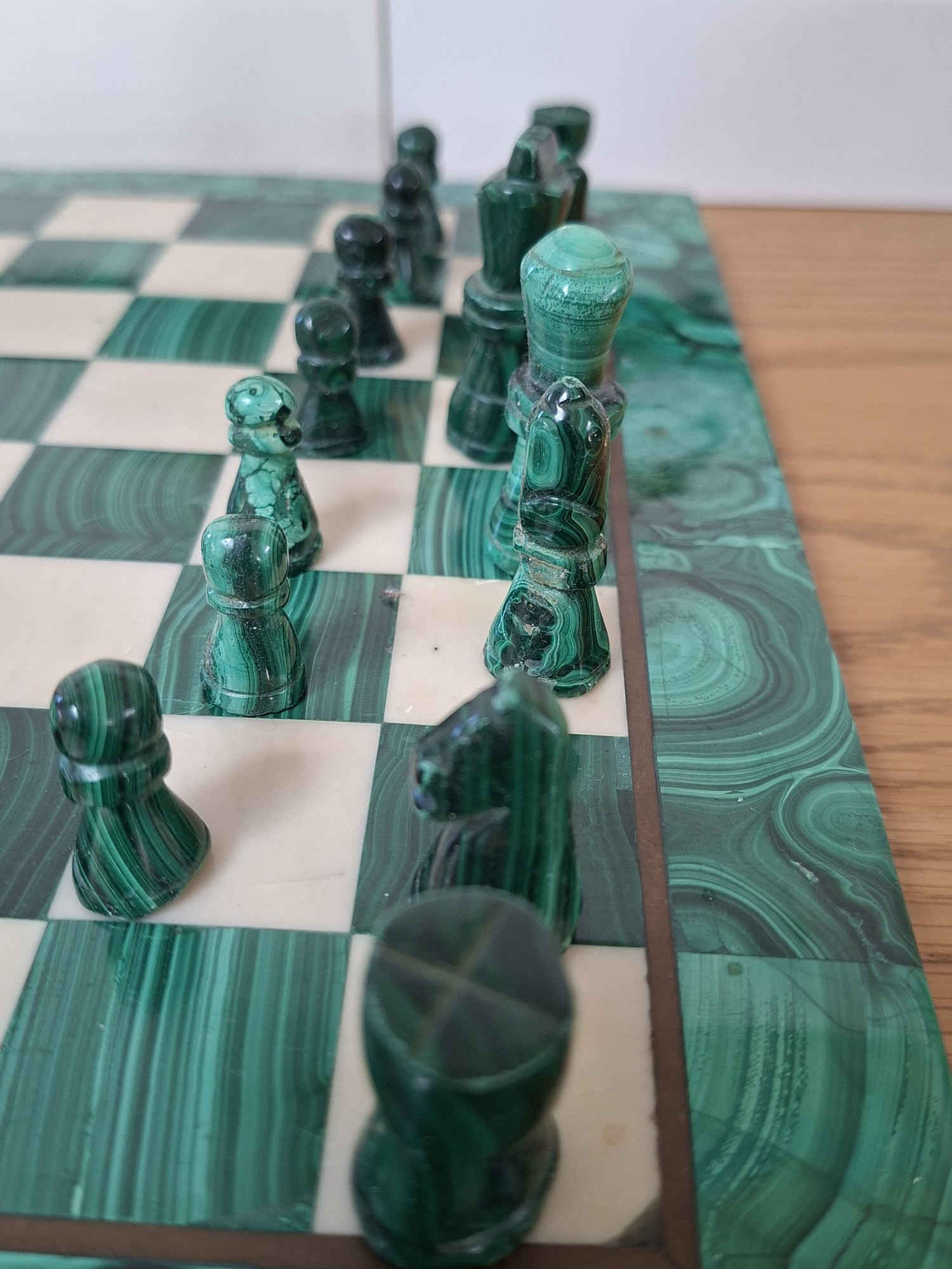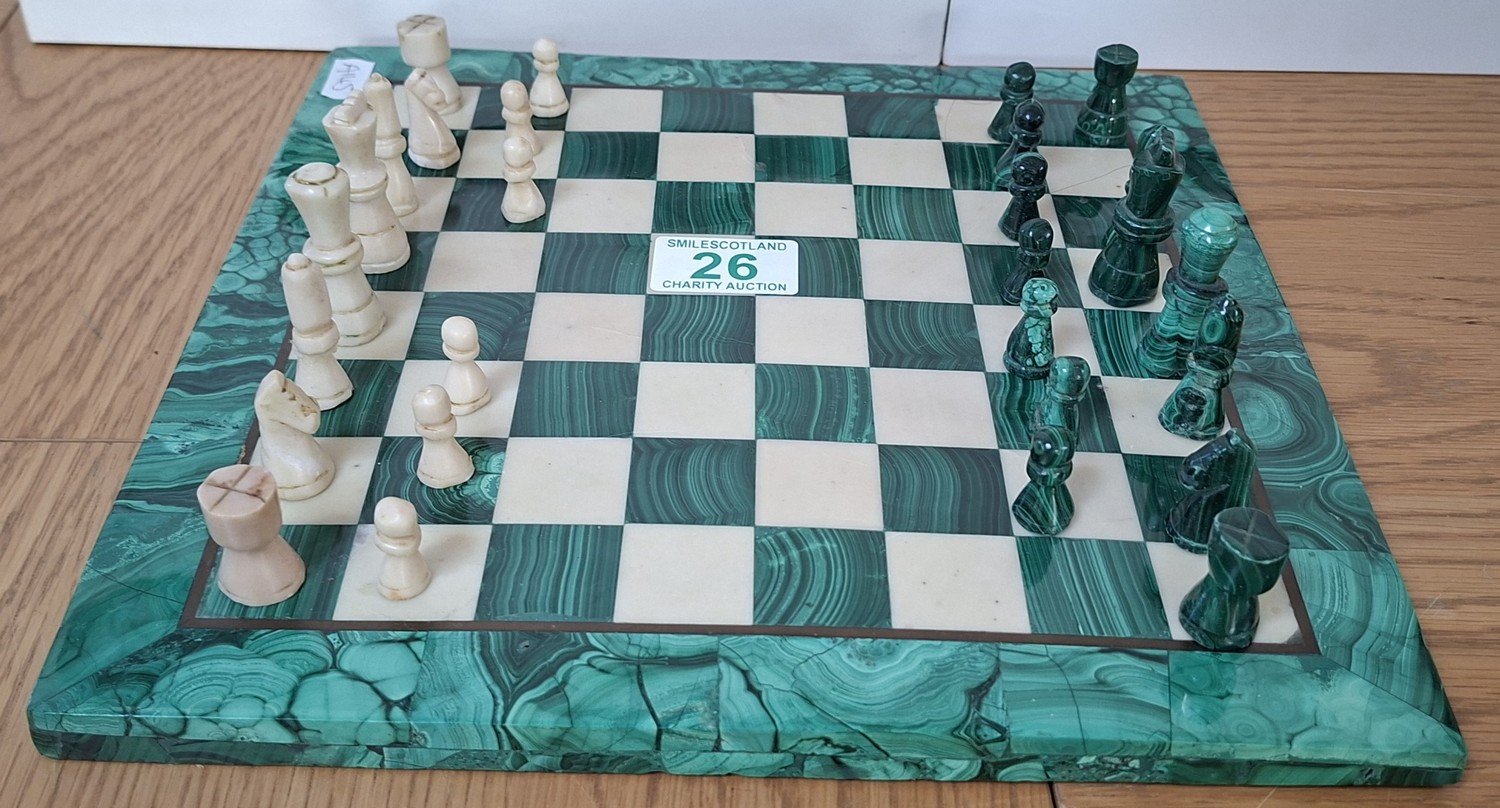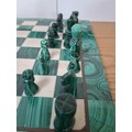 Malachite and marble chess set and pieces some missing 28cm² Approx.