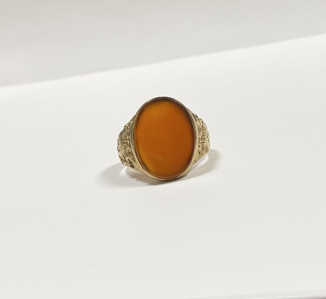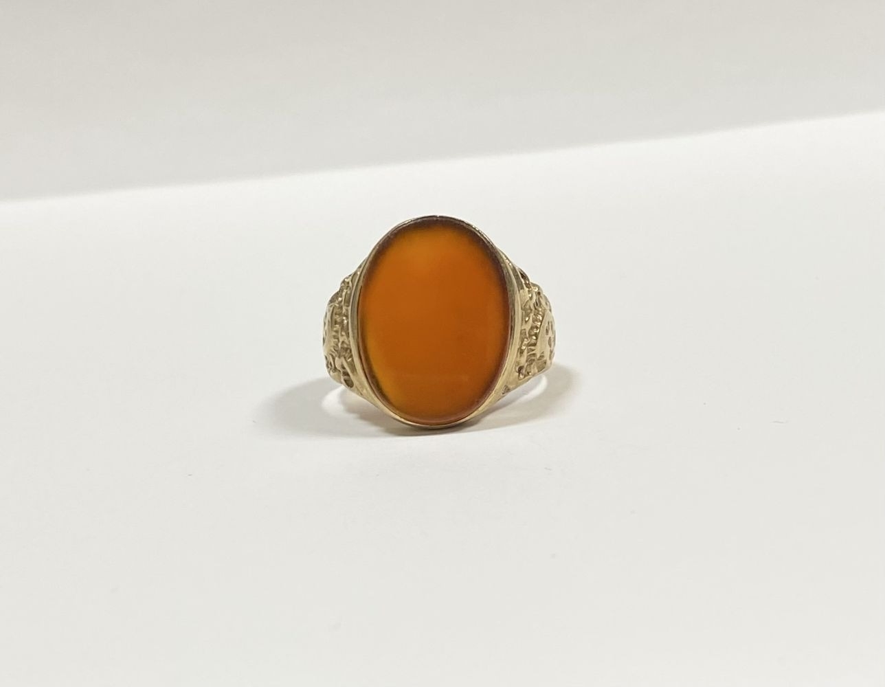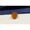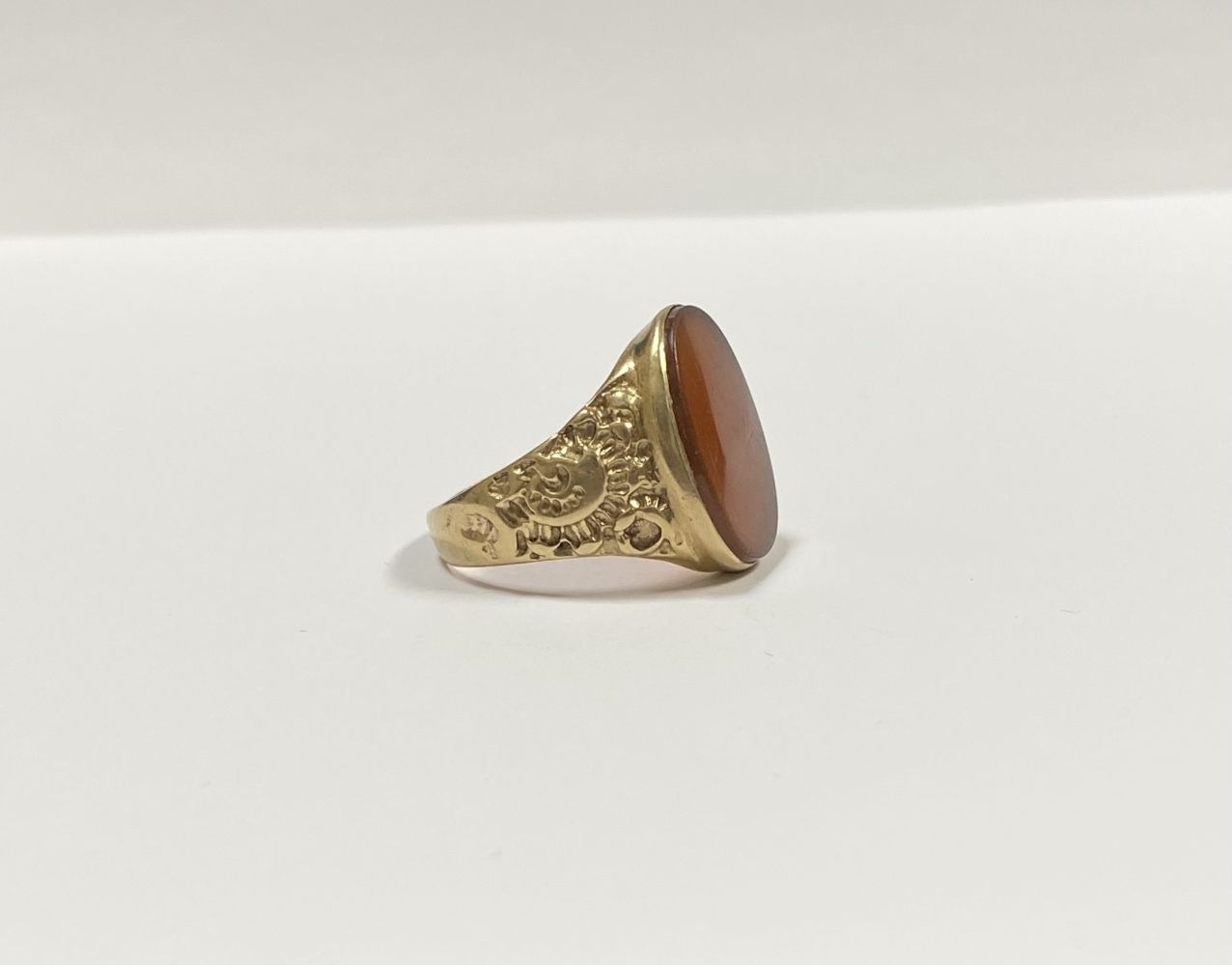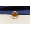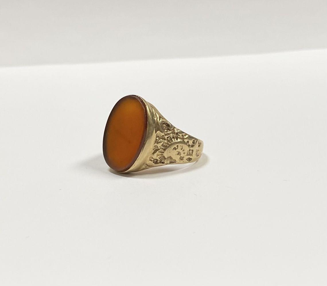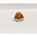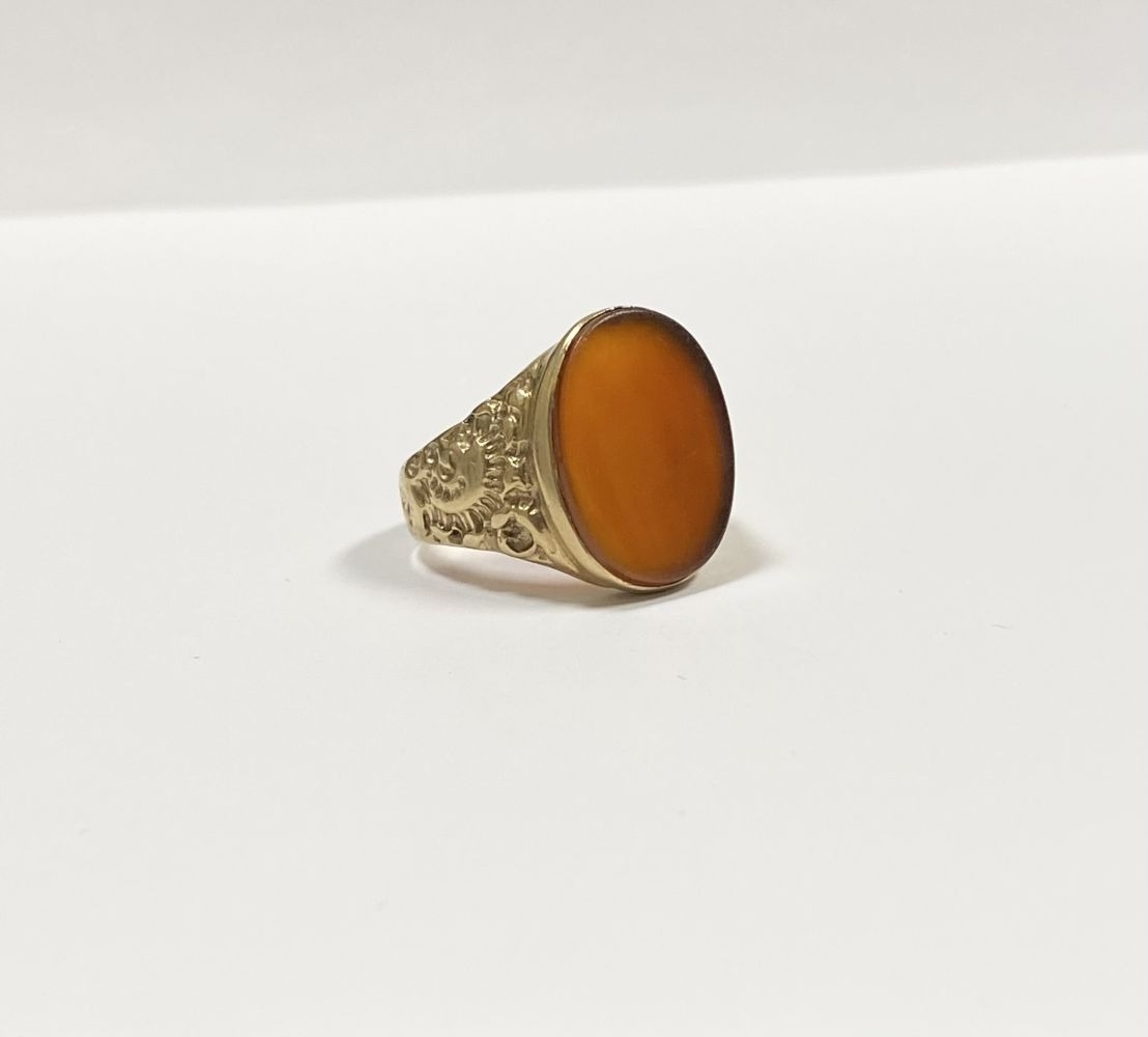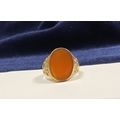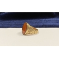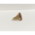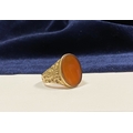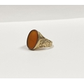 A REALLY BEAUTIFUL 9CT YELLOW GOLD CARNELIAN SIGNET RING, with central large oval cut Carnelian, in bezel setting, the tapered shoulders with highly decorative scrolling designs. Hallmarked to interior band 9ct, 375, with Makers marks. Ring size: T approx.