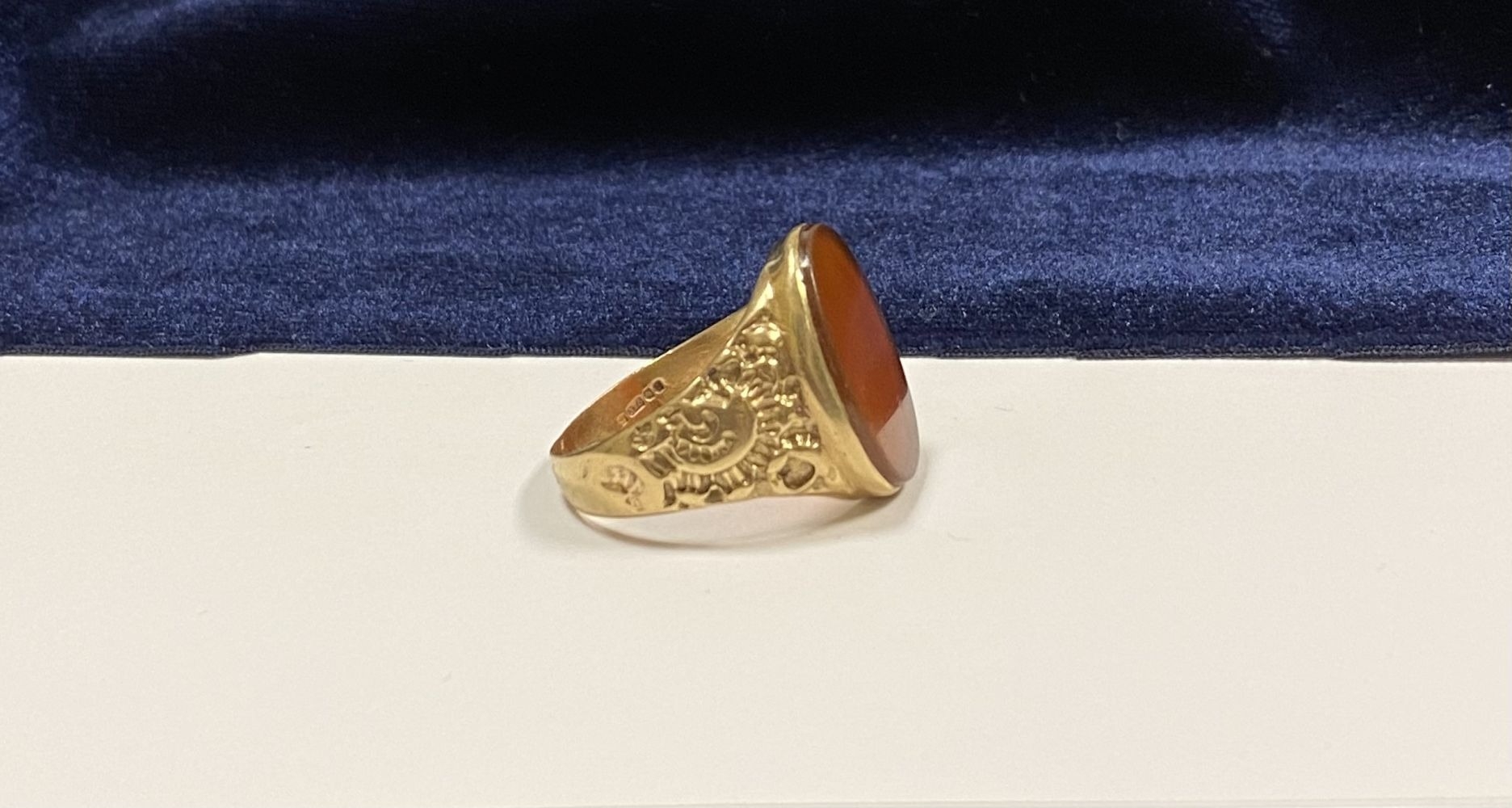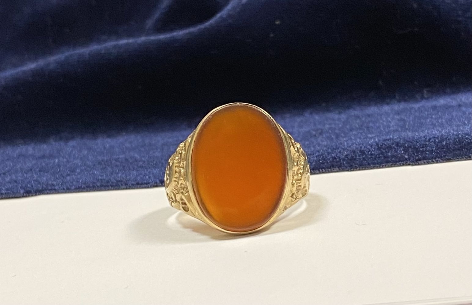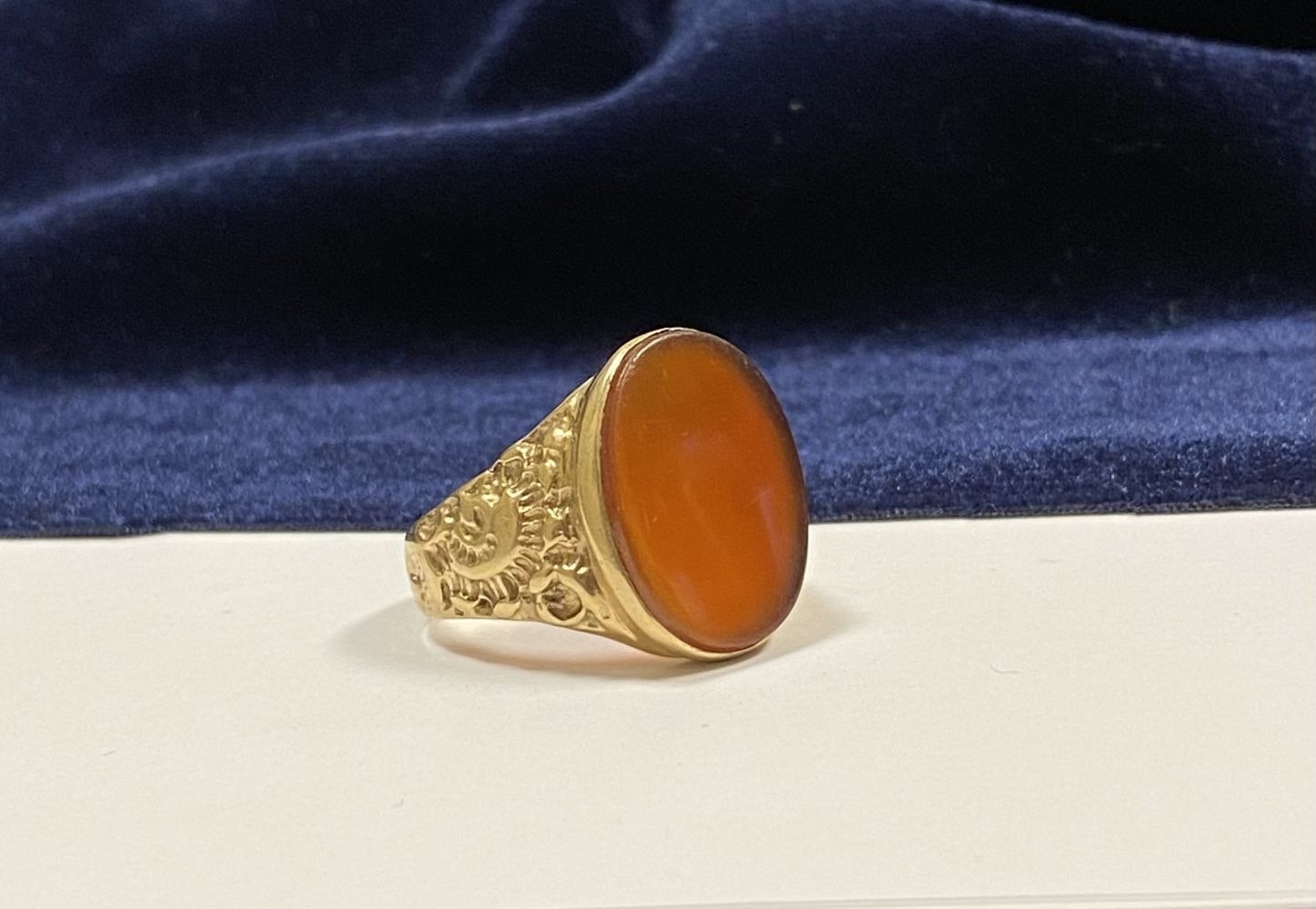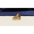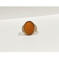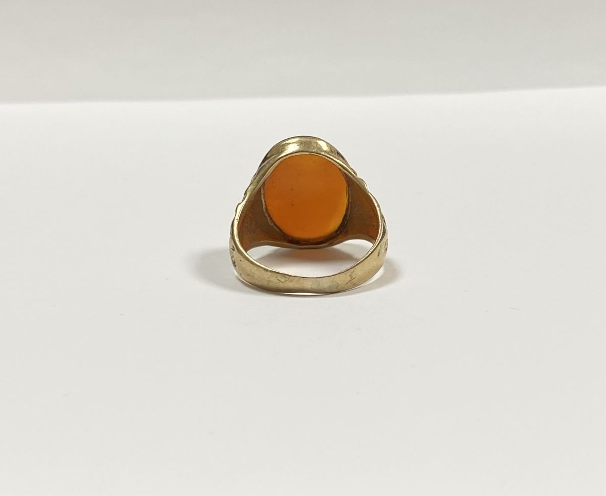 A REALLY BEAUTIFUL 9CT YELLOW GOLD CARNELIAN SIGNET RING, with central large oval cut Carnelian, in bezel setting, the tapered shoulders with highly decorative scrolling designs. Hallmarked to interior band 9ct, 375, with Makers marks. Ring size: T approx.