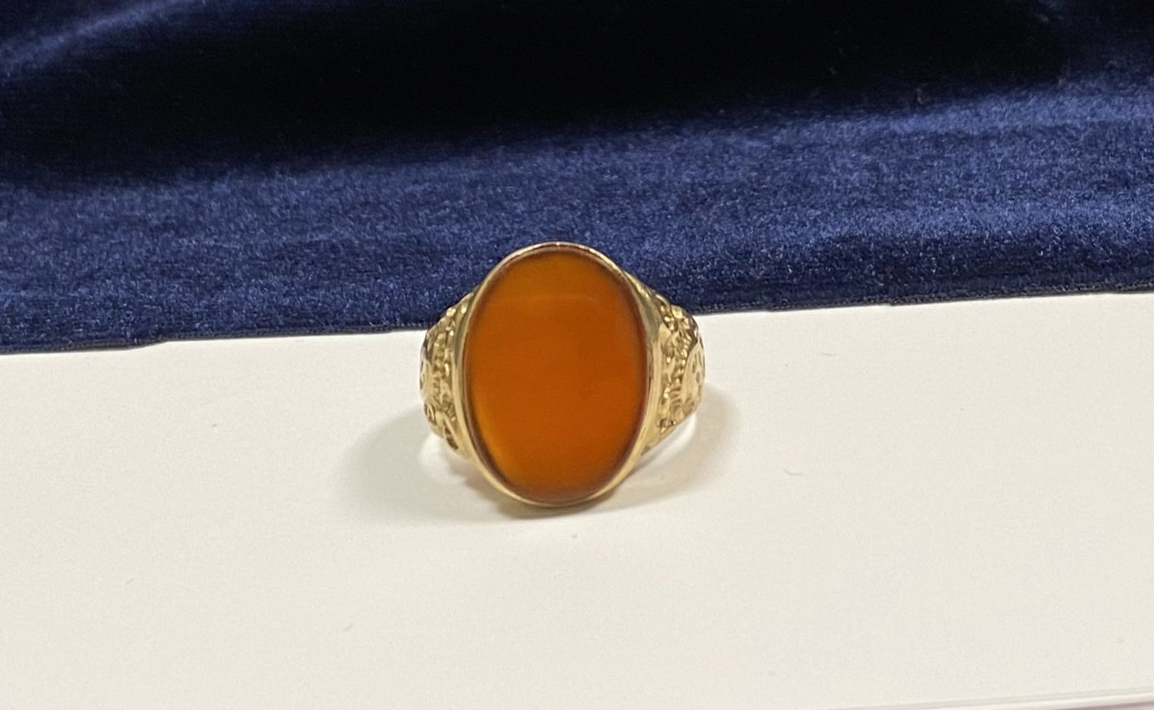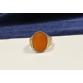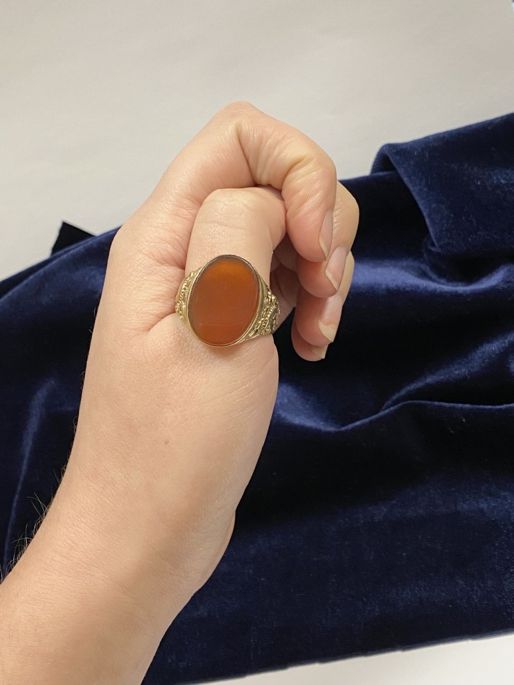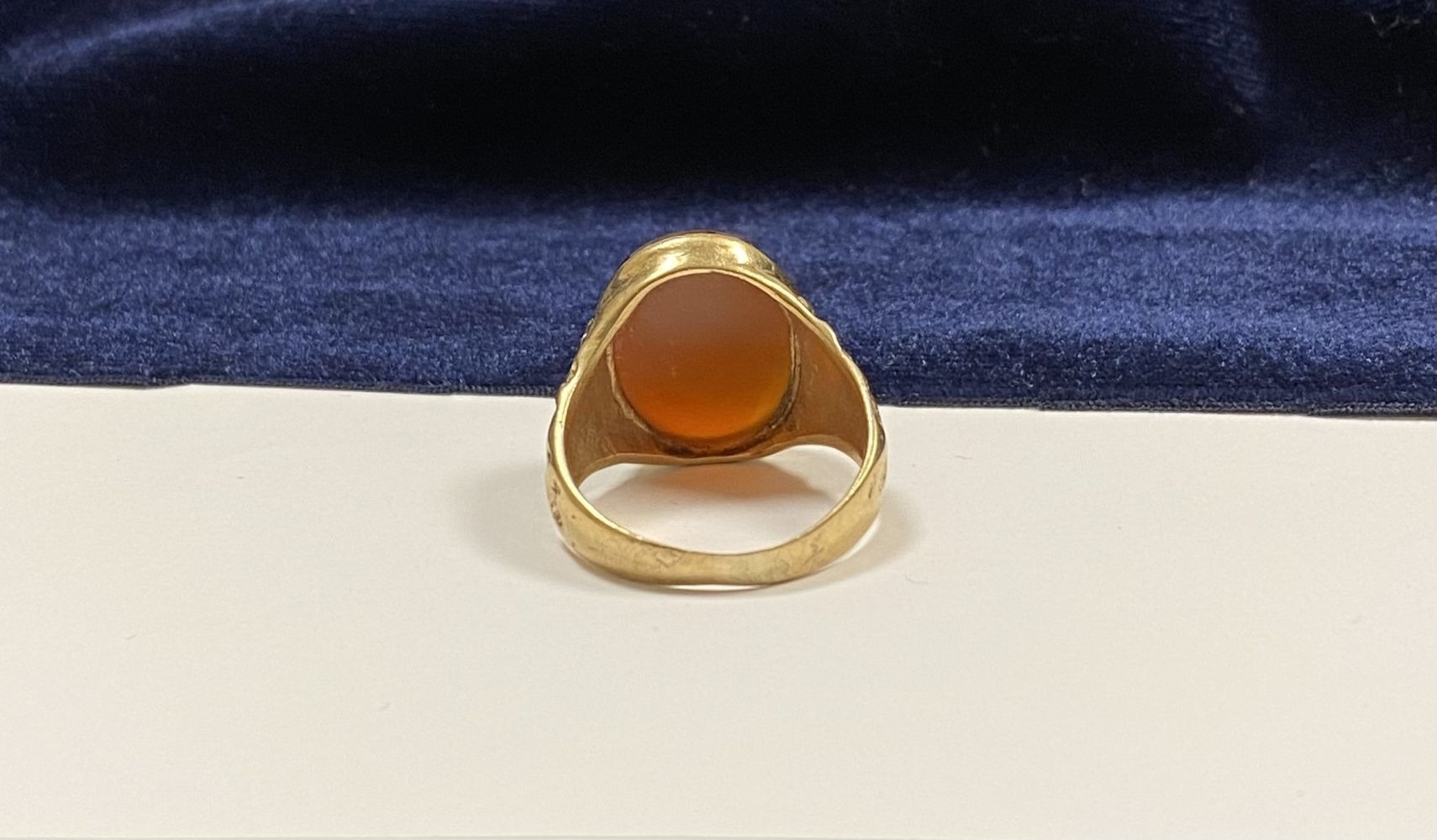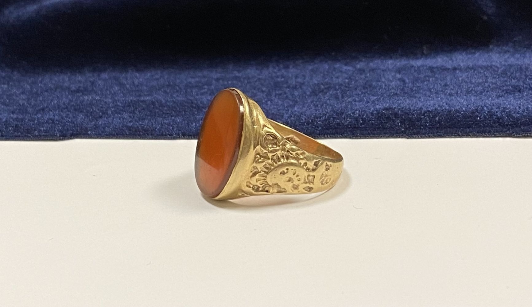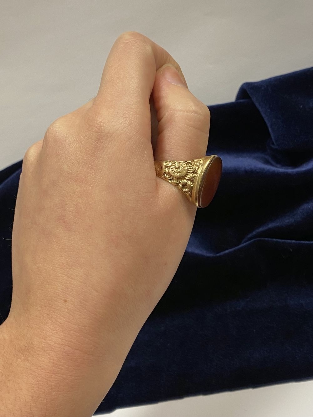 A REALLY BEAUTIFUL 9CT YELLOW GOLD CARNELIAN SIGNET RING, with central large oval cut Carnelian, in bezel setting, the tapered shoulders with highly decorative scrolling designs. Hallmarked to interior band 9ct, 375, with Makers marks. Ring size: T approx.