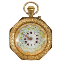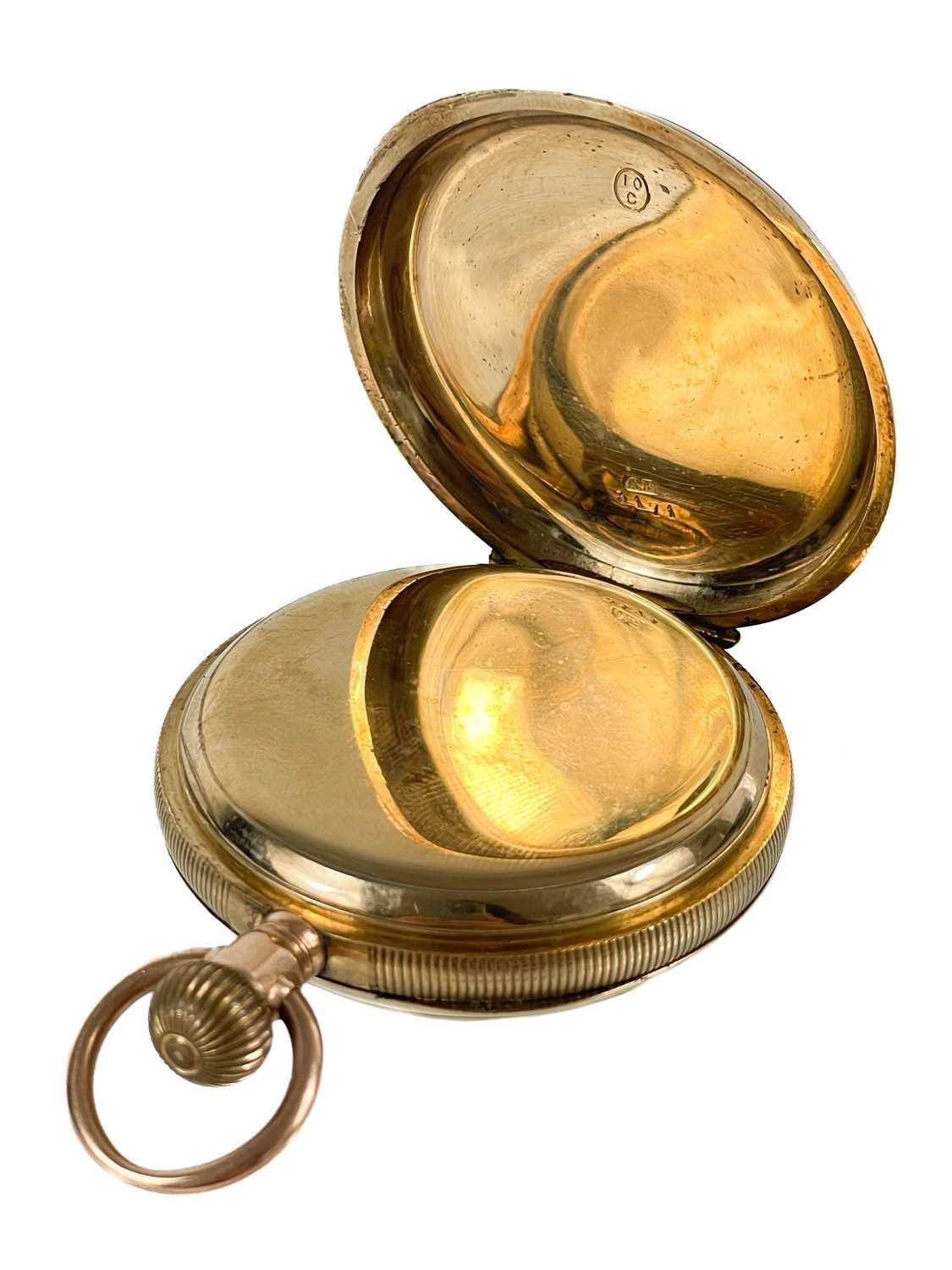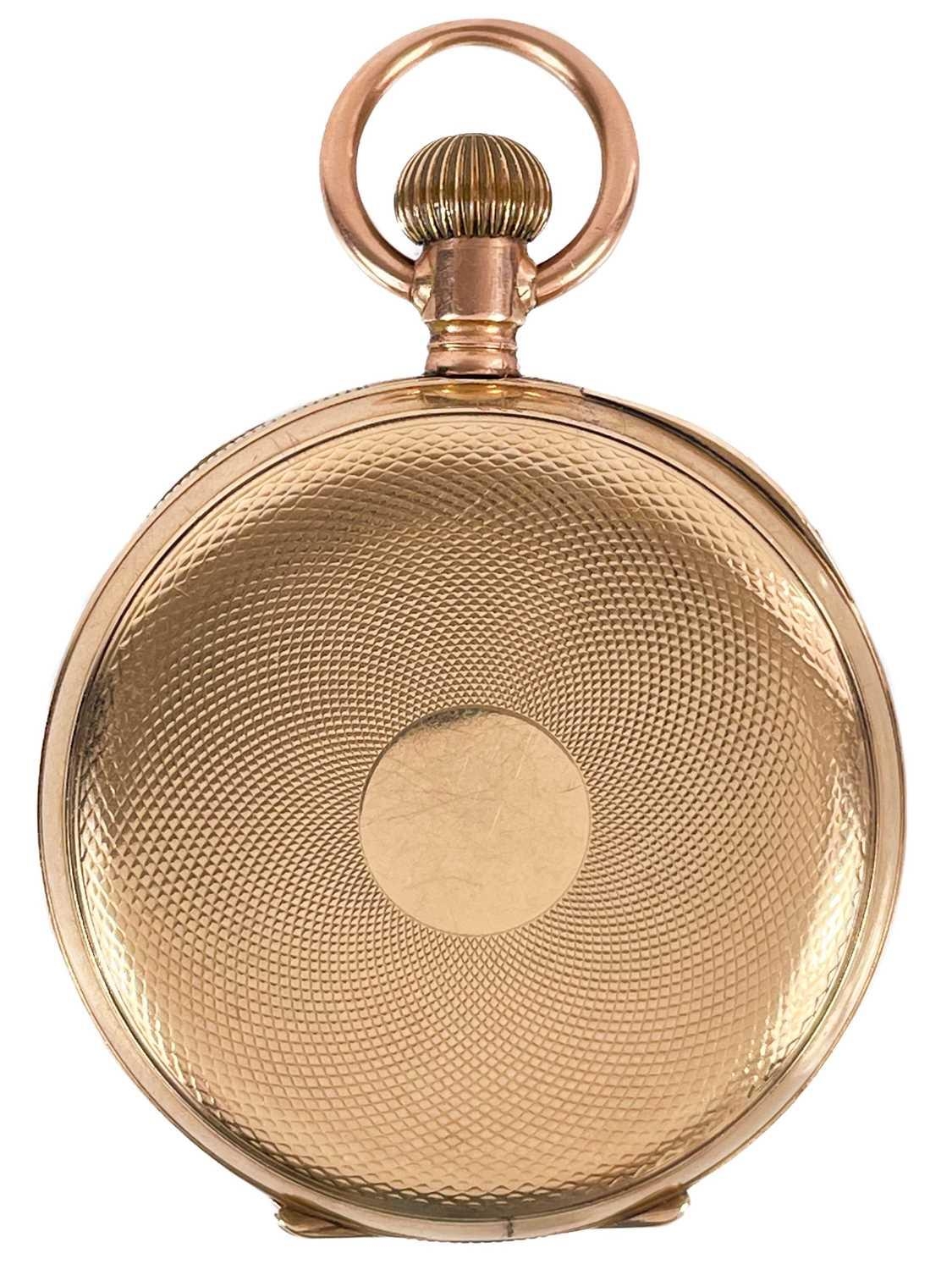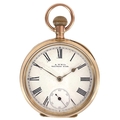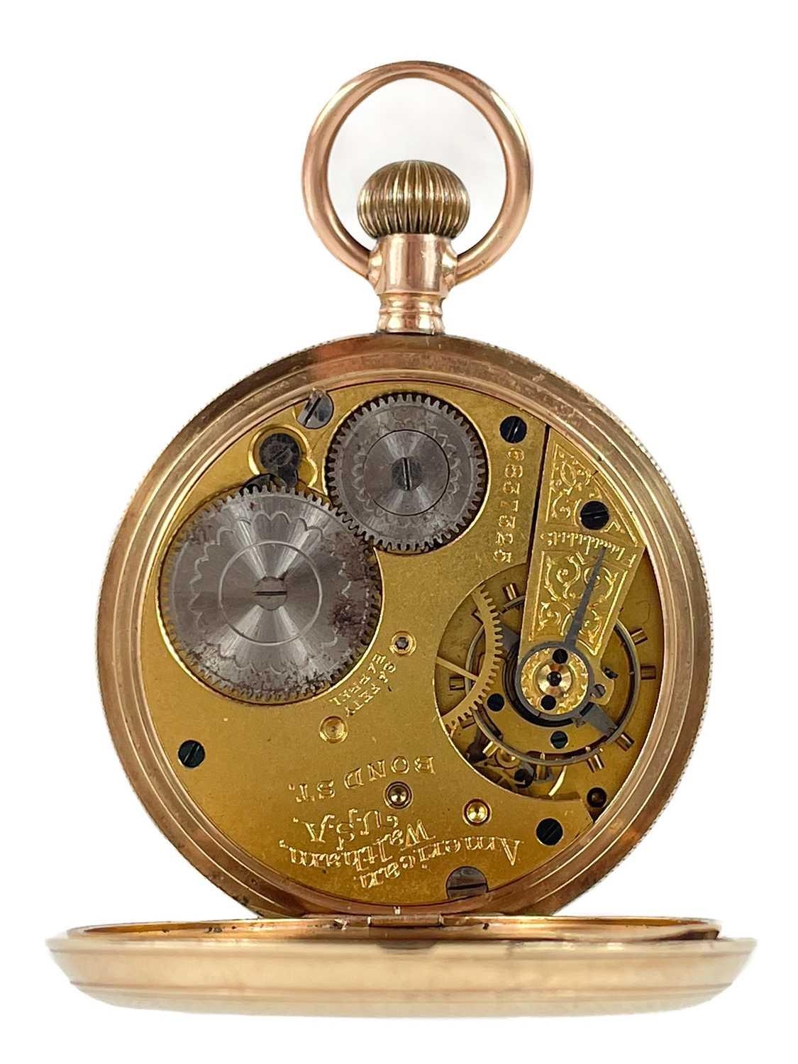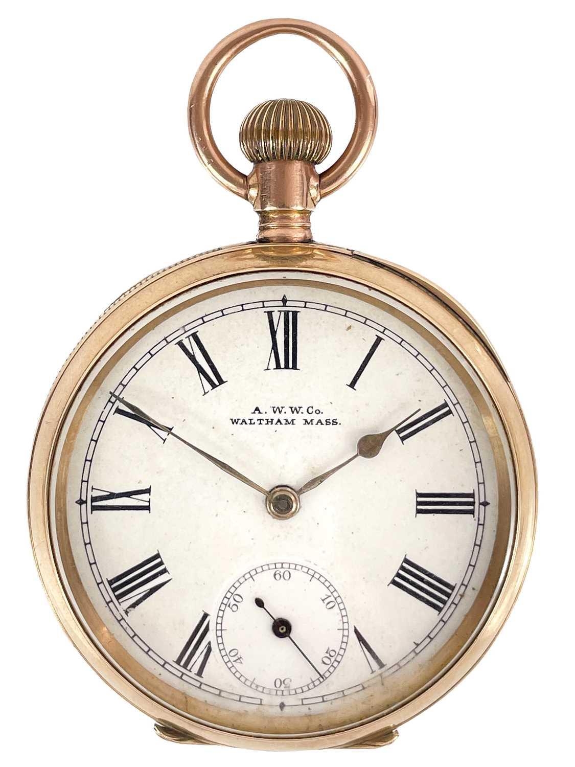 A Waltham 10ct rose gold crown wind lever pocket watch. The signed 40mm white enamel dial with Roman numerals and subsidiary seconds dial, the movement signed and numbered 6837325 and with safety barrel, the engine turned case and cuvette stamped 10C AB 3171, case 48mm, 86.2g. Winds but doesn't appear to run.