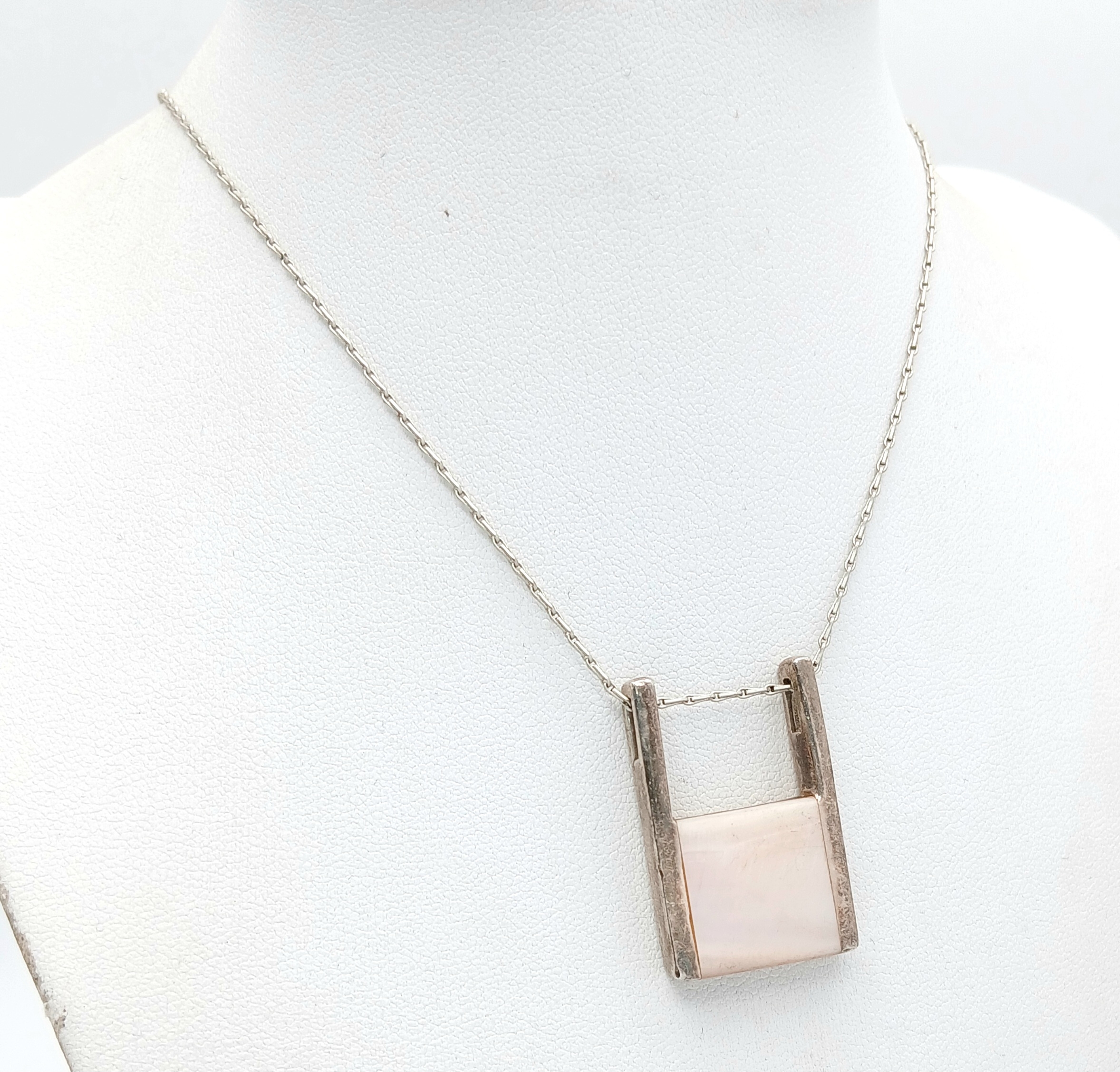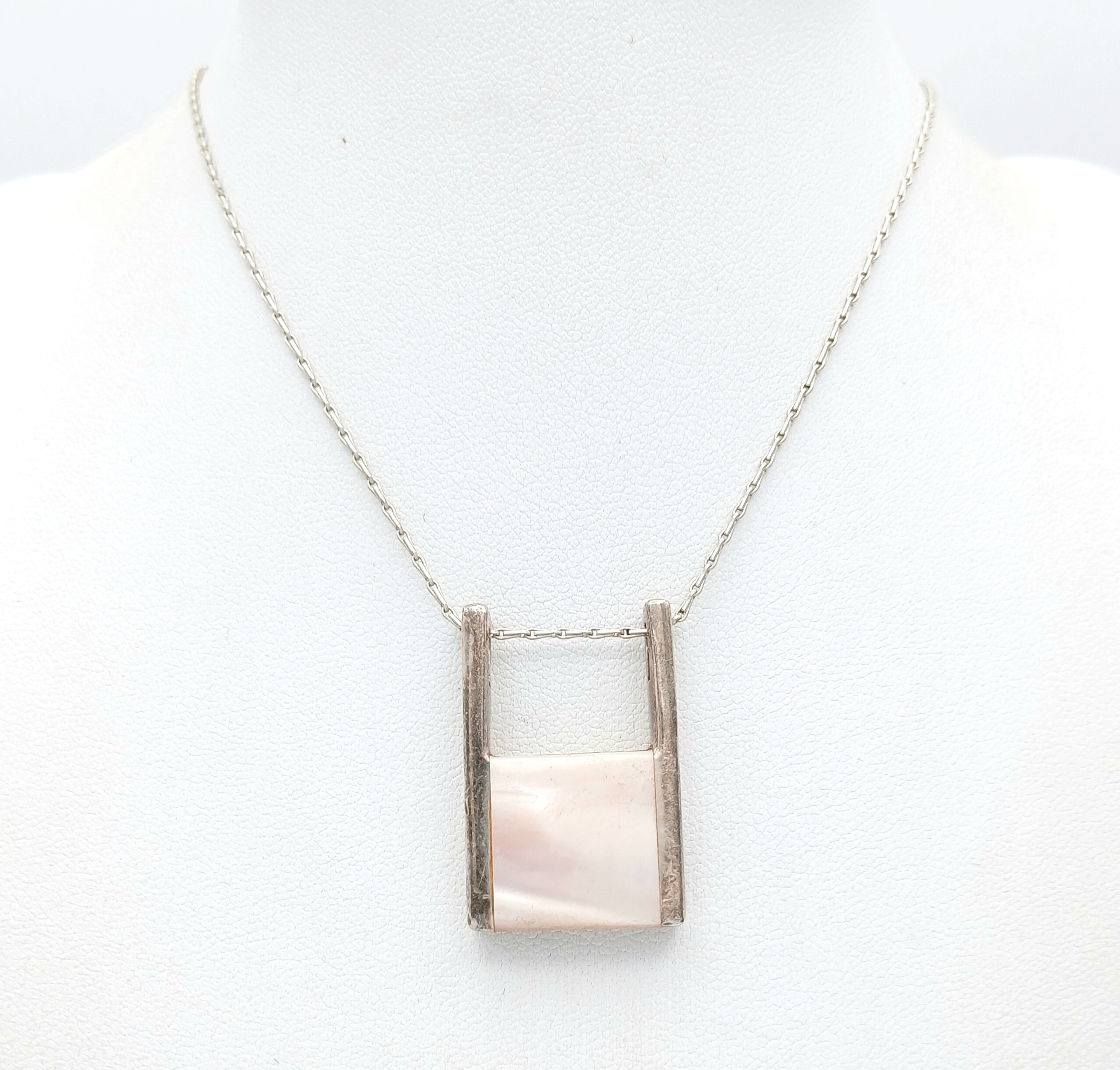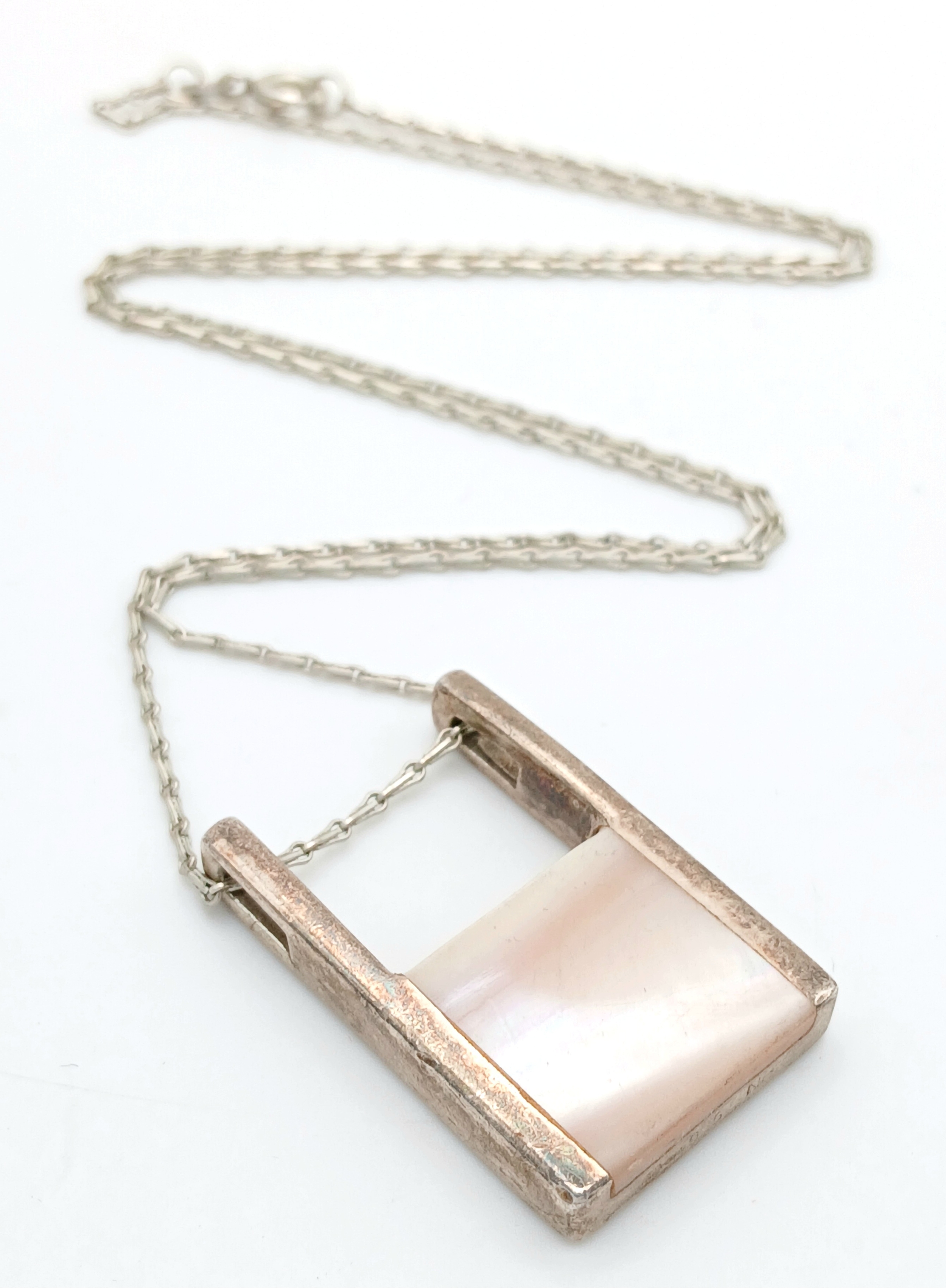 A Sterling Silver Mother of Pearl Pendant Necklace. Hallmarked 925, Approx. Length of a Necklace 49cm, Pendant 3cm x 2cm, Total Weight 10.95 Grams.