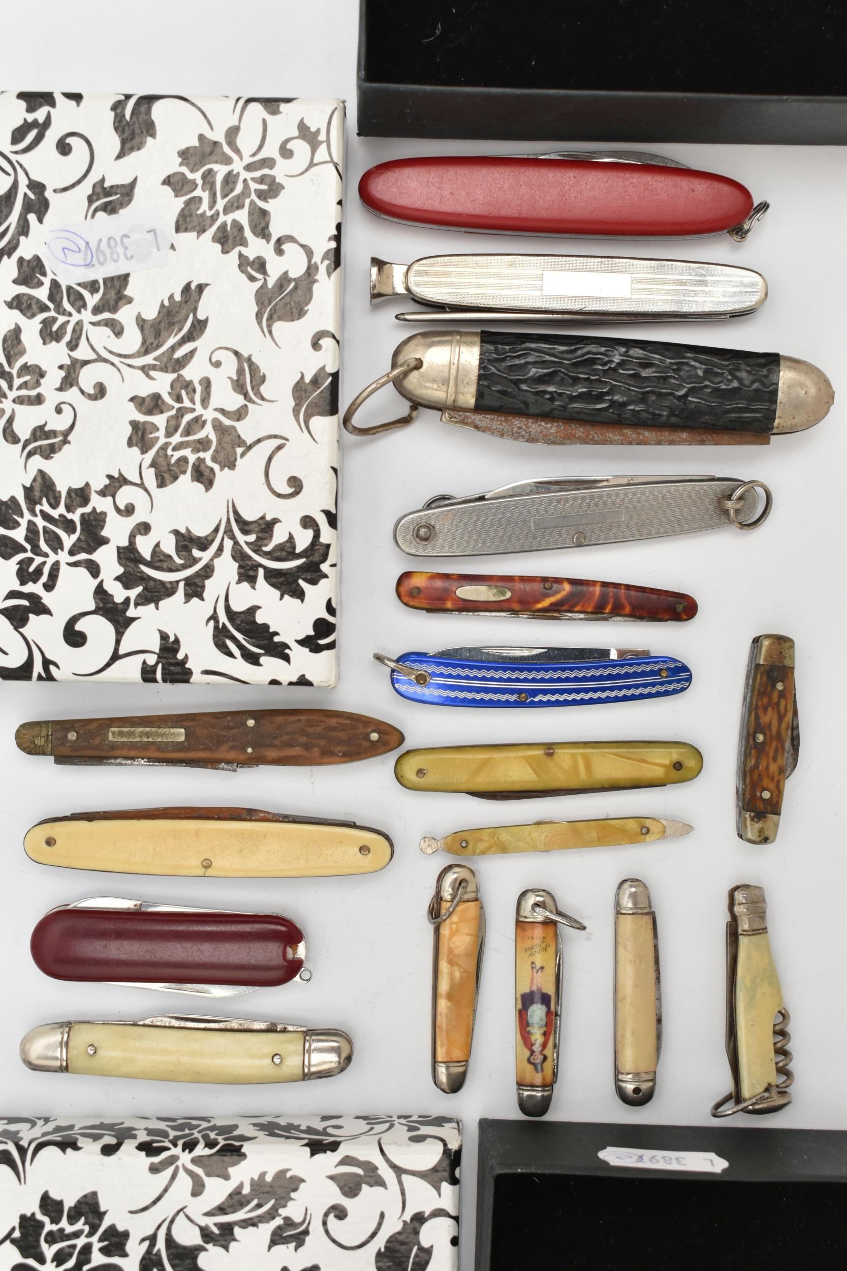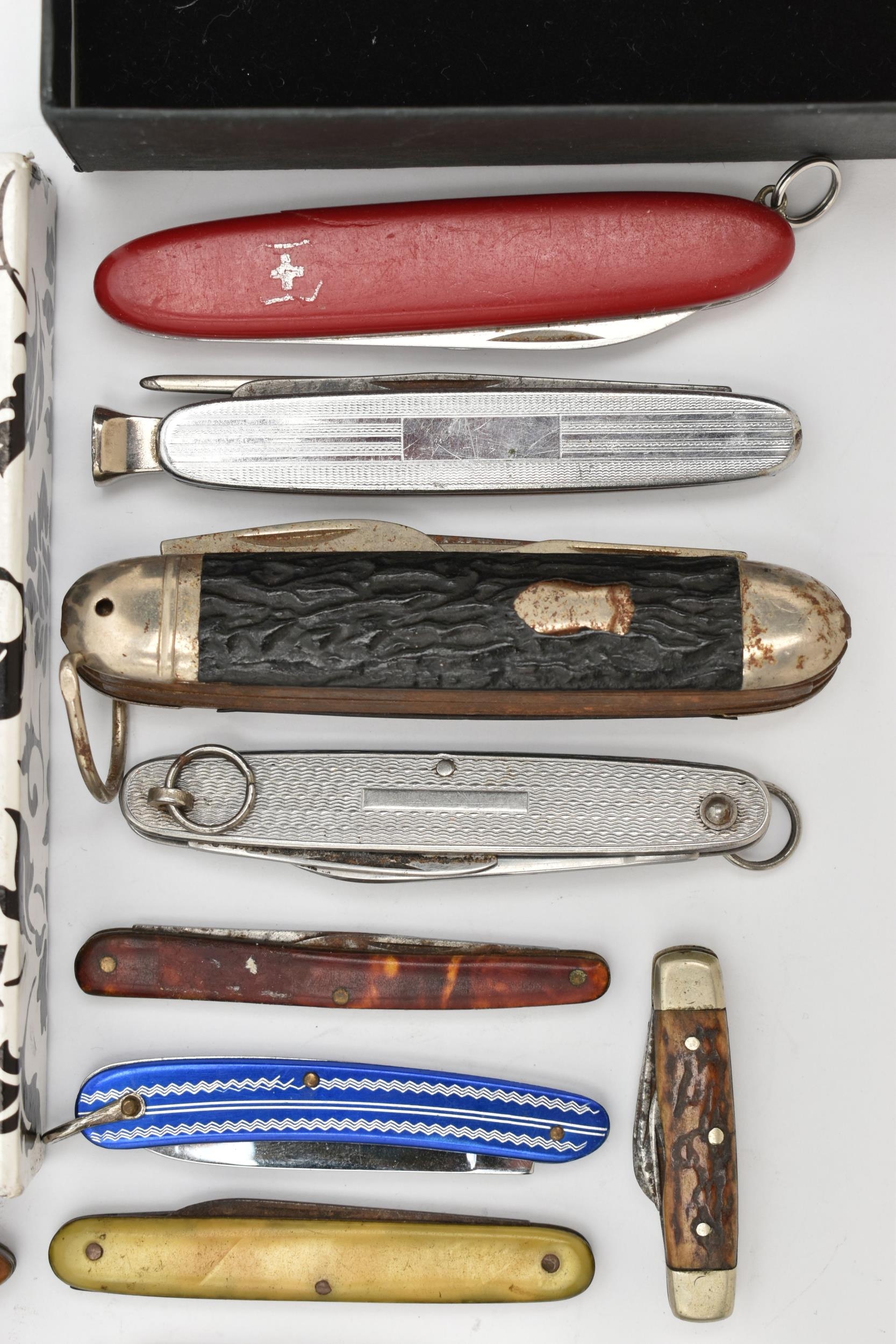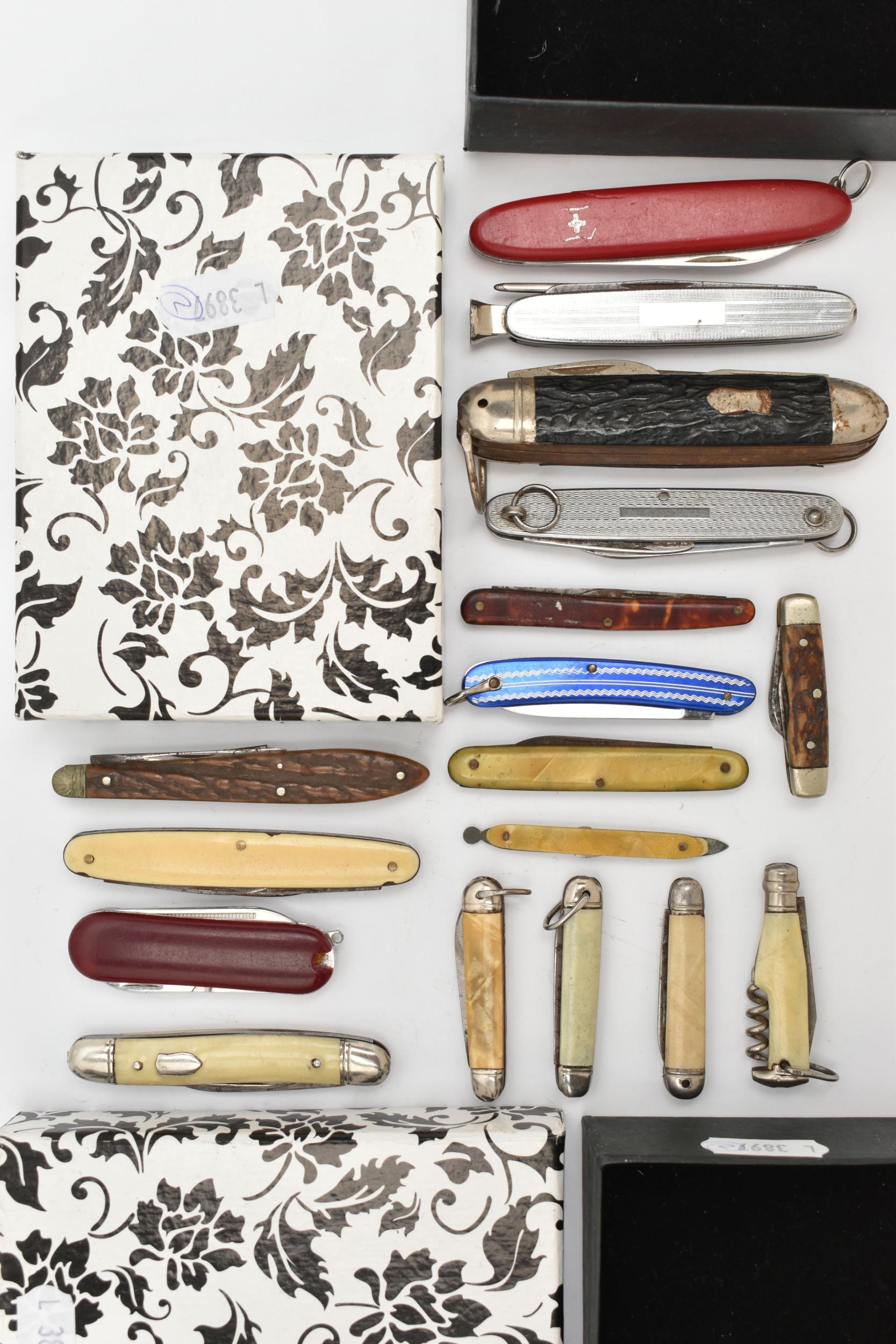 AN ASSORTMENT OF POCKET KNIVES, seventeen pocket knives, including a 'Victorinox' pocket knife (condition report: used conditions, general light wear)