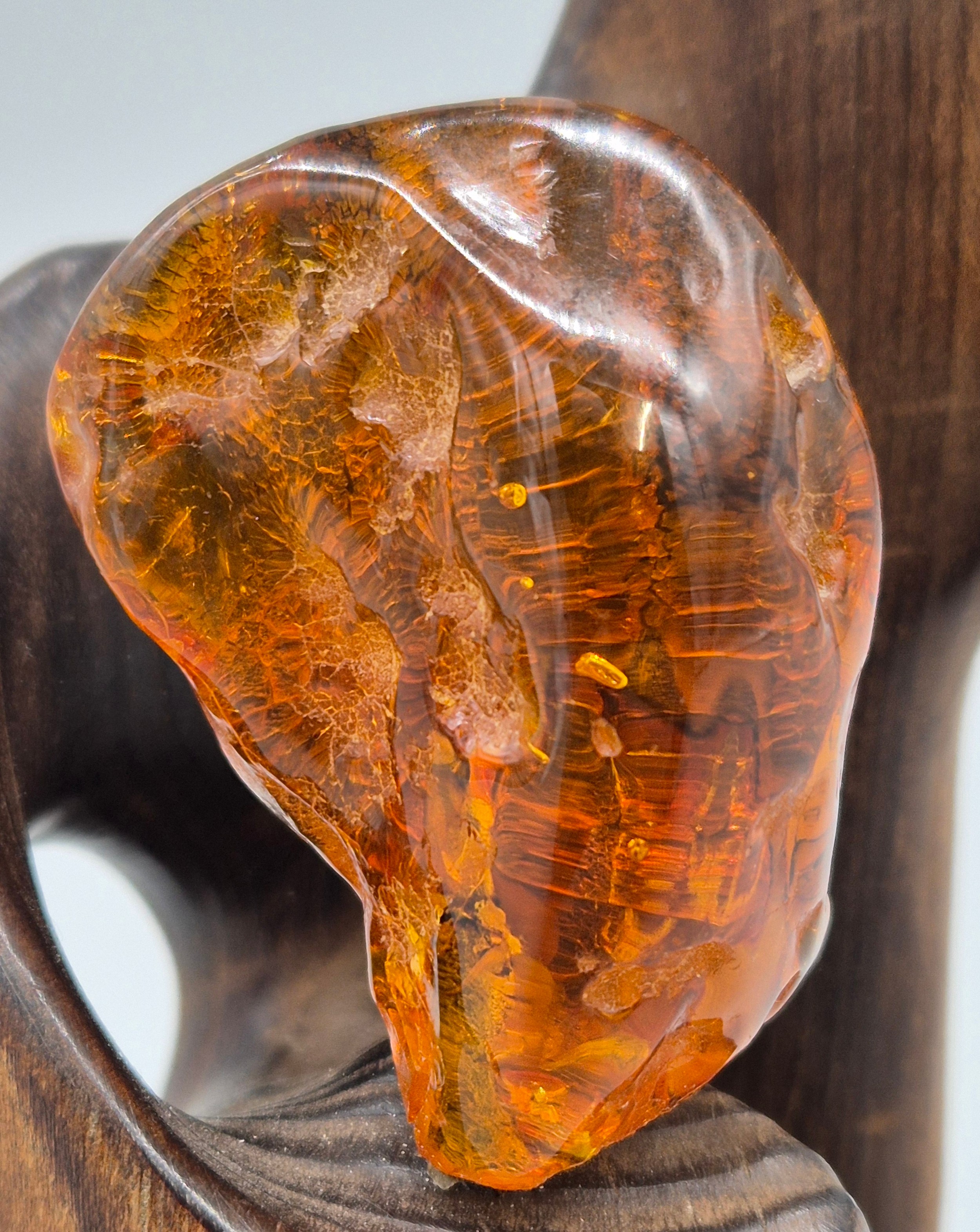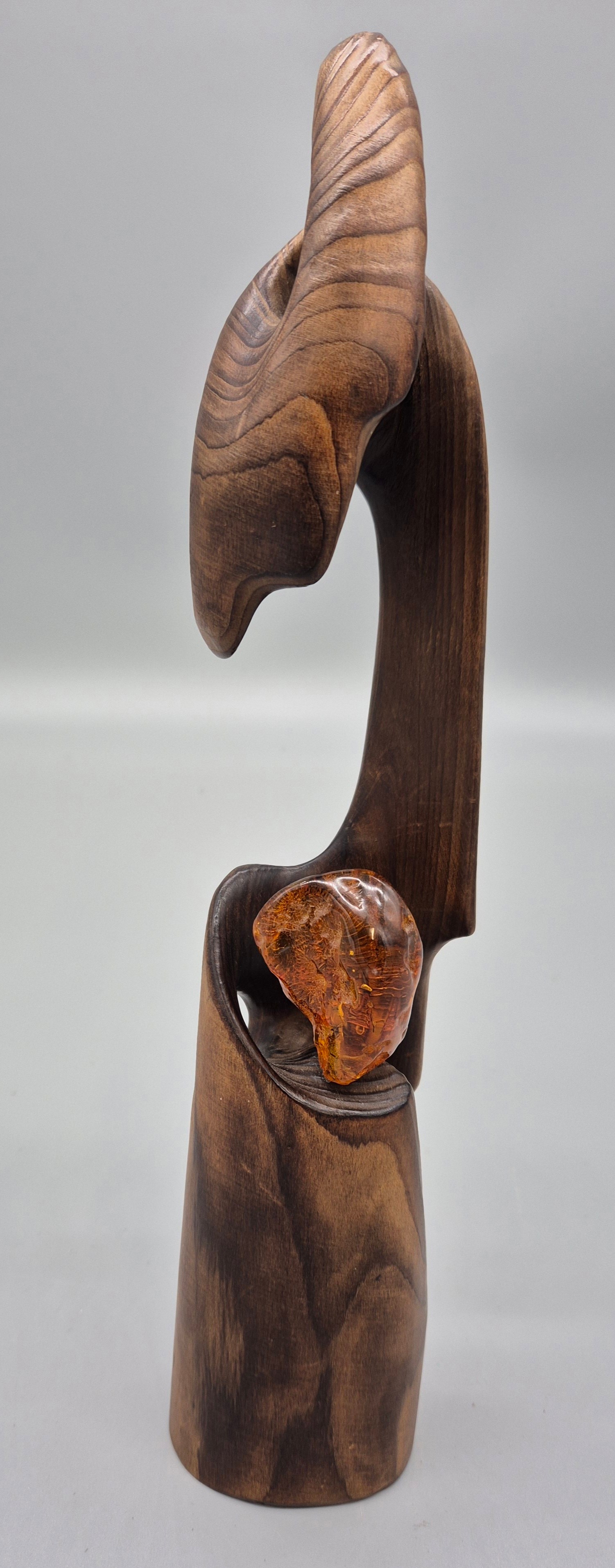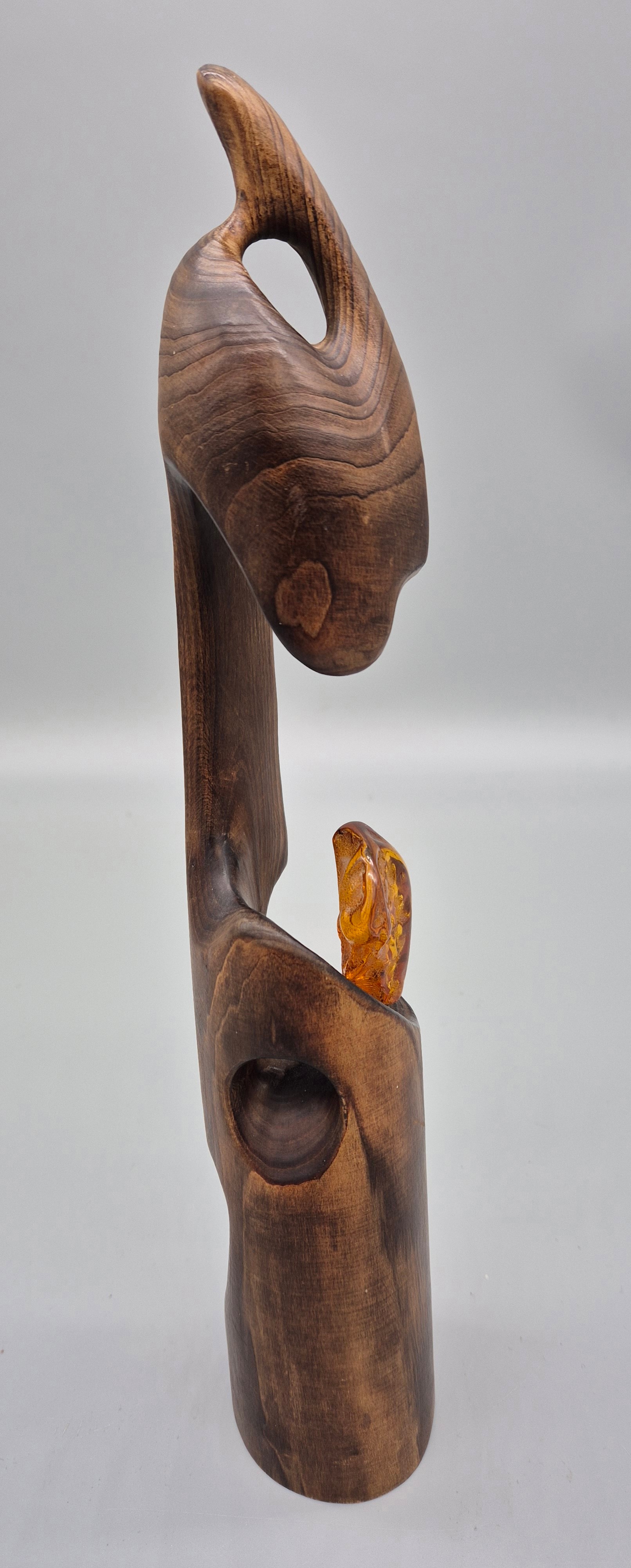 Original Elliptical wood with amber in the centre of the sculpture. Stamped to the base. [32cm high]