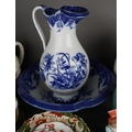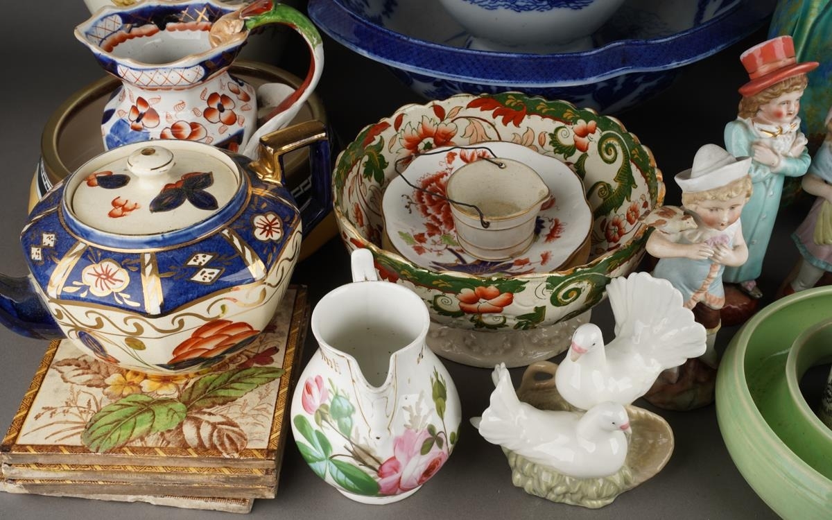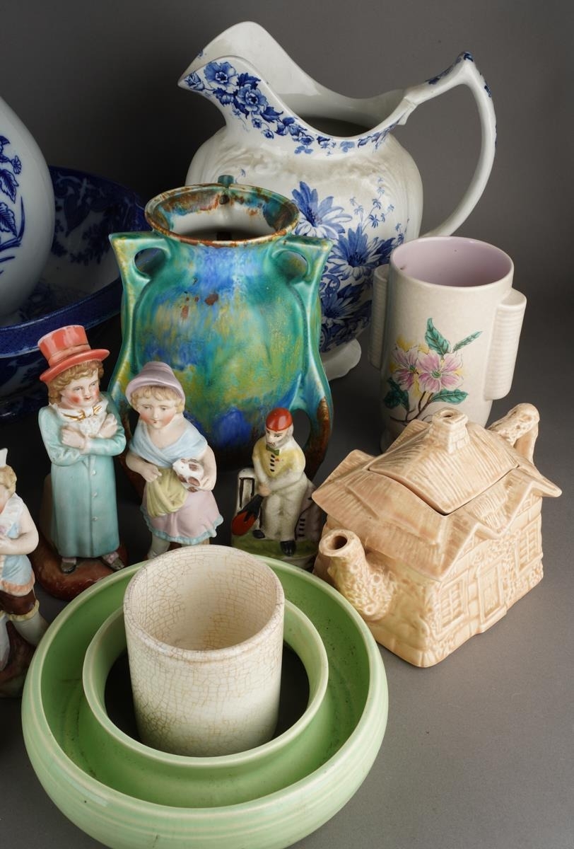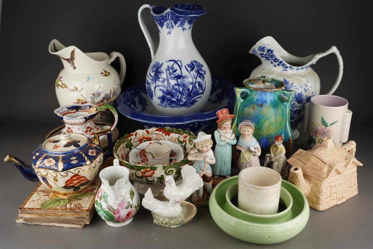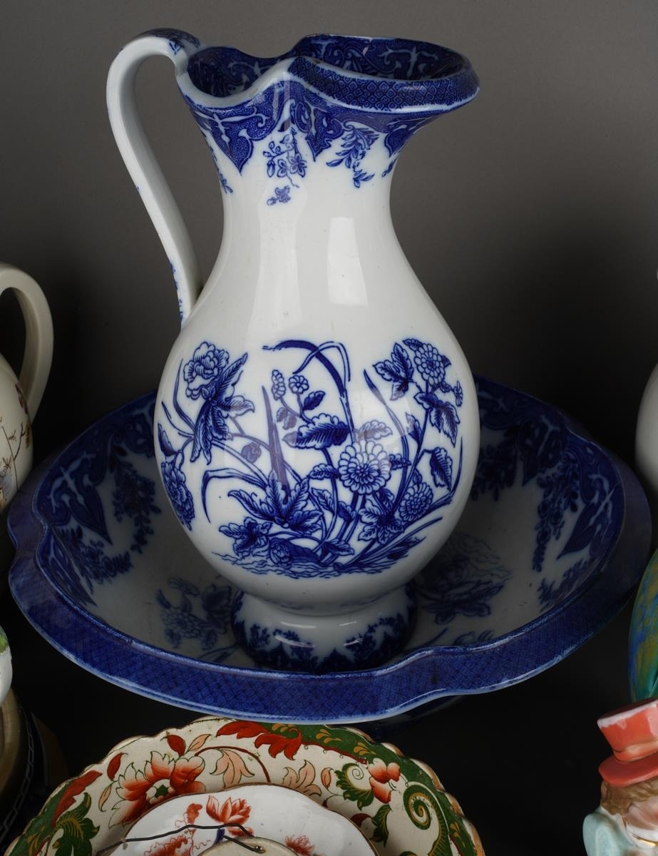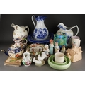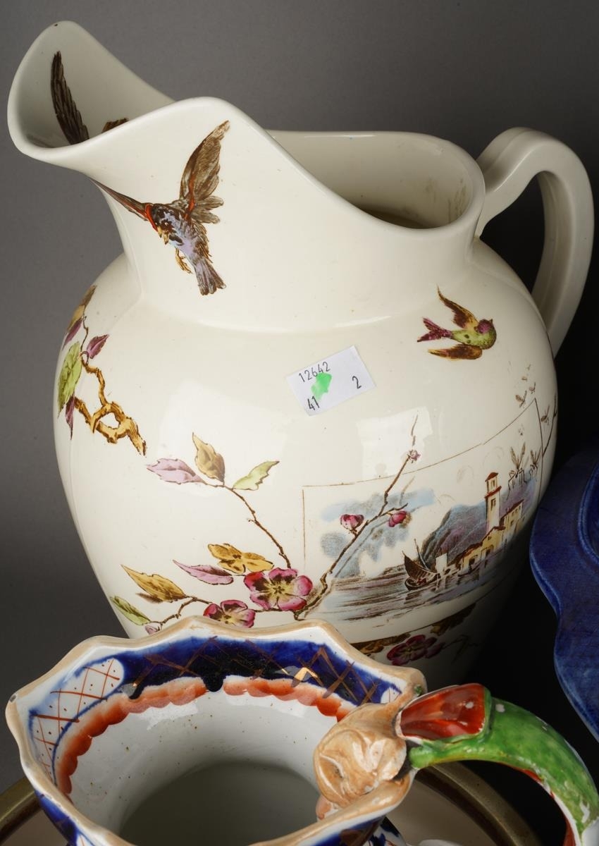 A Victorian Aesthetic P Brookes & Son Conway "Oriental Avery" large pitcher jug, factory and registration stamps to base, approx 31cm high together with further 19th/early 20th Century ceramics including large jugs, blue and white basin, figures, vases, bowls etc [2 boxes]