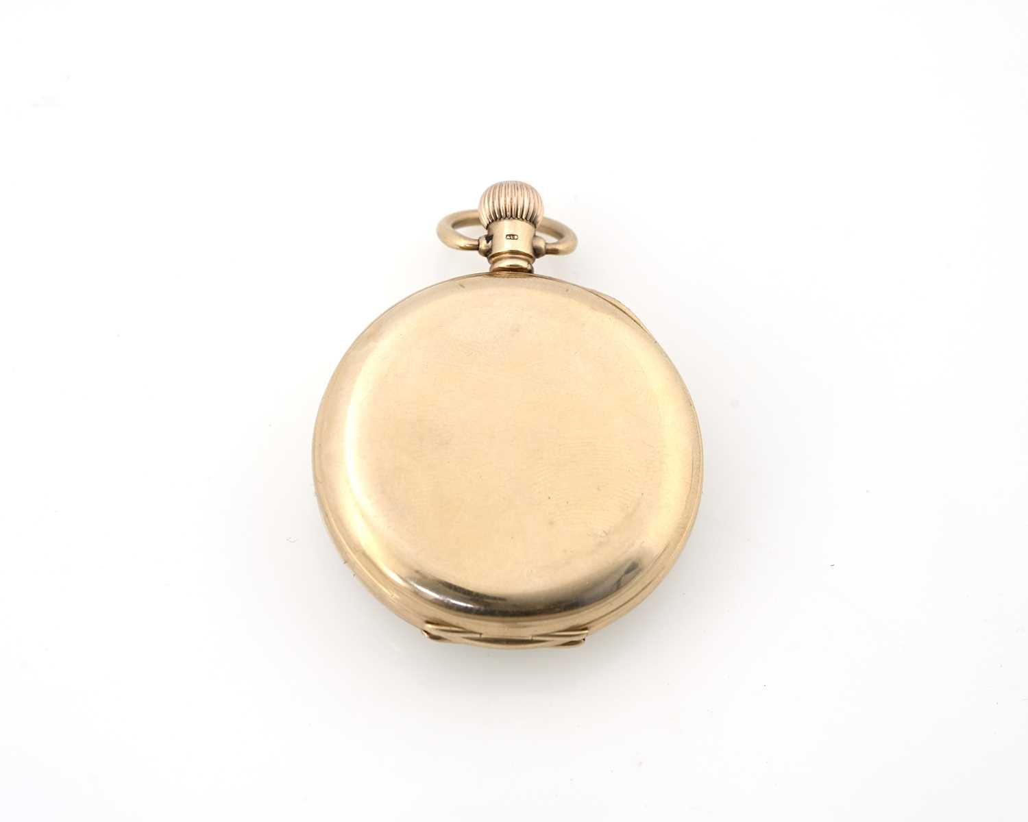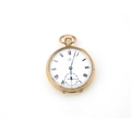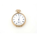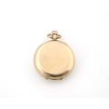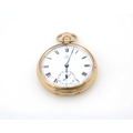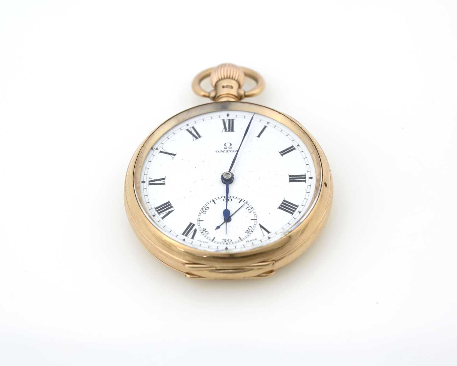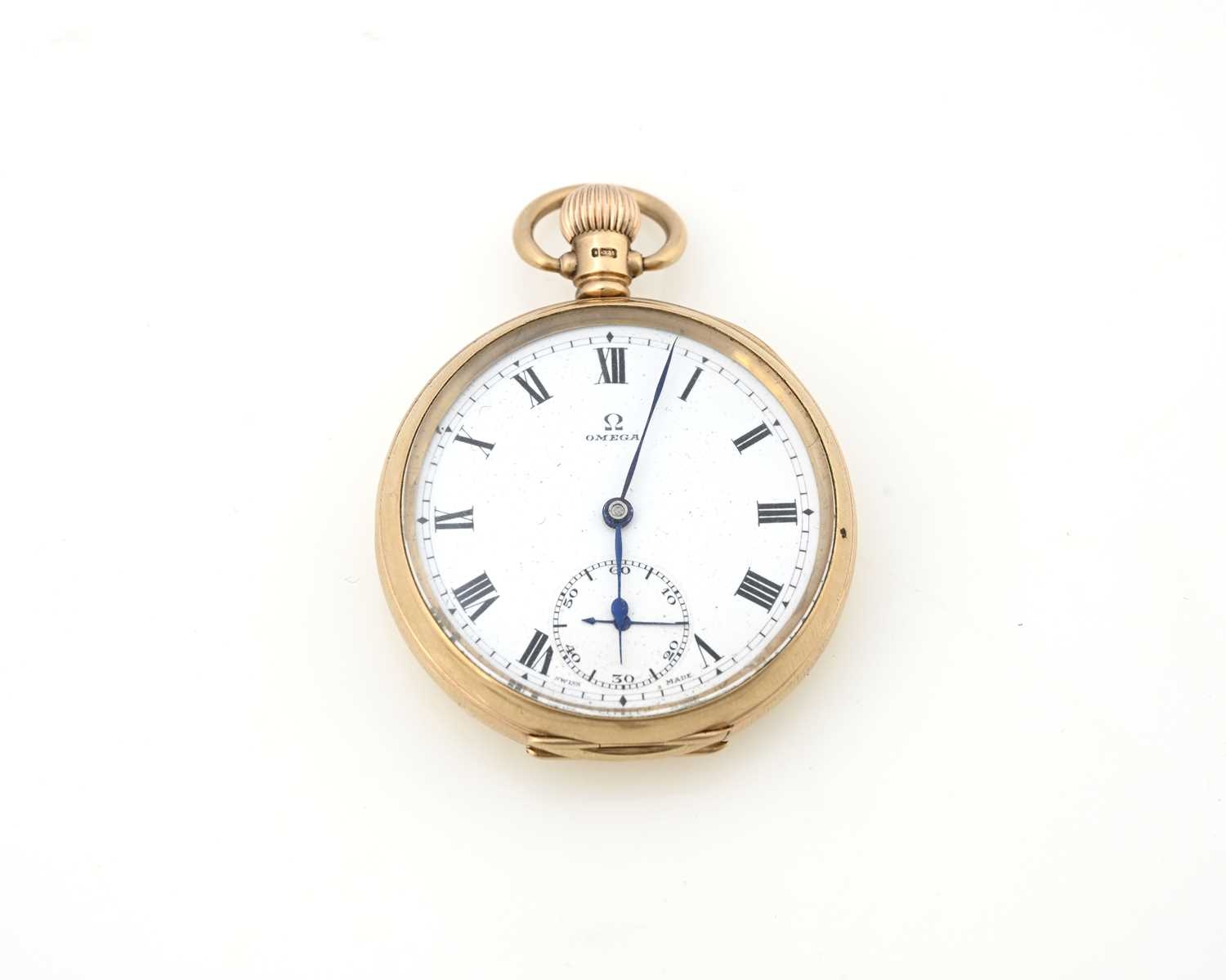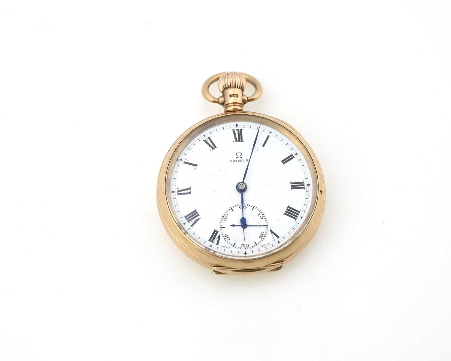 Omega, a 9ct gold pocket watch, circa 1923, open faced, white enamelled dial with subsidiary seconds dial, fifteen jewel movement with engine turned plates, signed and numbered 5709402, 5cm diameter