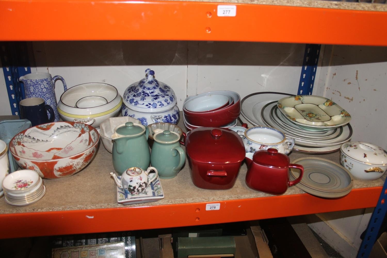Shelf containing decorative ceramics to include jelly moulds, platters, oriental bowl, etc.