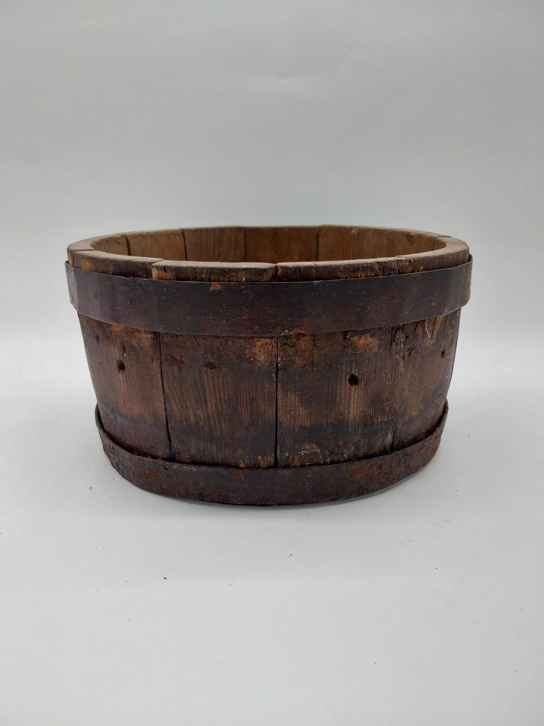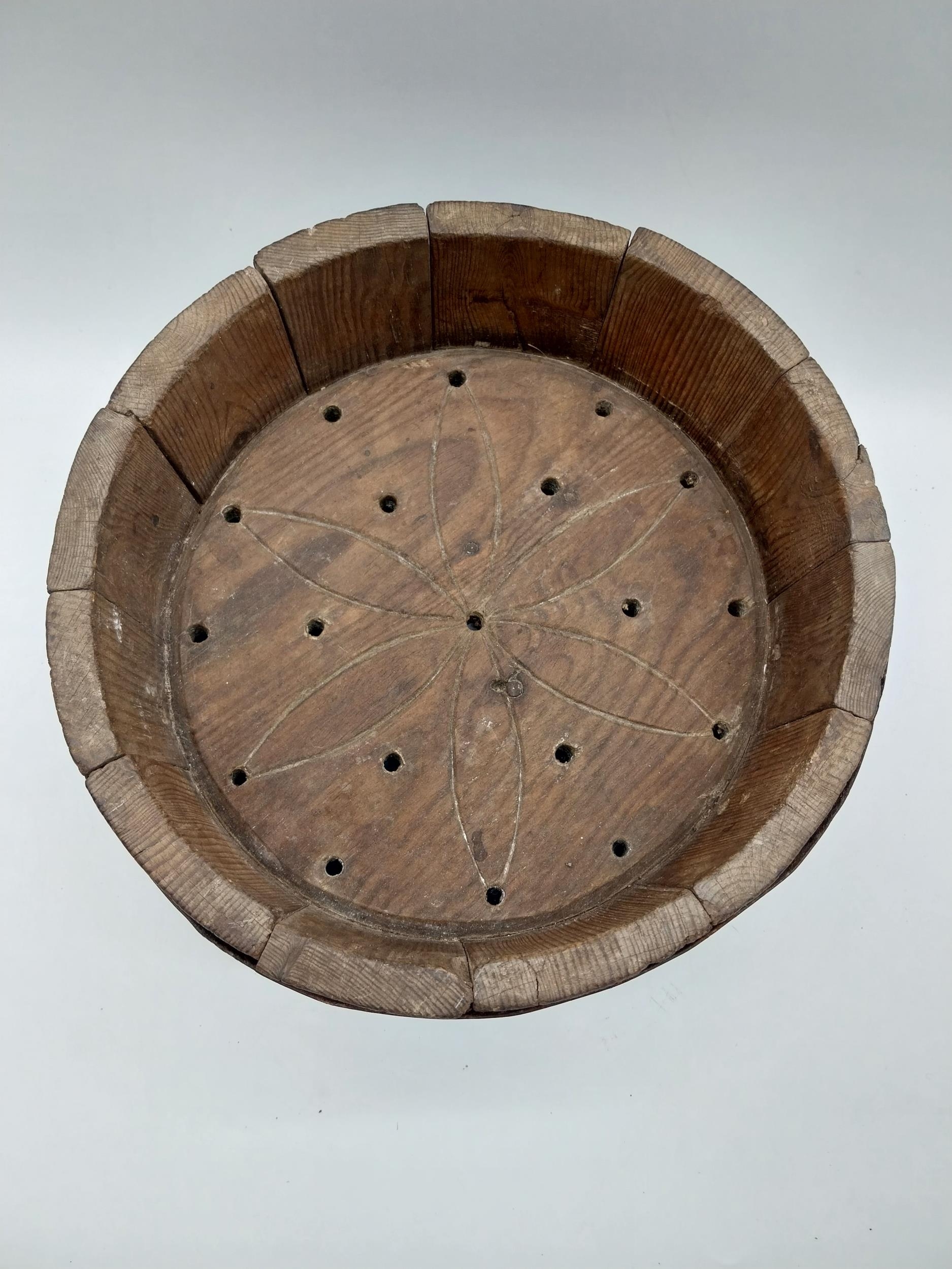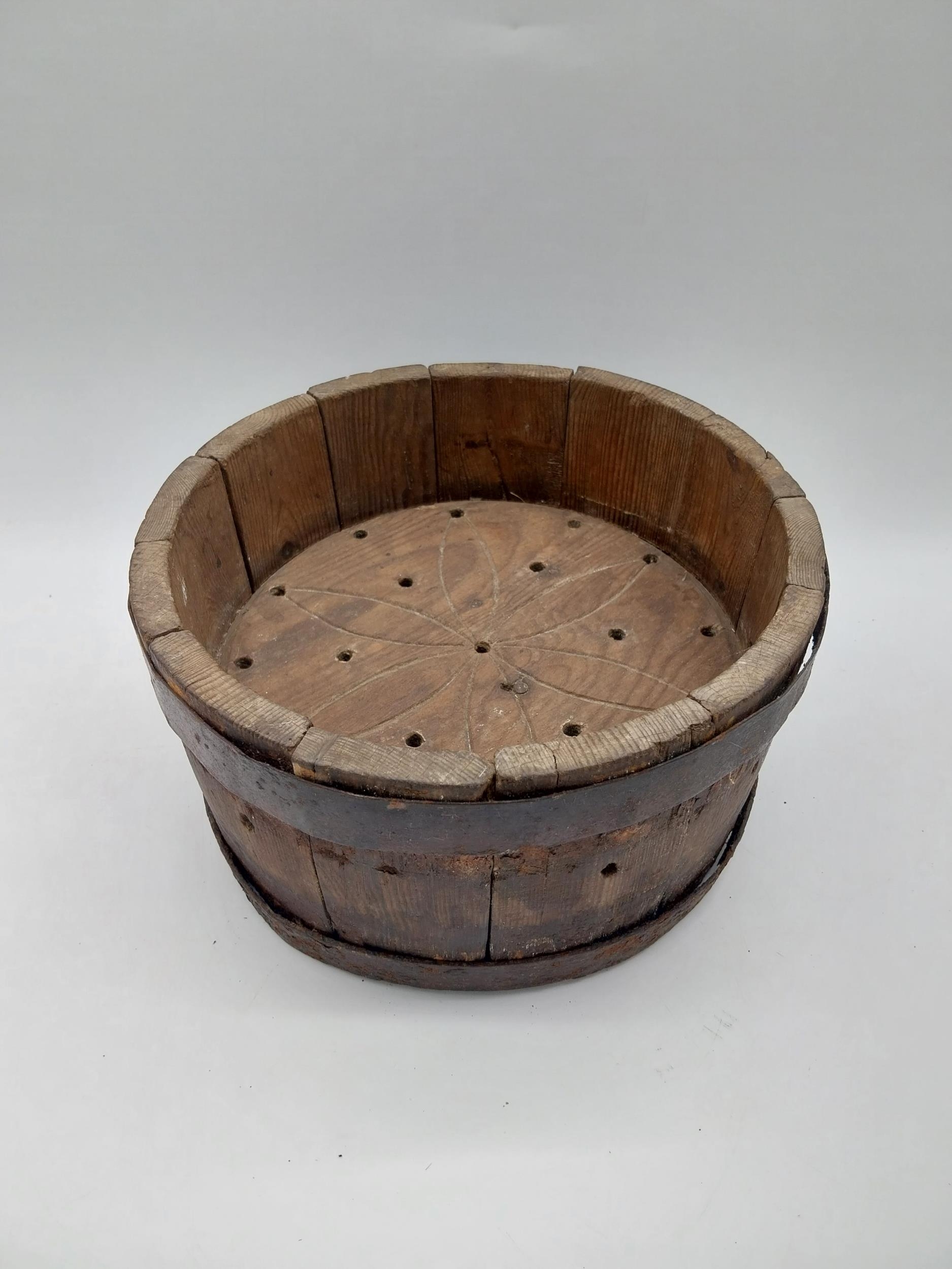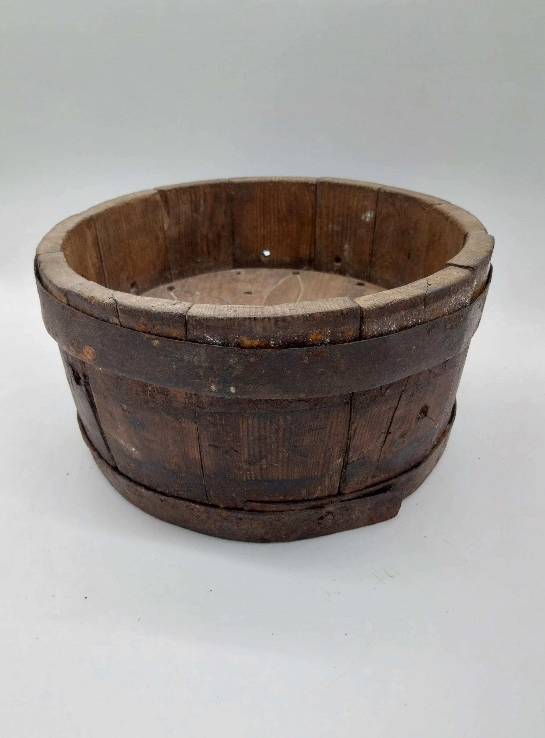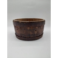 19th C. oak metal bound cheese press. {16 cm H x 30 cm Dia.}.