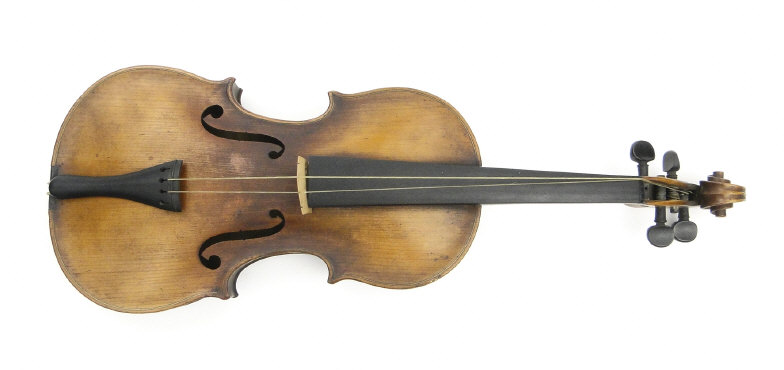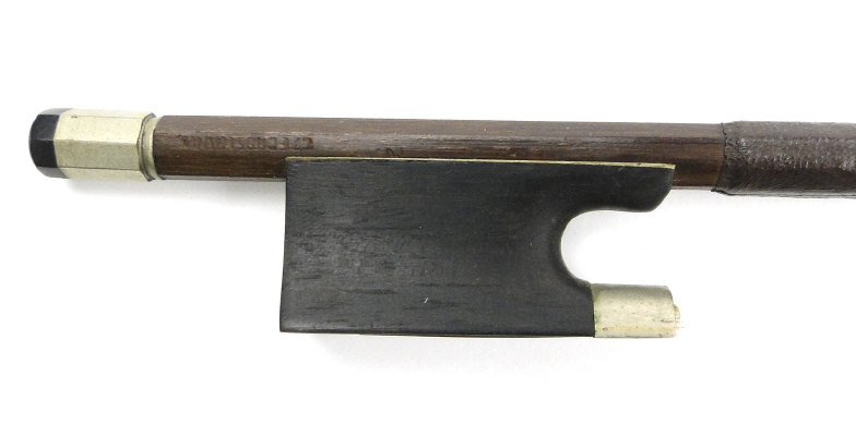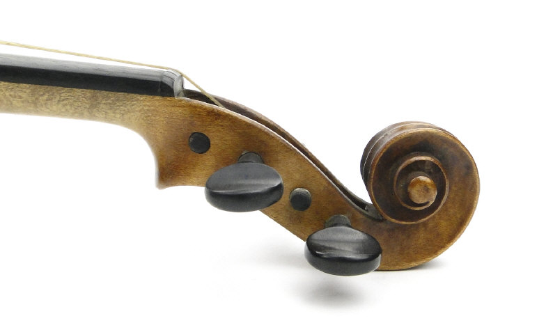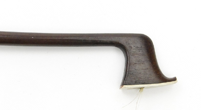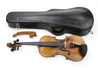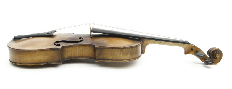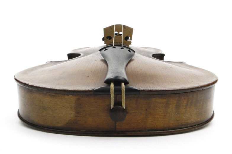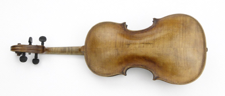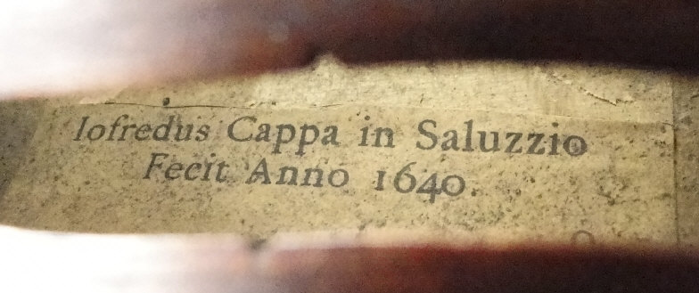 Old wooden violin with two piece back bearing a label to the interior printed 'Iofredus Cappa In Sasluzzio Fecit Anno 1640', together with a bow with ebony frog, the violin body 36cm in length