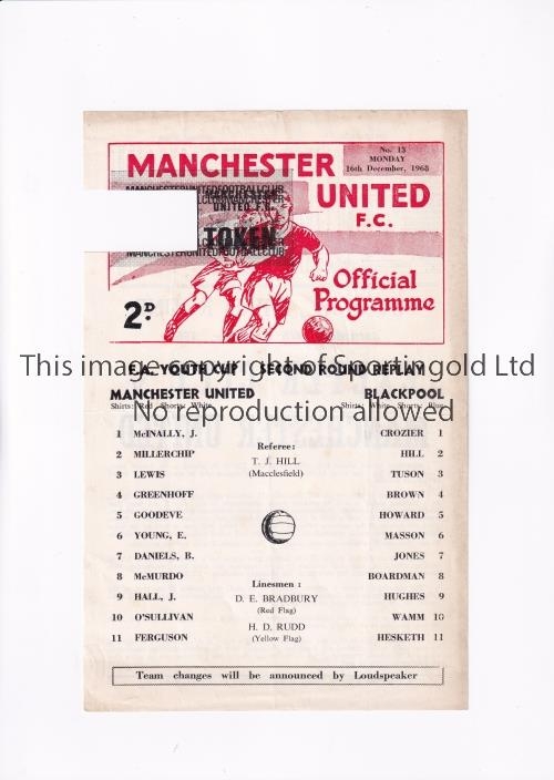 MANCHESTER UNITED Programme for the home Youth Cup Replay v Blackpool 16/12/68, token removed. Fair