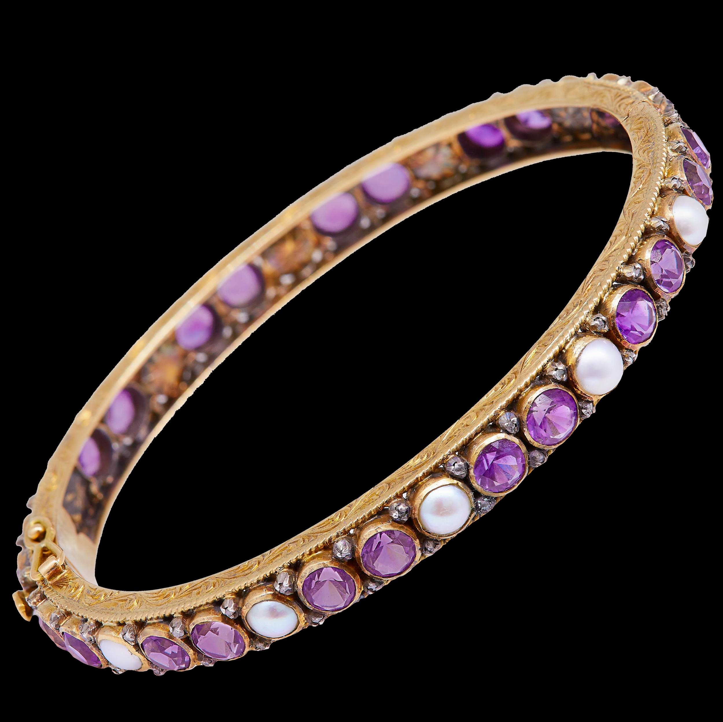 RARE ANTIQUE VICTORIAN PEARL AMETHYST AND DIAMOND ETERNITY HINGED BANGLE, in 18 ct. gold. The bangle alternatedly set with a pearl and 2 amethysts, all flanked with diamonds on the sides. The side of the bangle decorated with floral scrolling engraving. Inner diam. 5.8 cm. 26 grams.