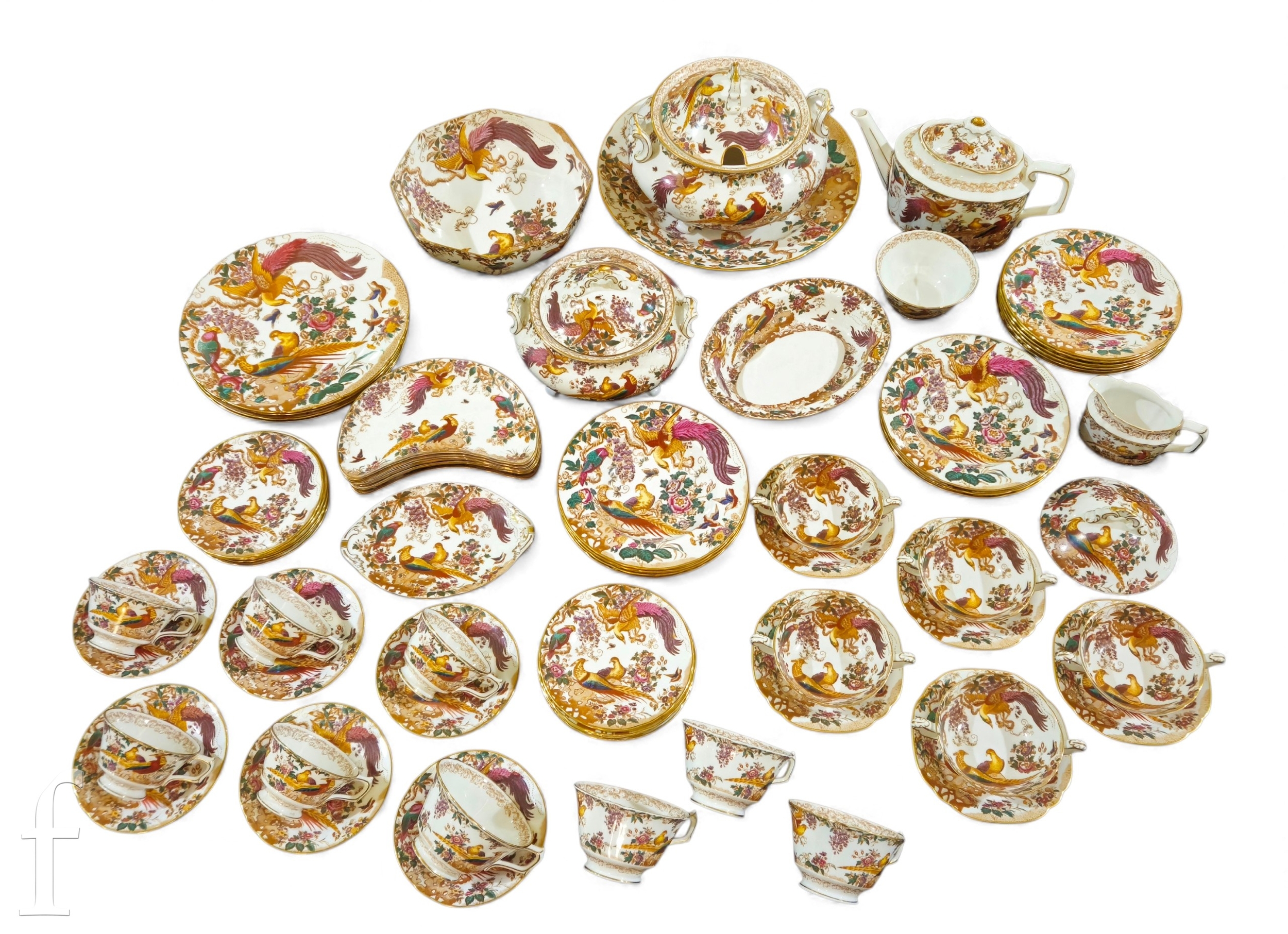 A Royal Crown Derby Old Avesbury pattern part tea and dinner service, comprising Soup tureen and stand, four dinner plates (26cm), six dessert plates (22cm), vegetable tureen, octagonal fruit bowl, large teapots, five soup bowls and stands, seven soup dishes, four breakfast cups and, entree plates etc, approximately sixty pieces, all appear to be first quality.