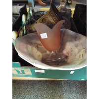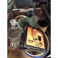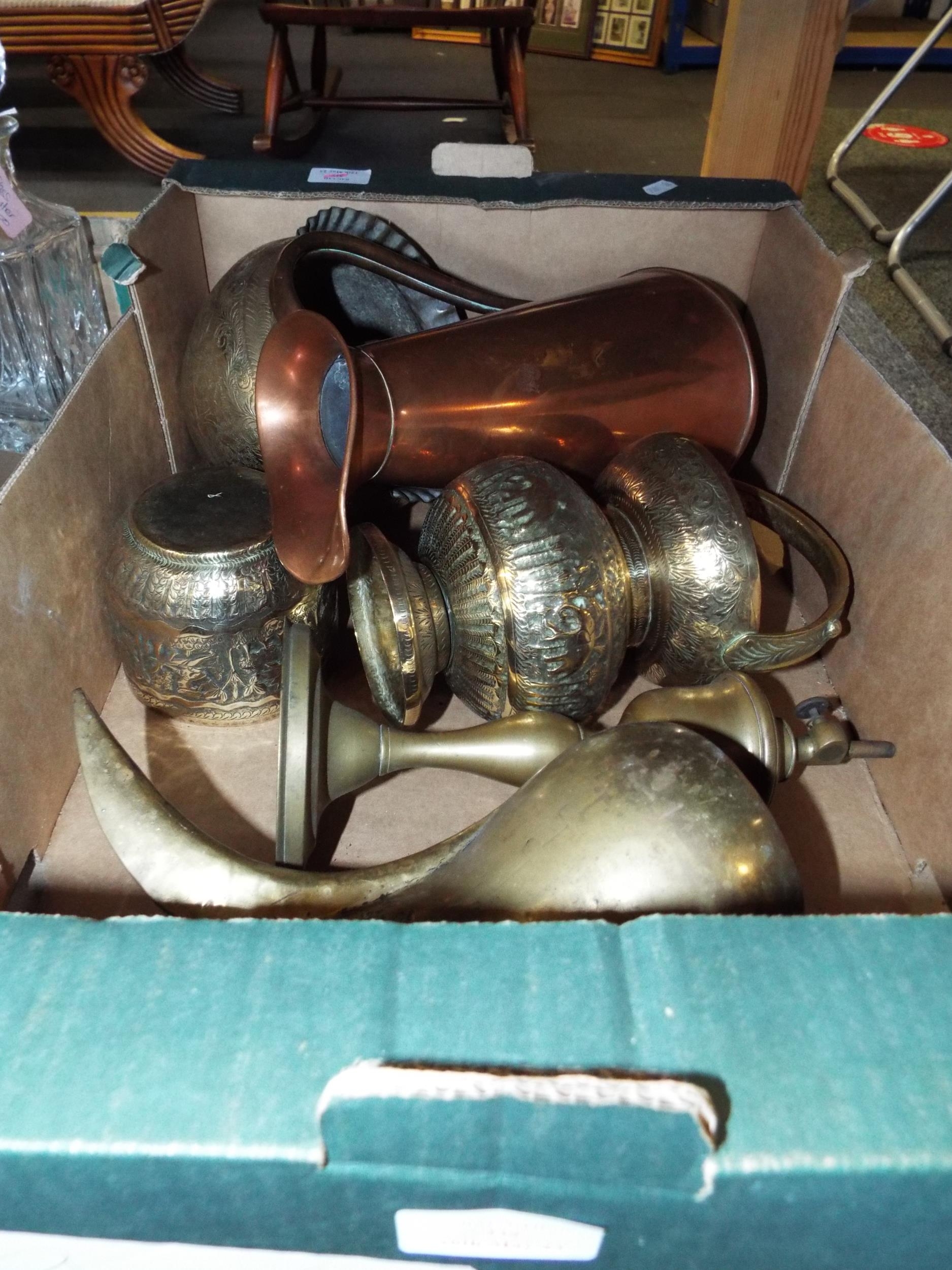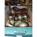 A tray of brass items including a copper jug