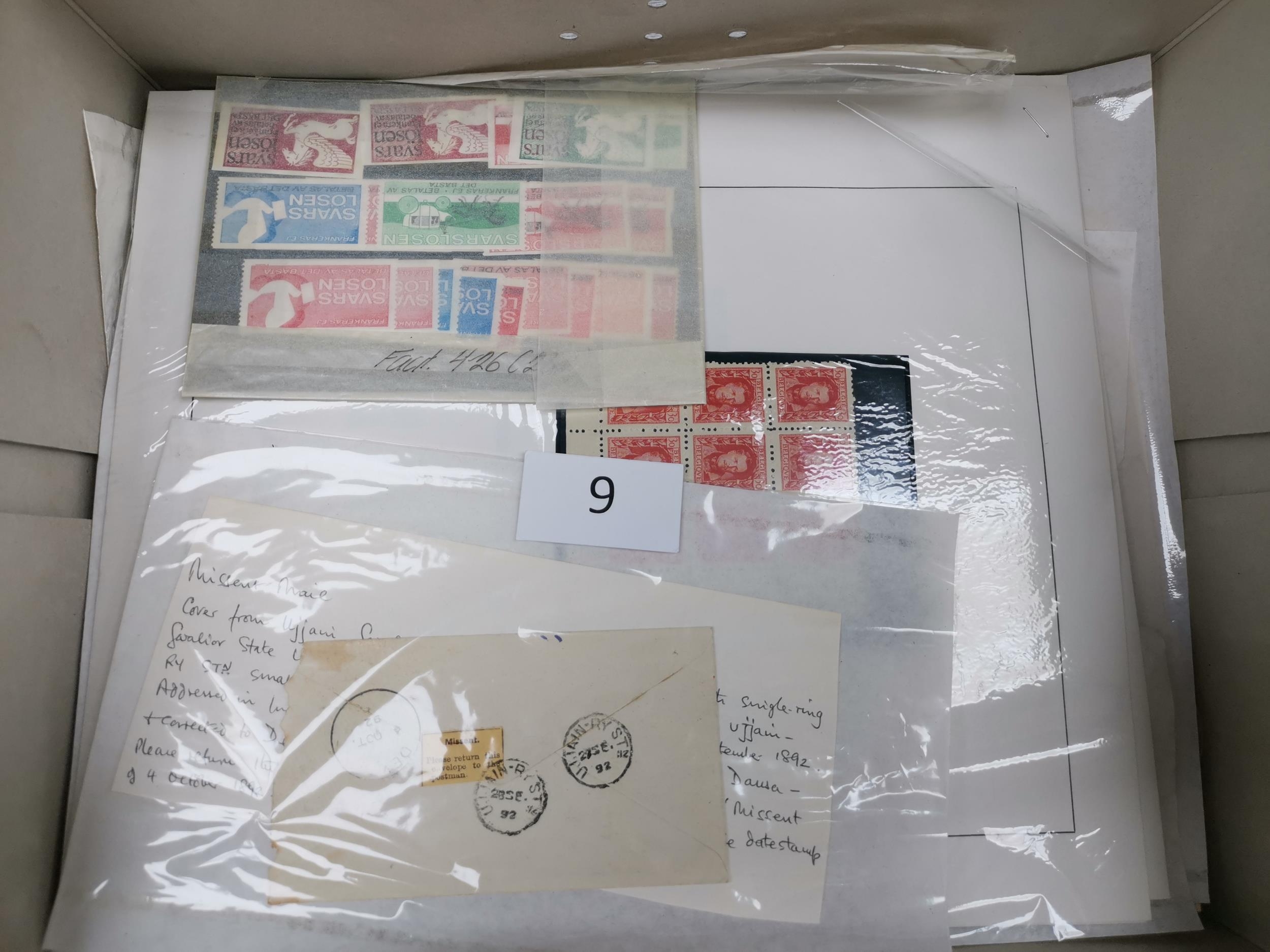MIXED WORLD. An interesting and diverse range in box incl. WWII Propaganda forgeries Postage Due covers Gwalior 1892 large part envelope with yellow printed "Missent" label on reverse etc. (qty)