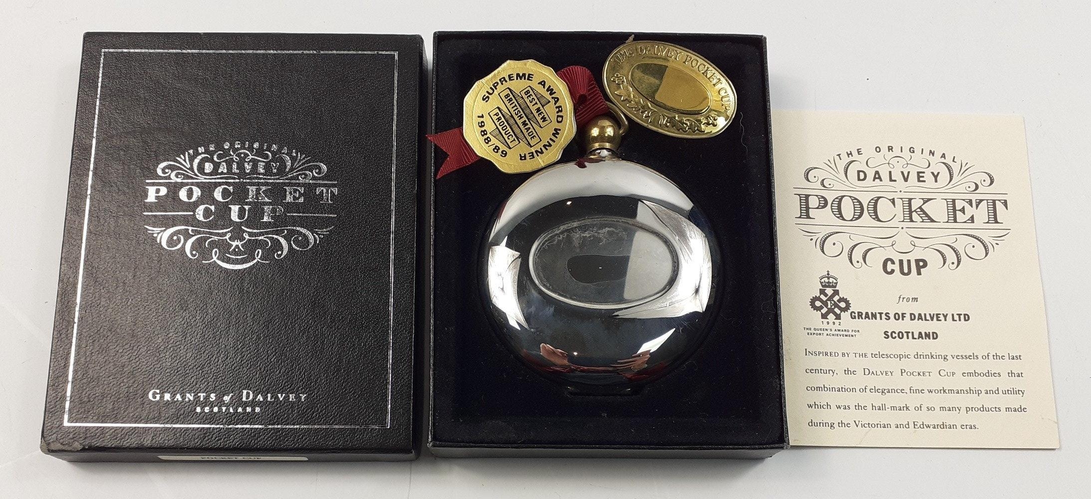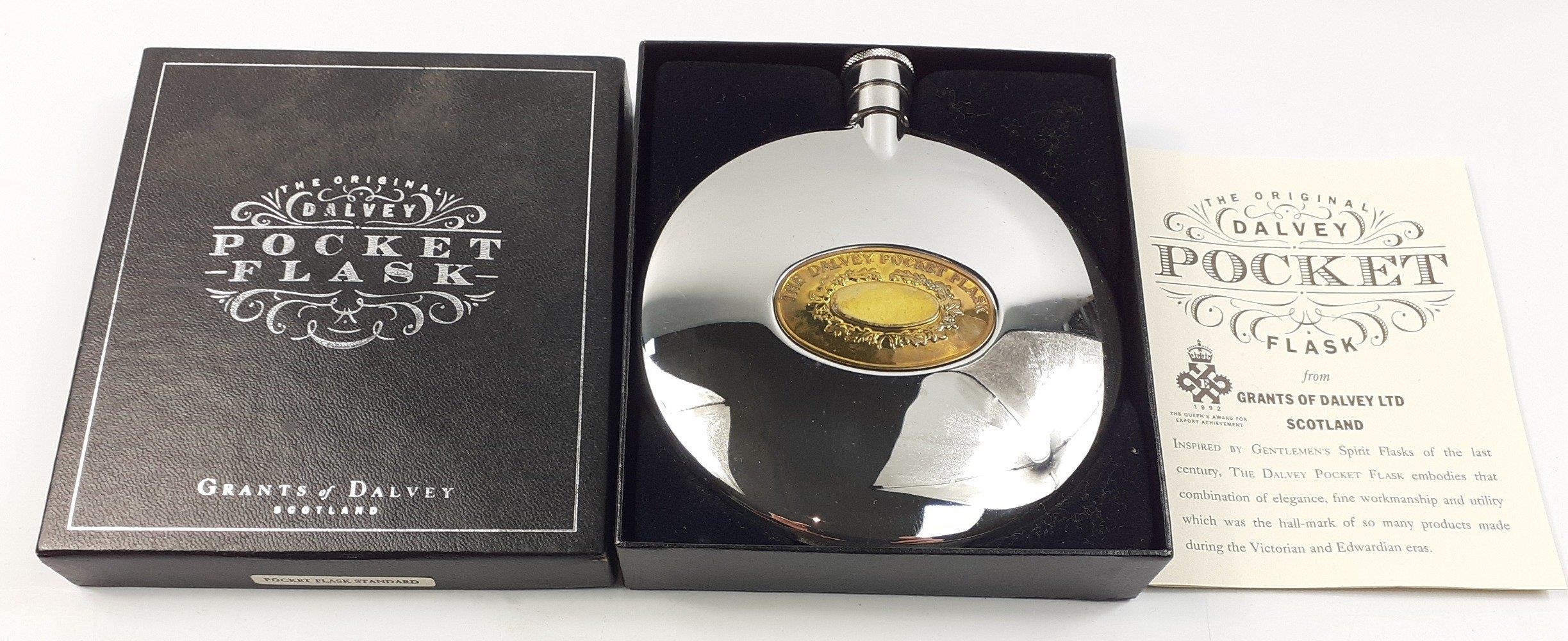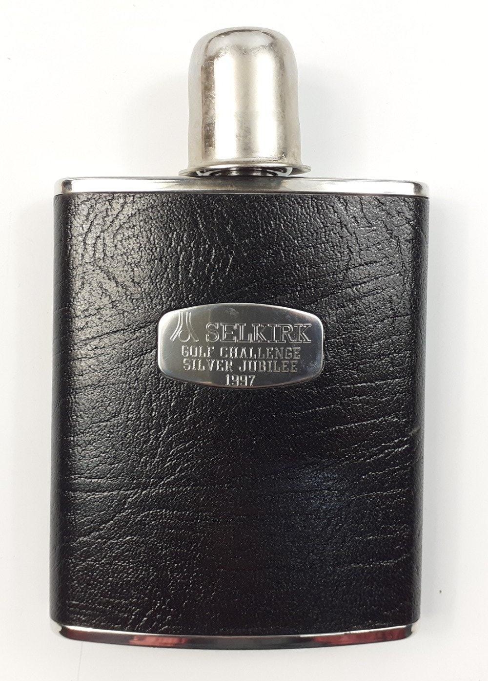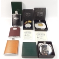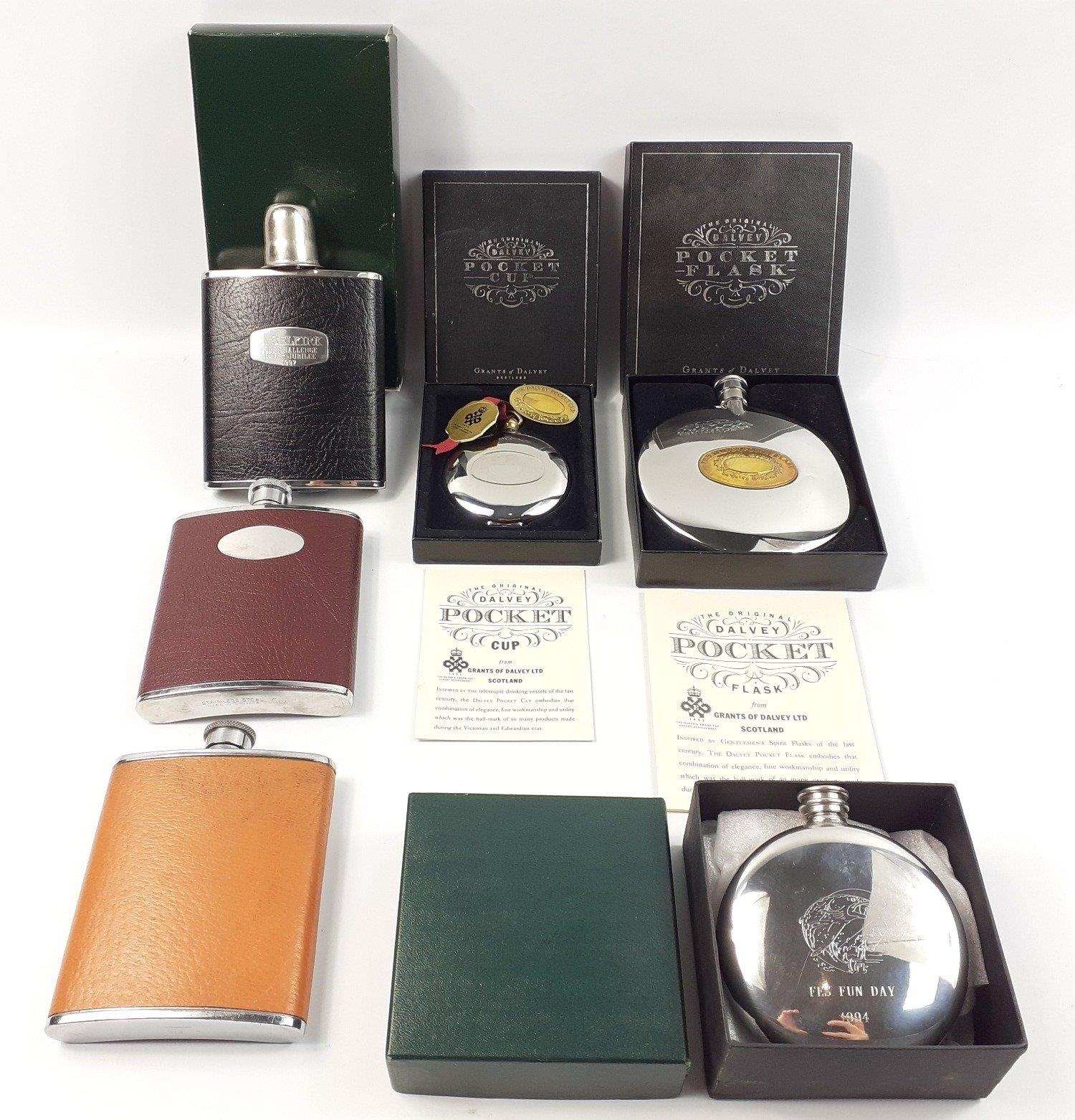 A collection of hip flasks to include a boxed DALVEY pocket cup, a boxed SELKIRK golf challenge silver jubilee 1977 flask, a boxed pewter FES Fun Day 1994 flask, a DALVEY pocket flask in box