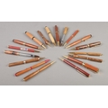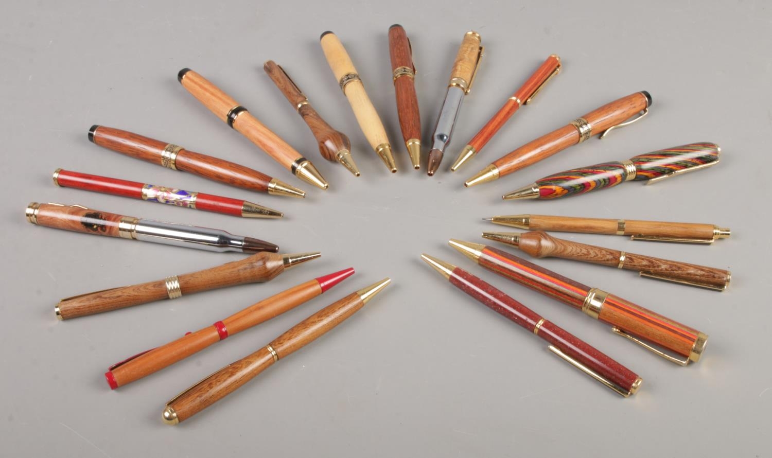 A collection of approximately twenty wooden bodied ball-point pens and propelling pencils.