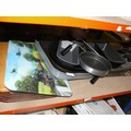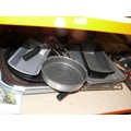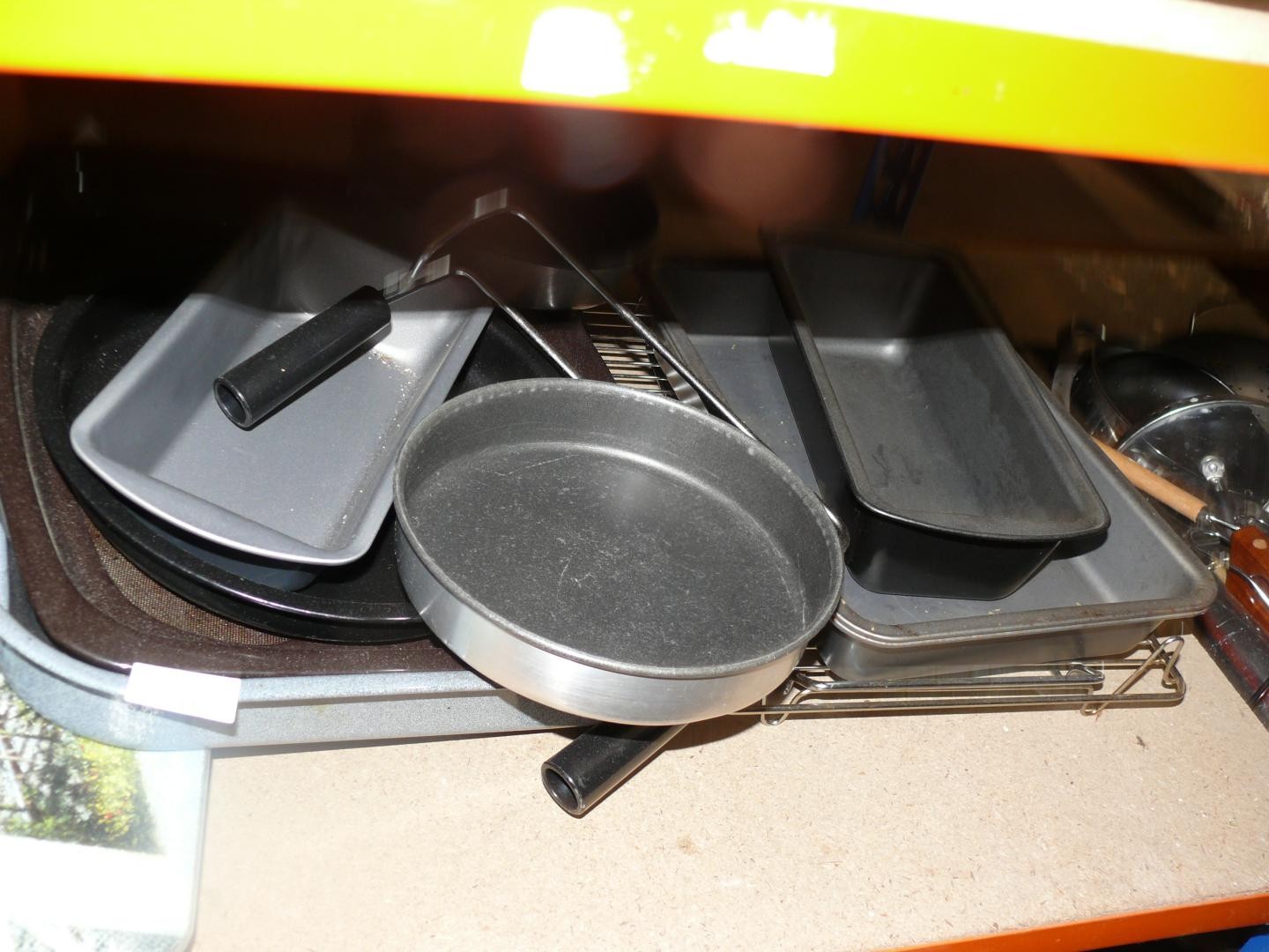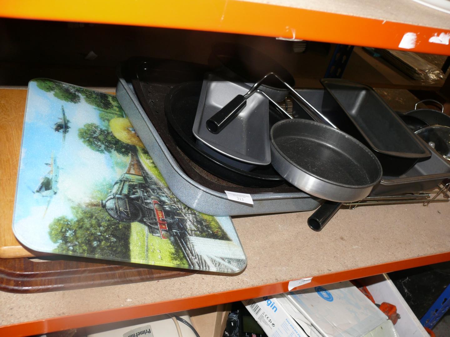 Shelf of oven dishes and chopping boards to include 1 with a train