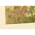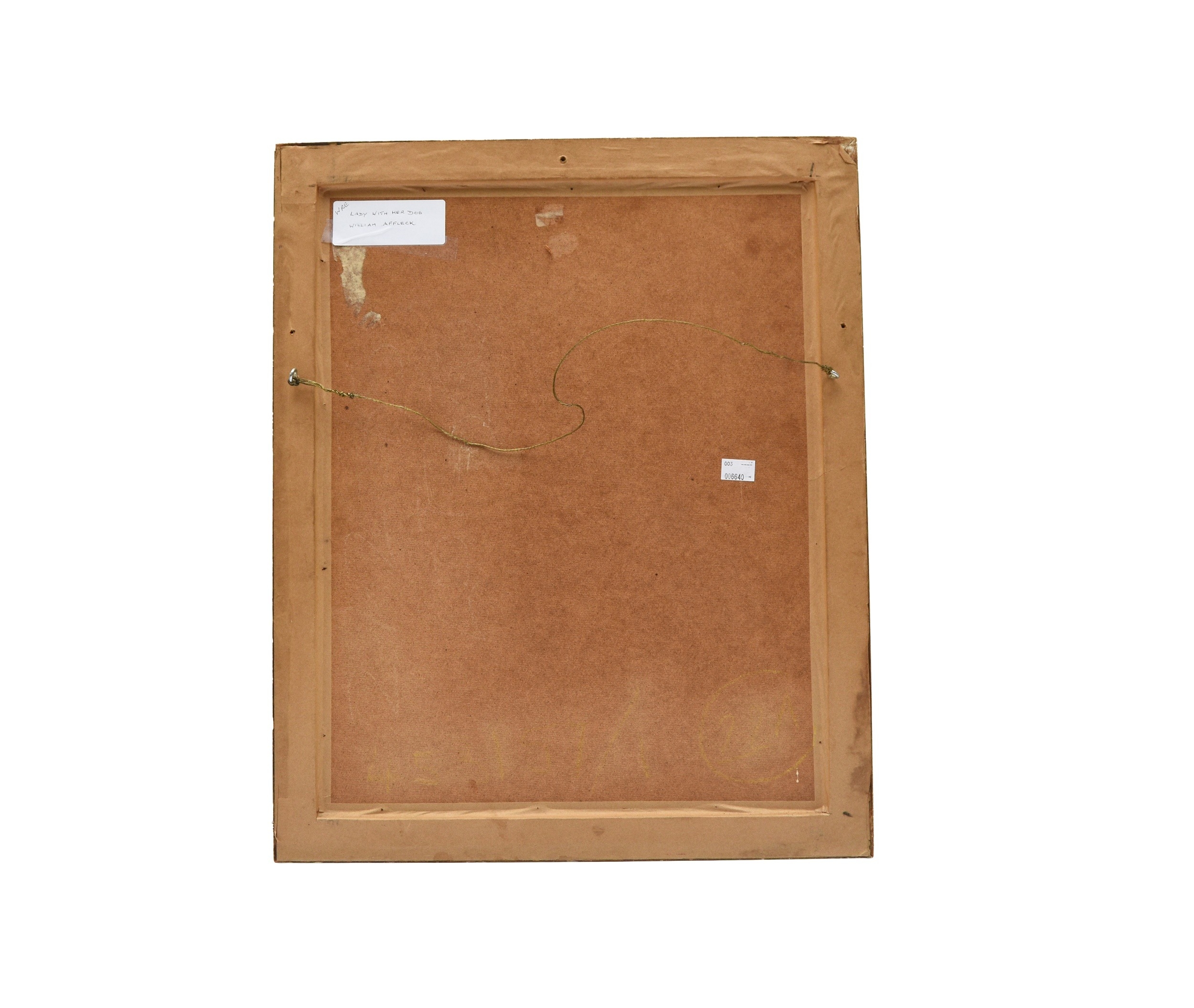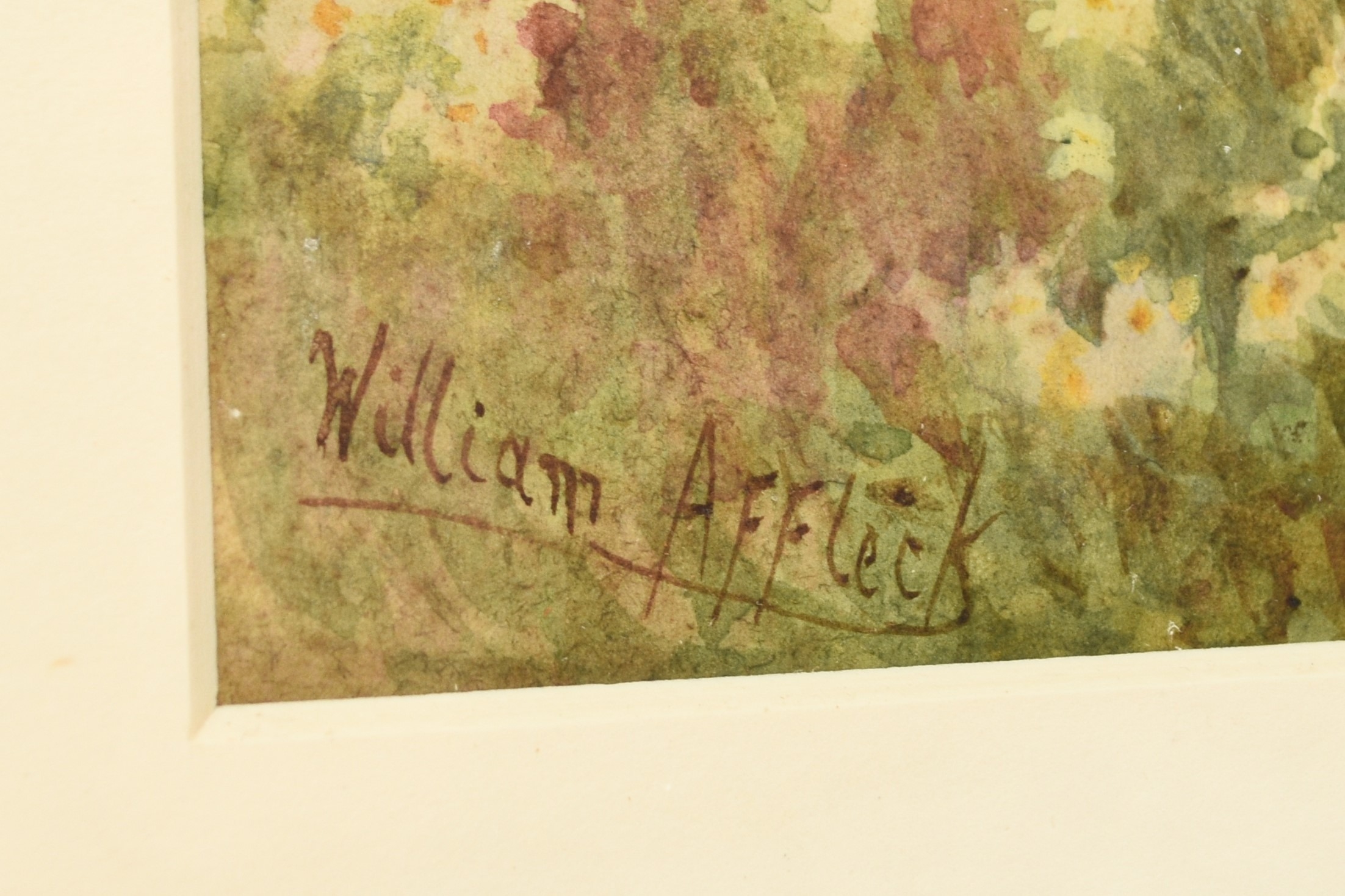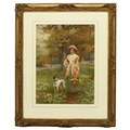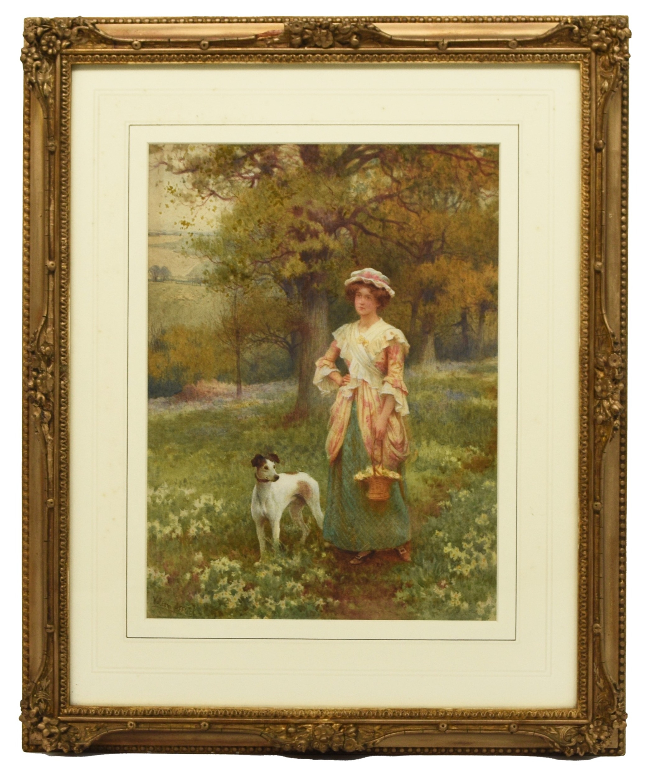 William Affleck (1869-1943) Lady Gathering Spring Daffodils with her dog, signed lower left, watercolour, 36 x 27 cm, frame 56 x 46 cm