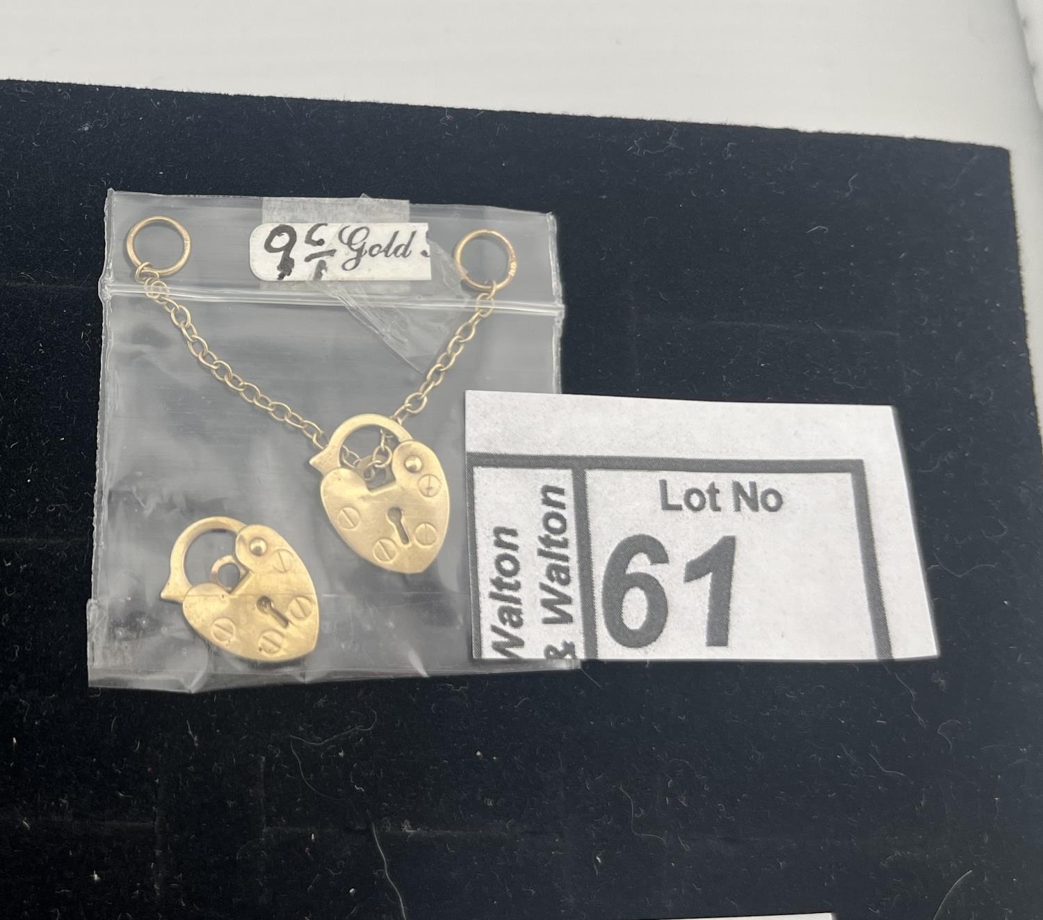 2 9ct Gold heart padlock clasps including safety chain, 1.2g - Only 10% buyer's premium