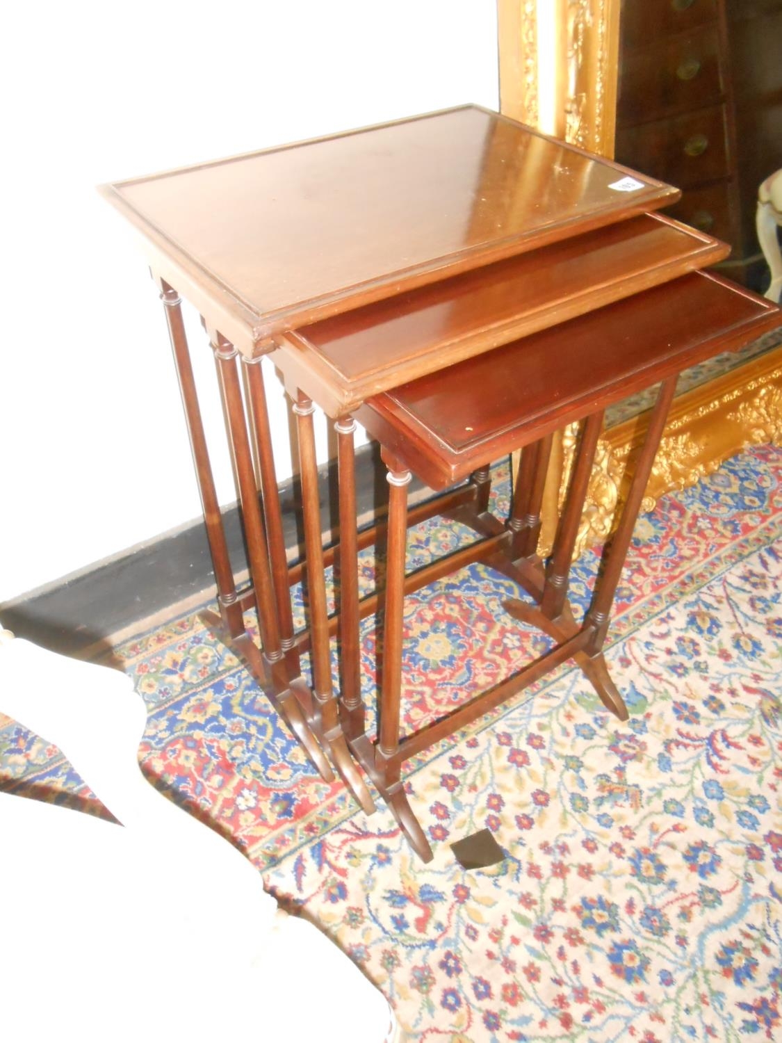 A nest of three mahogany occasional tables on twin spindle s...