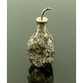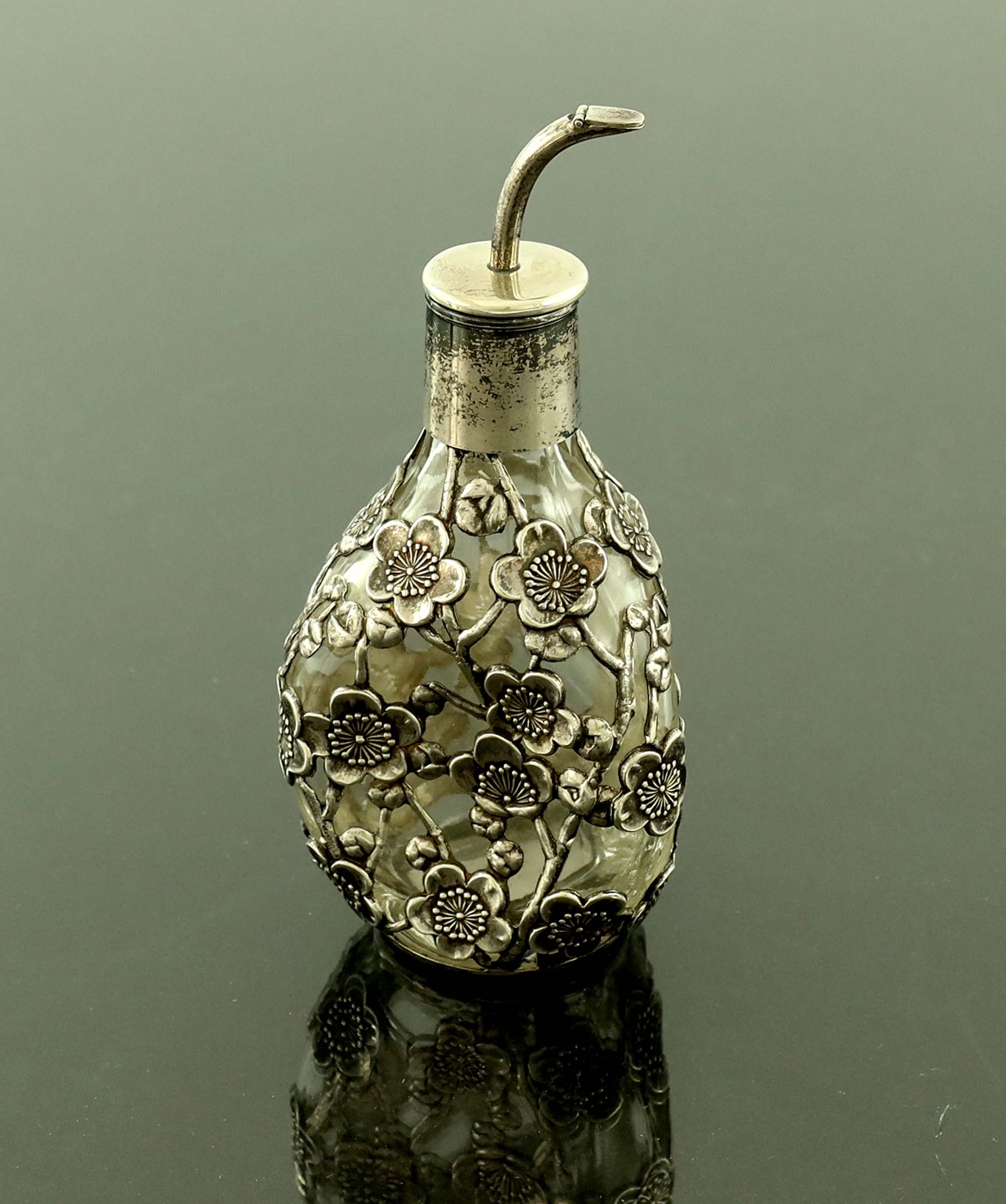 A Japanese silver cased and mounted glass bitters bottle, circa 1930s, the dimple moulded bottle with cast prunus overlay and curved spout with hinged tip, stamped Sterling 950, 11cm high