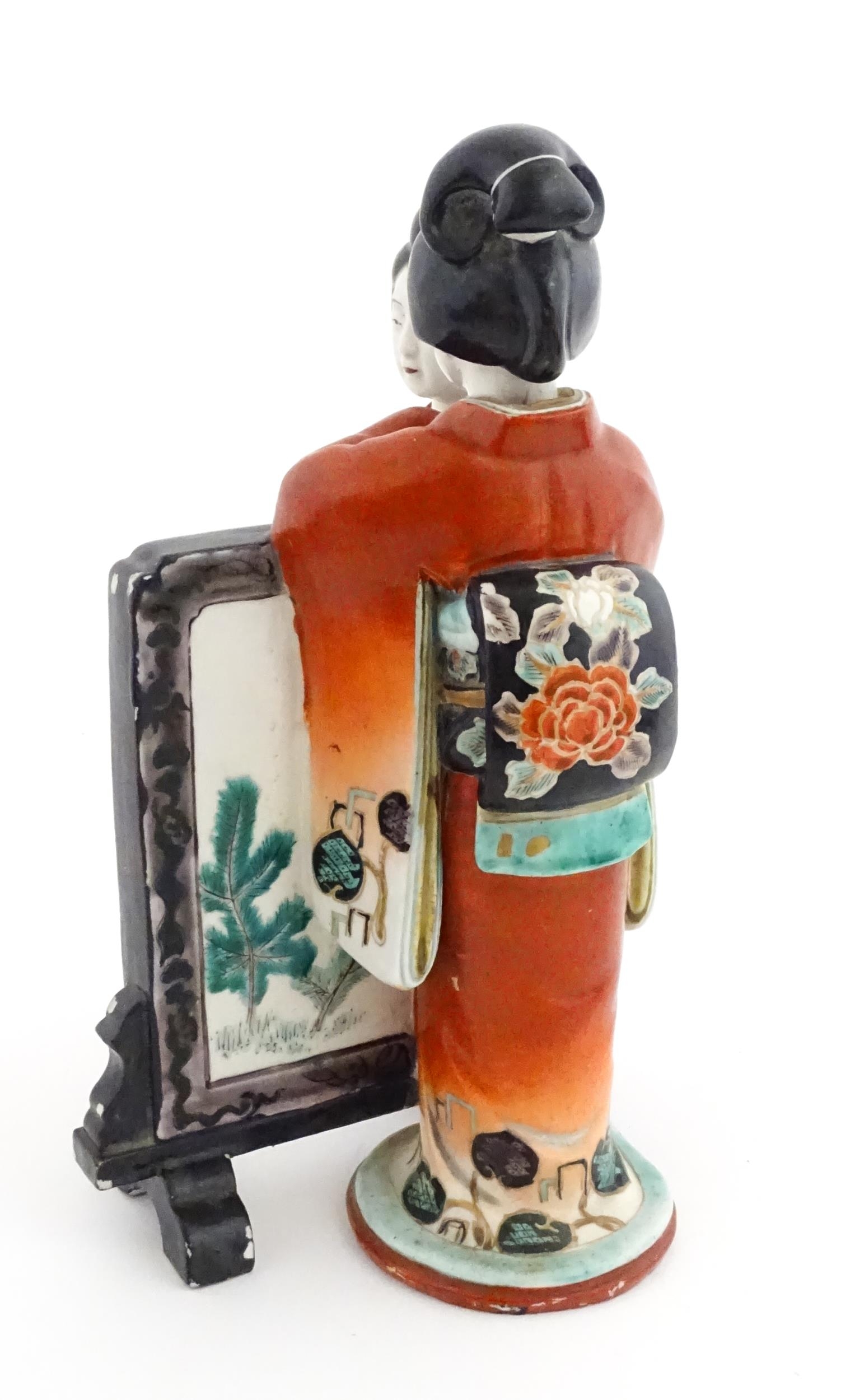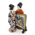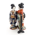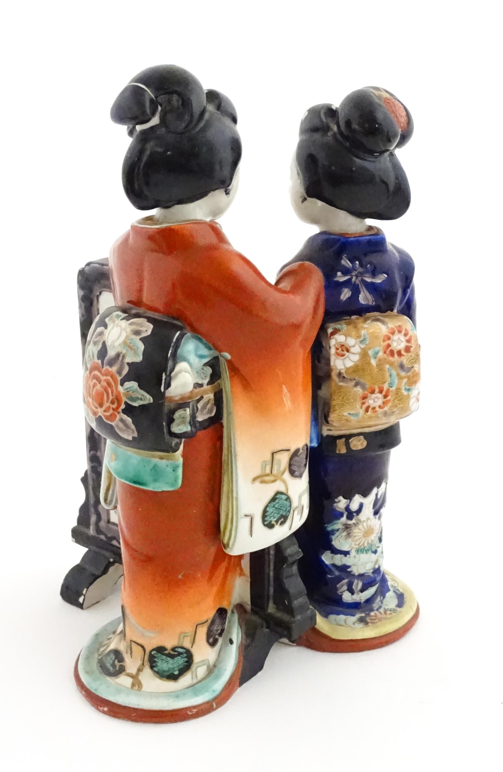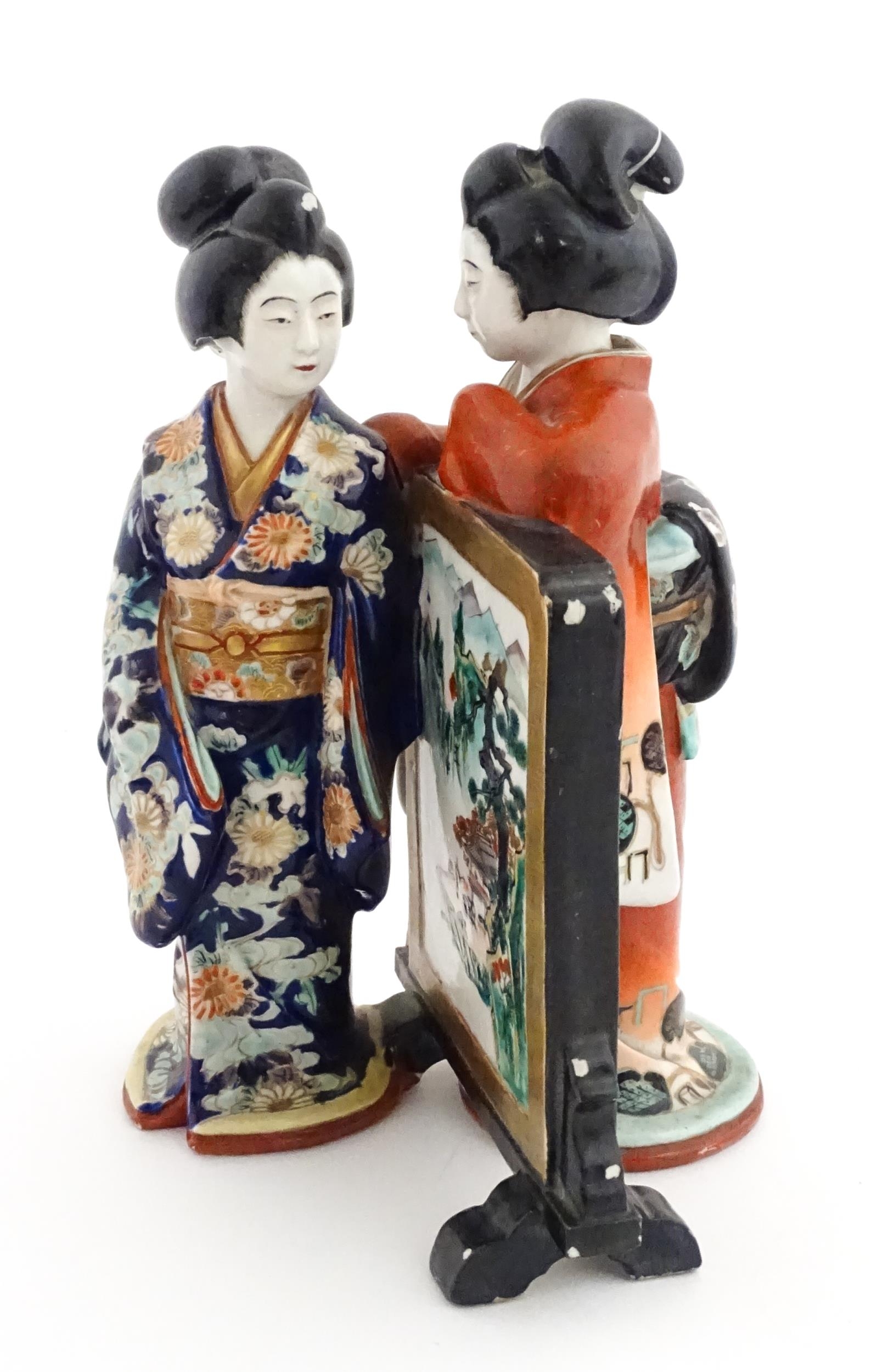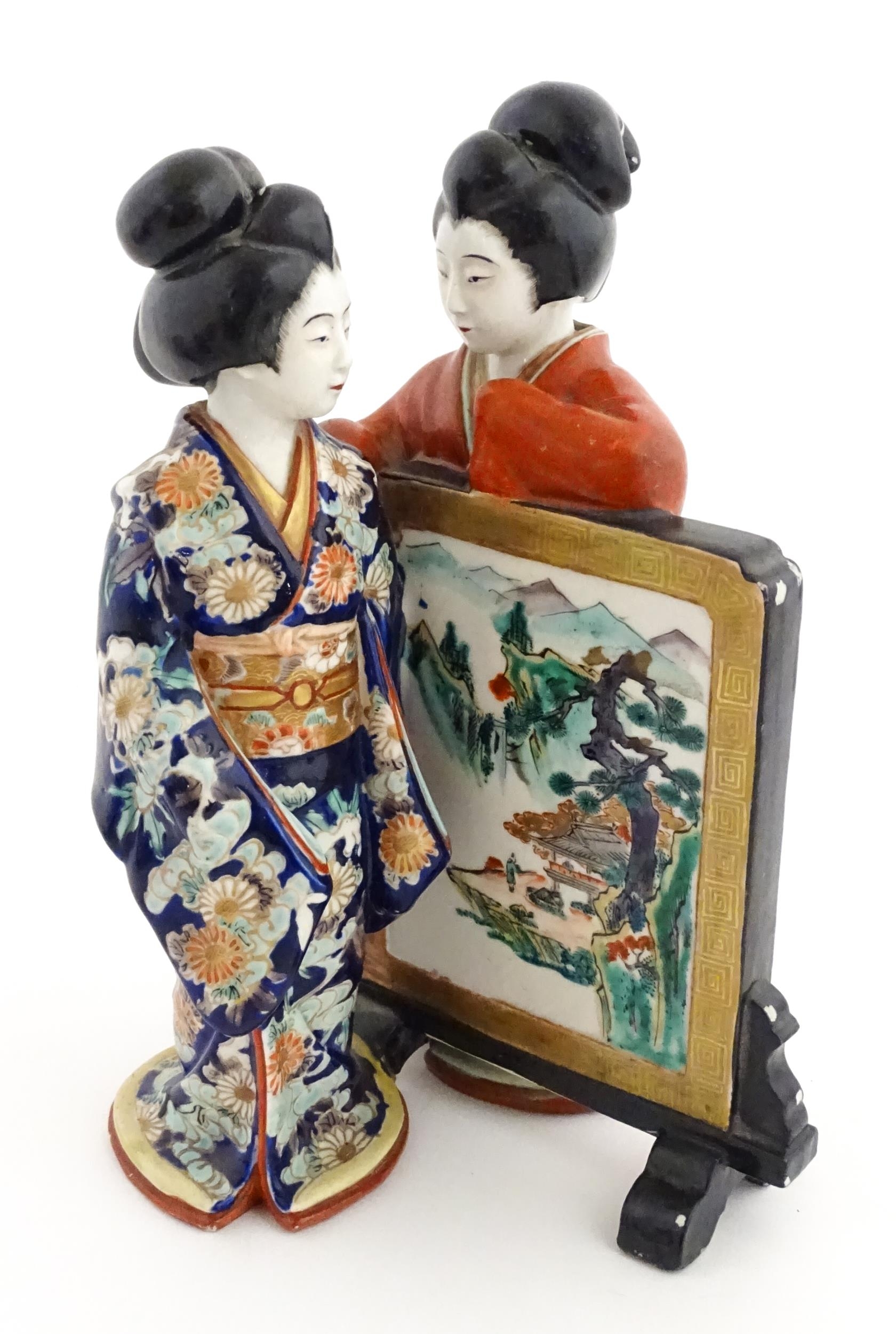 A Japanese figural group modelled as two Geisha girls with a screen. Approx. 11" high