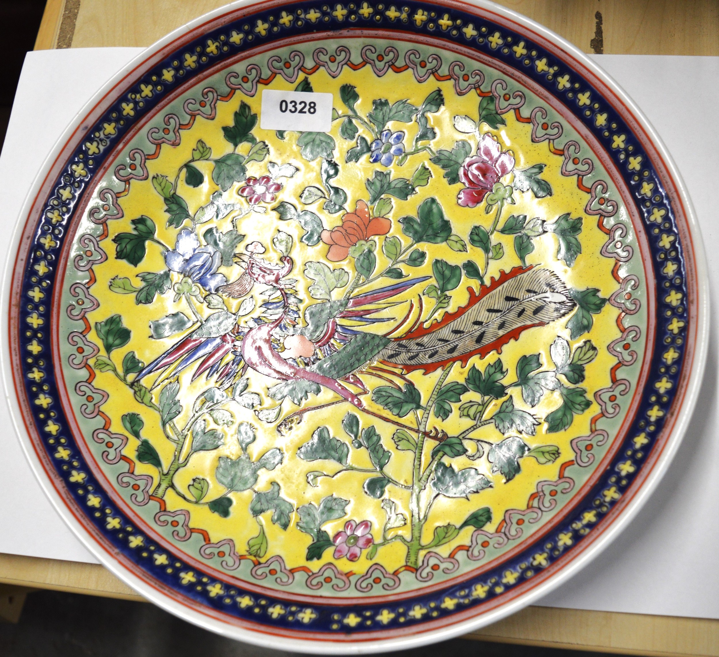 Large Shallow Chinese Ceramic Bowl depicting a Phoenix/Imperial Yellow Colourway - 4 Chinese Characters Stamped Verso - 13" Diameter