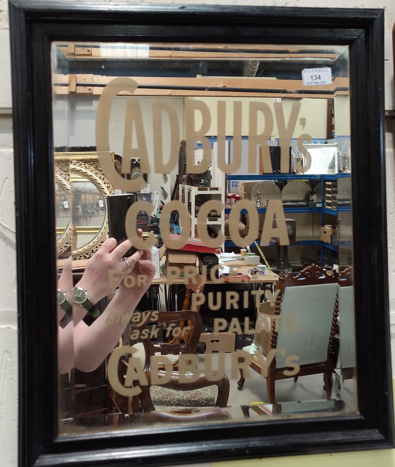 A large advertising beveled edge Cadbury's Cocoa 'For price, purity palate always ask for Cadbury's' in gilt lettering, in dark wood frame height 50cm x 40cm