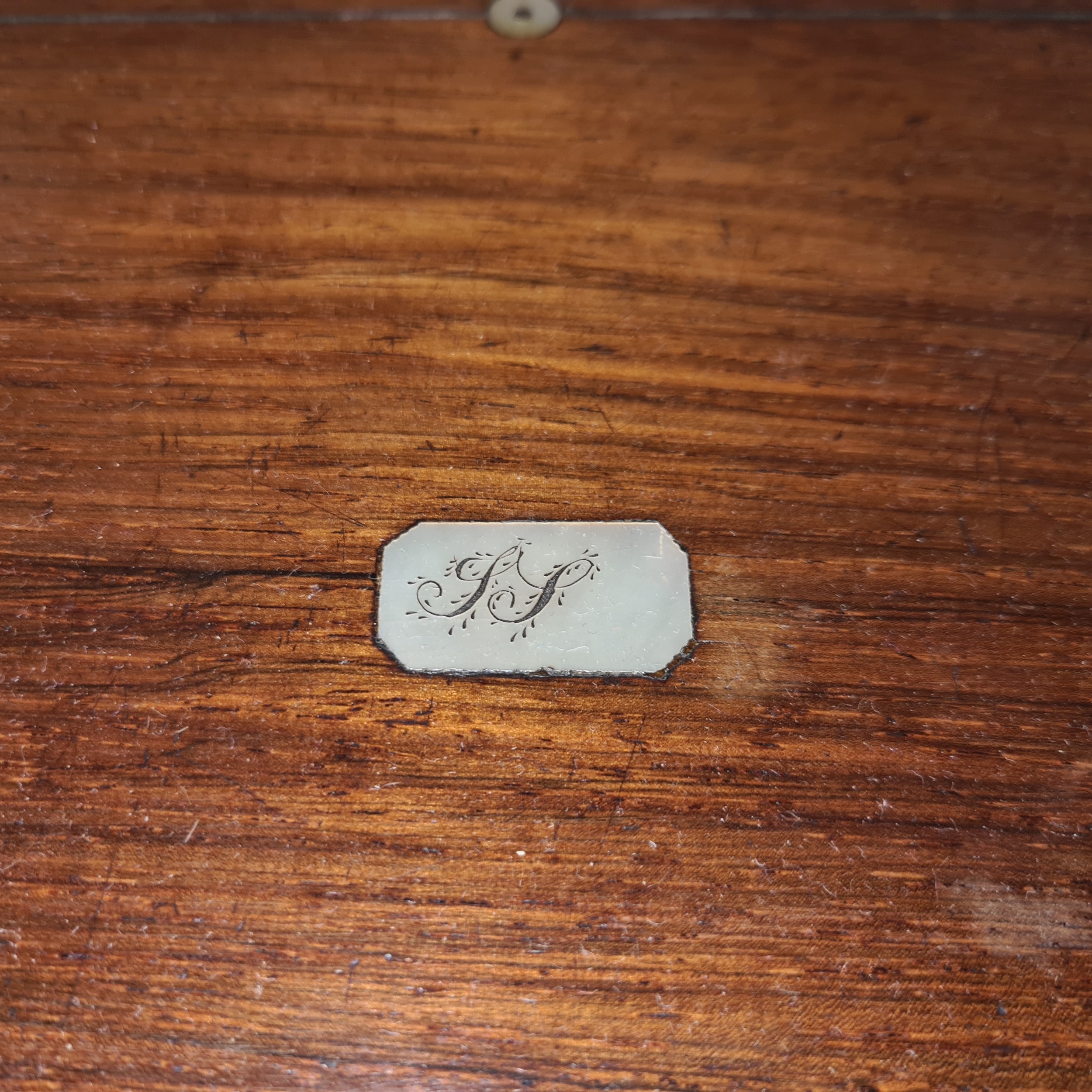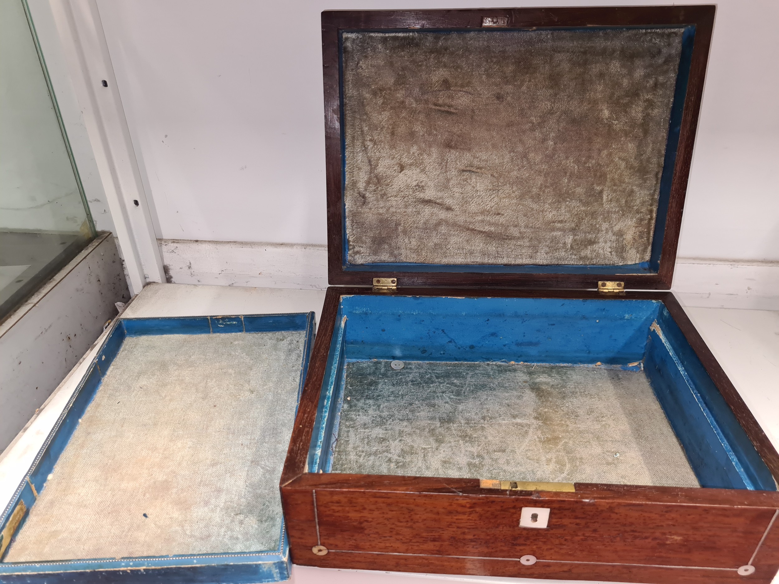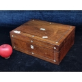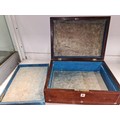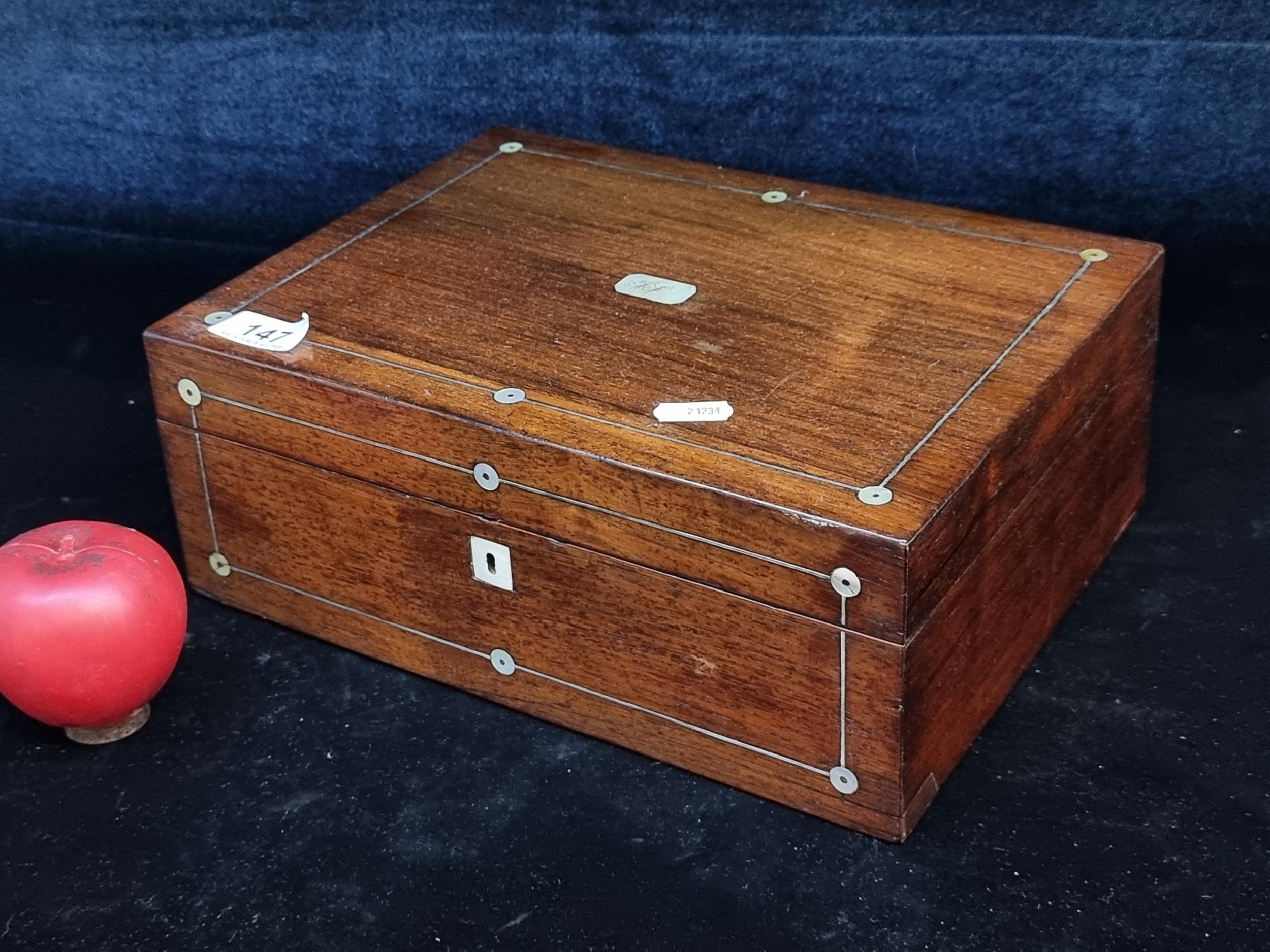 A charming antique wooden jewellery box featuring inlay and Mother of Pearl marquetry to top and silk lined.