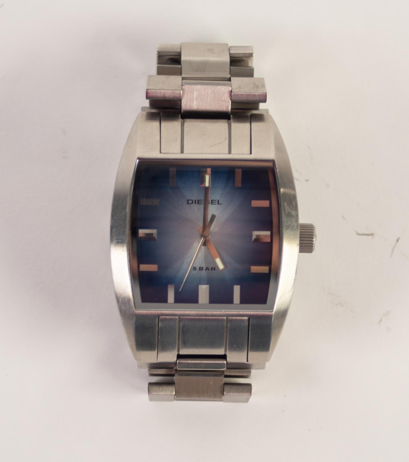 DIESEL 5 BAR QUARTZ WRISTWATCH, with fading blue rectangular dial with batons, centre seconds hand, in stainless steel case with integral stainless steel strap