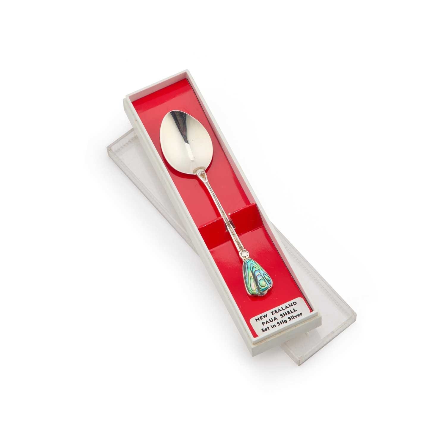 A NEW ZEALAND STERLING SILVER AND PAUA SHELL SPOON