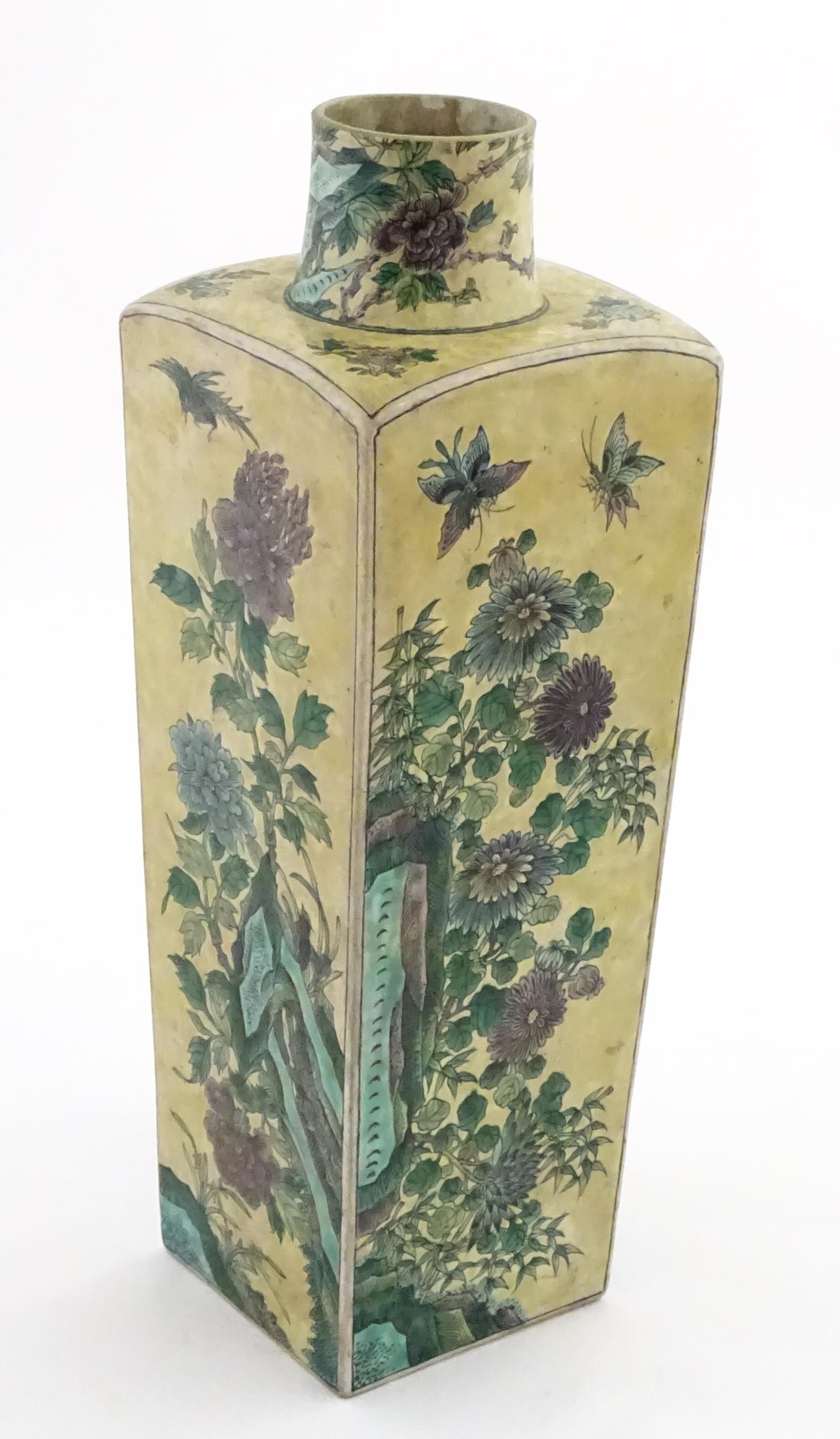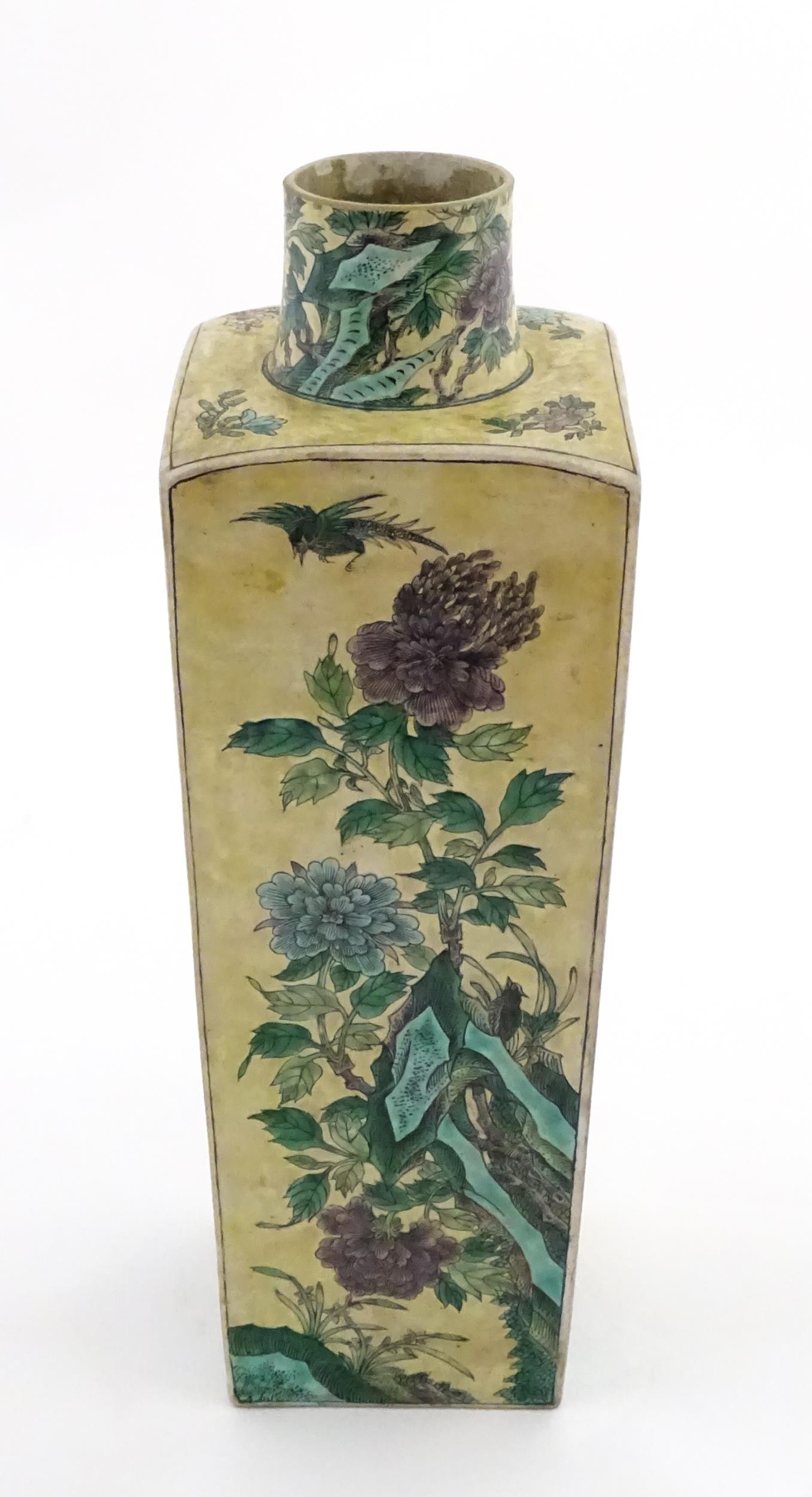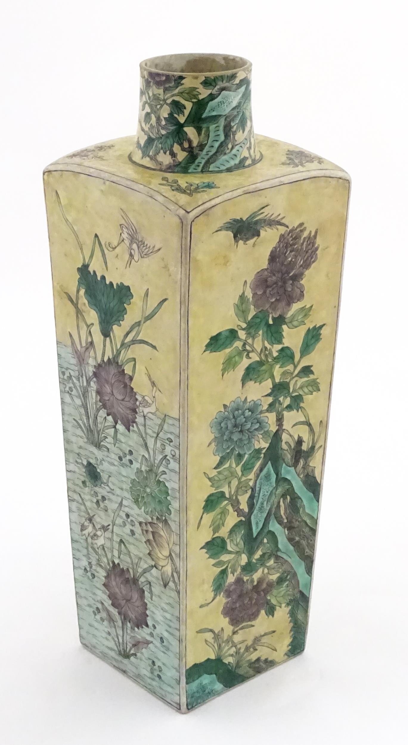 A Chinese vase of squared form with a yellow ground decorated with blossom, peonies, lotus leaves, birds, etc. Leaf motif under. Approx. 17 3/4" high