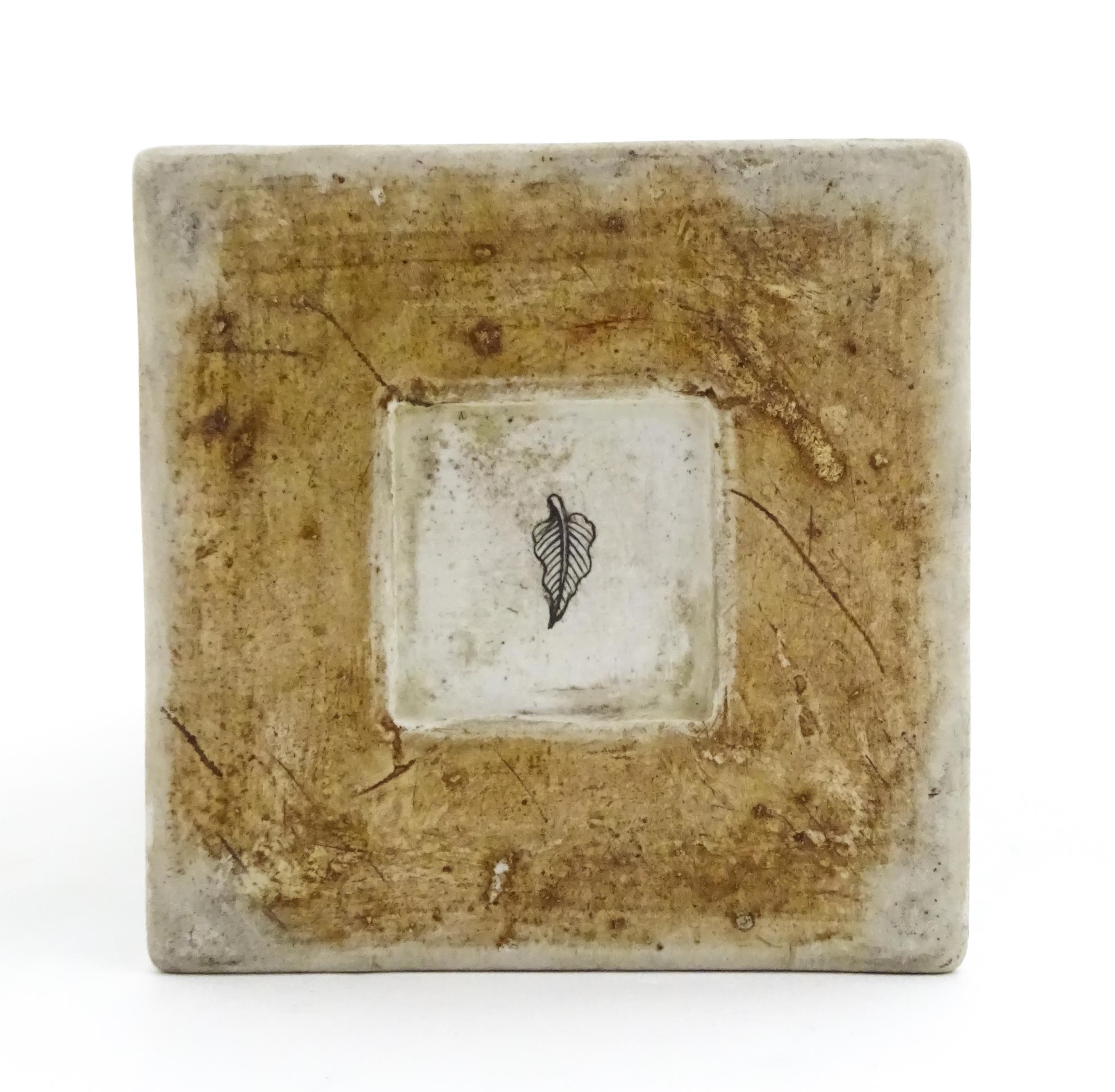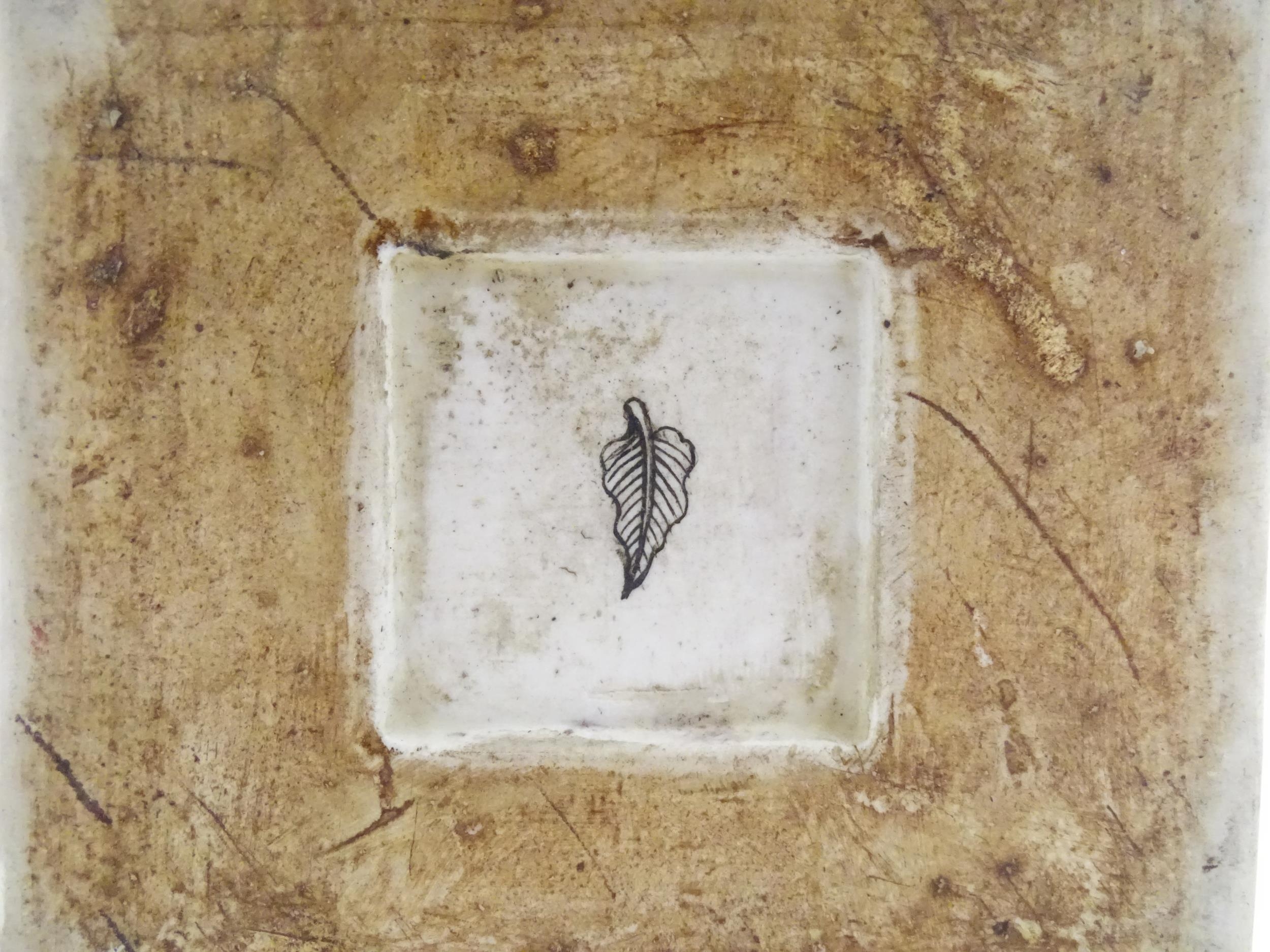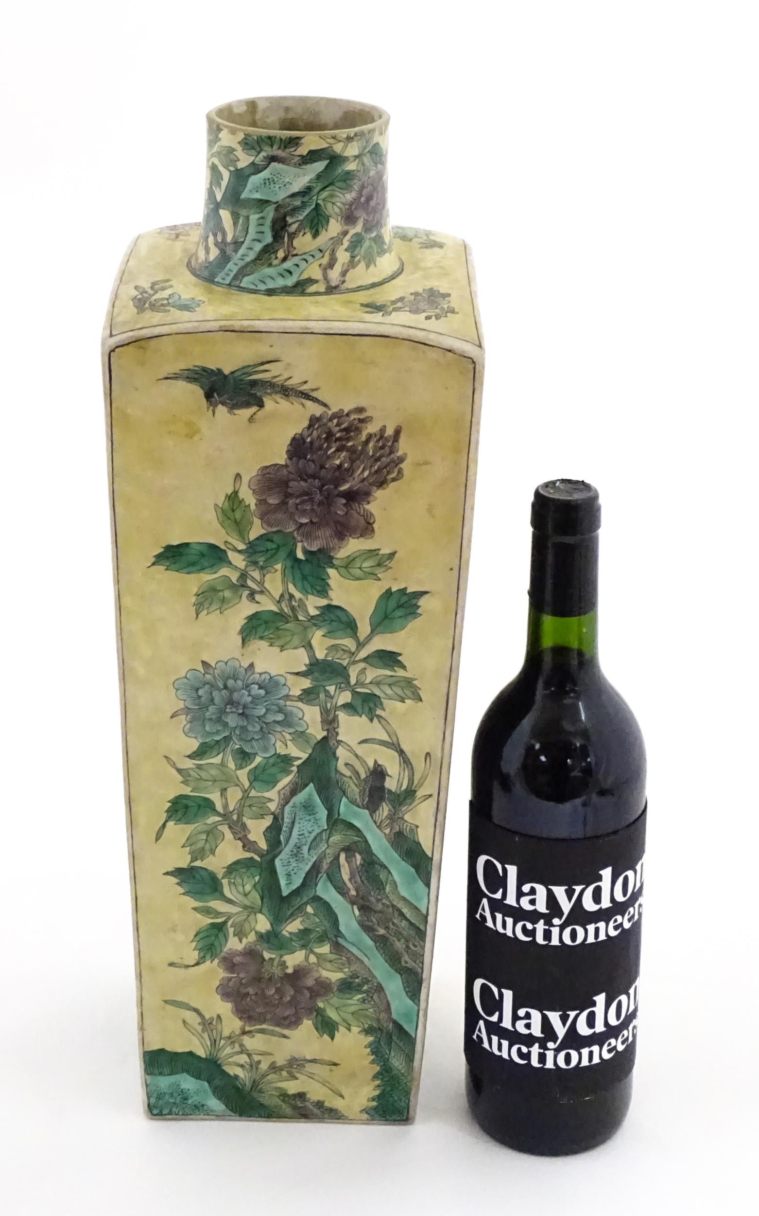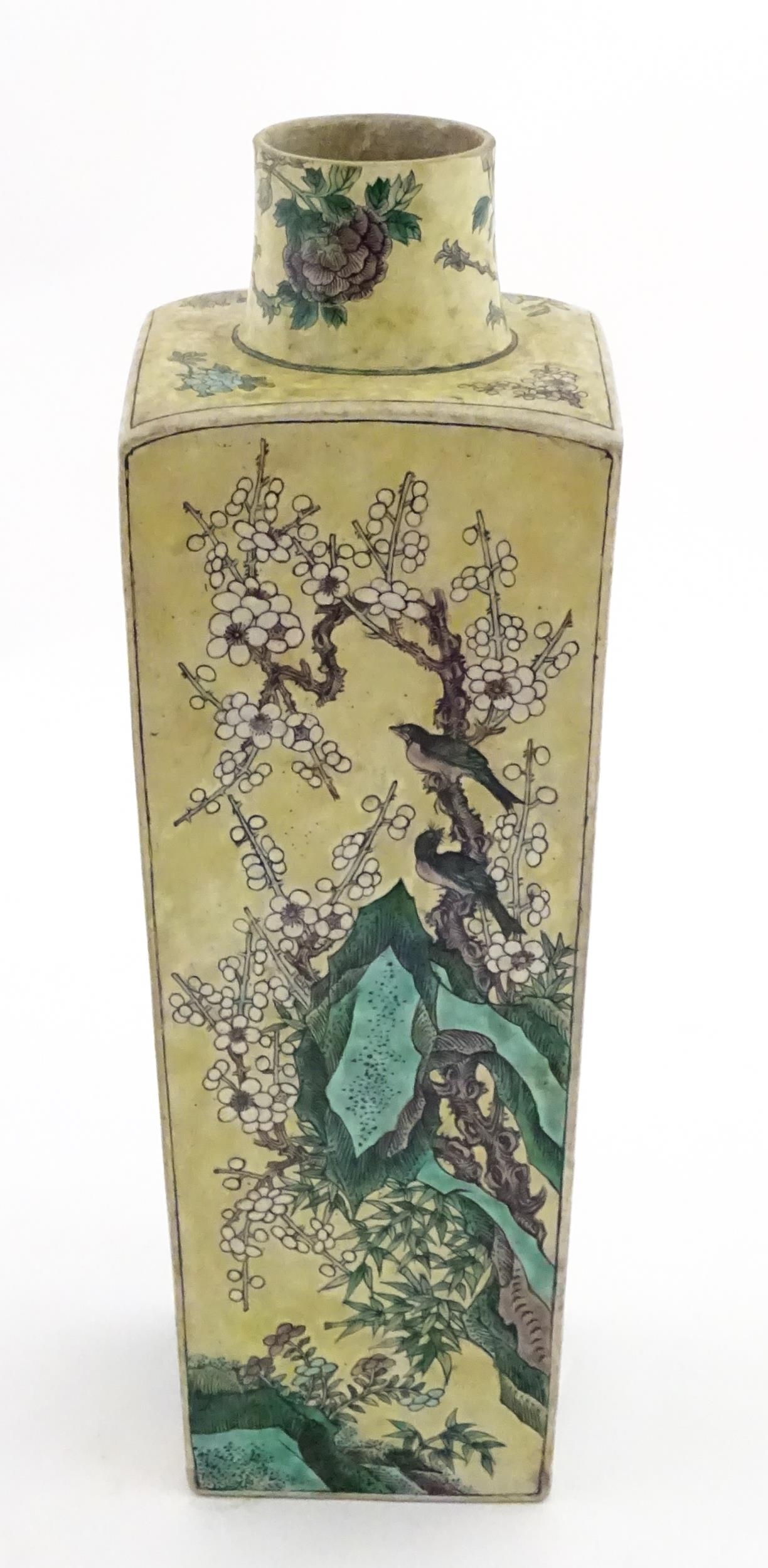 A Chinese vase of squared form with a yellow ground decorated with blossom, peonies, lotus leaves, birds, etc. Leaf motif under. Approx. 17 3/4" high