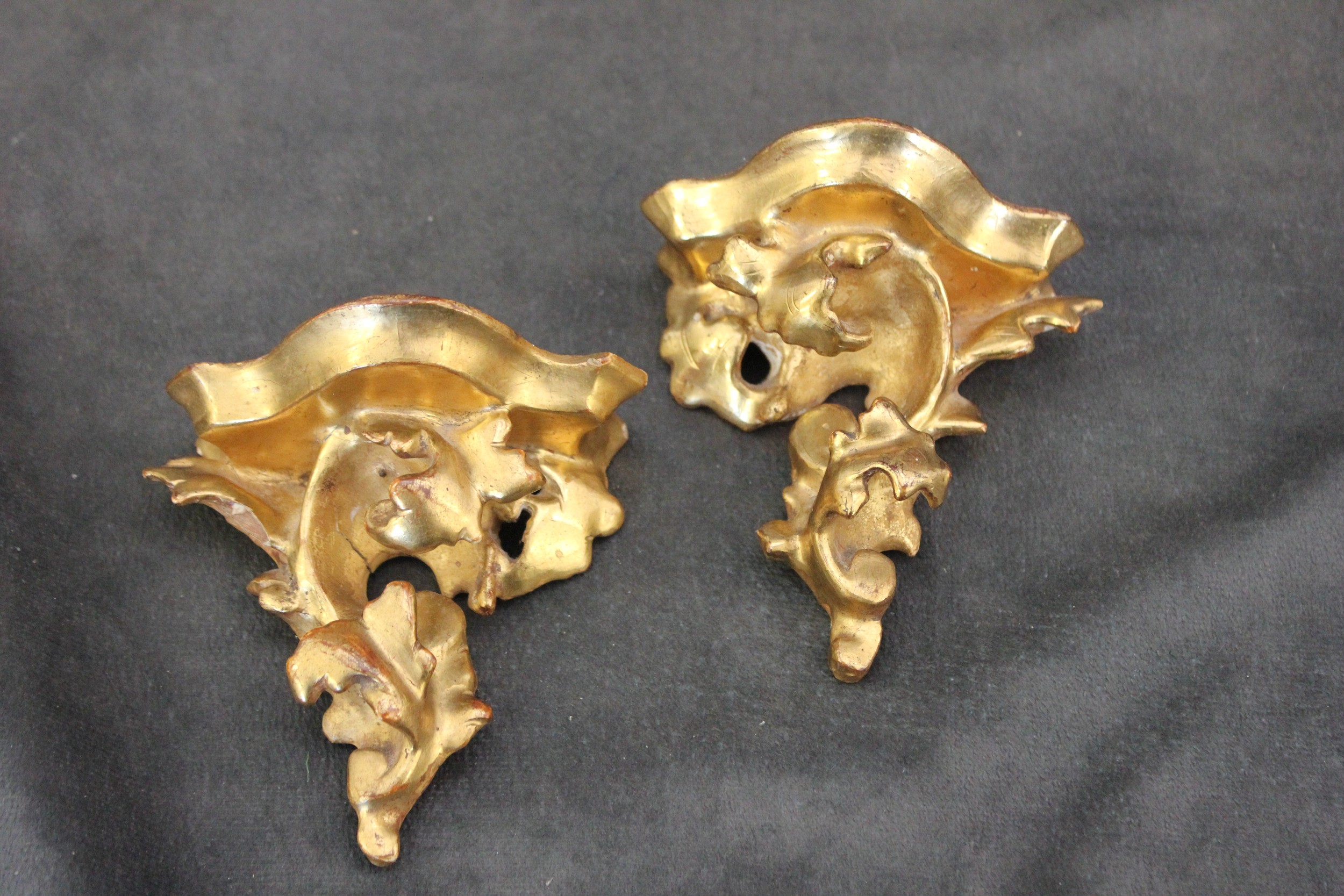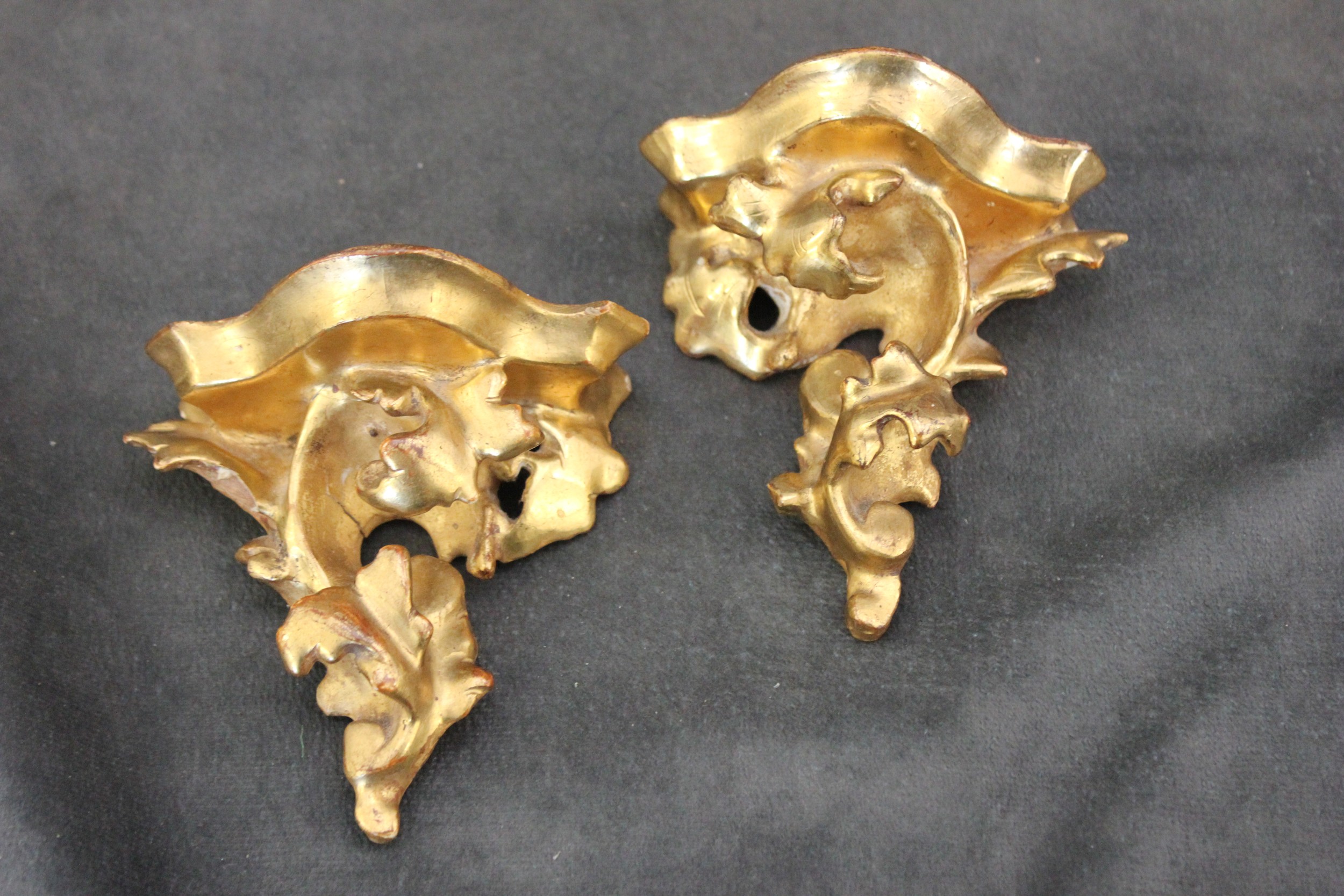 Two miniature gilt wood wall brackets, 9cm wide x 10cm high.