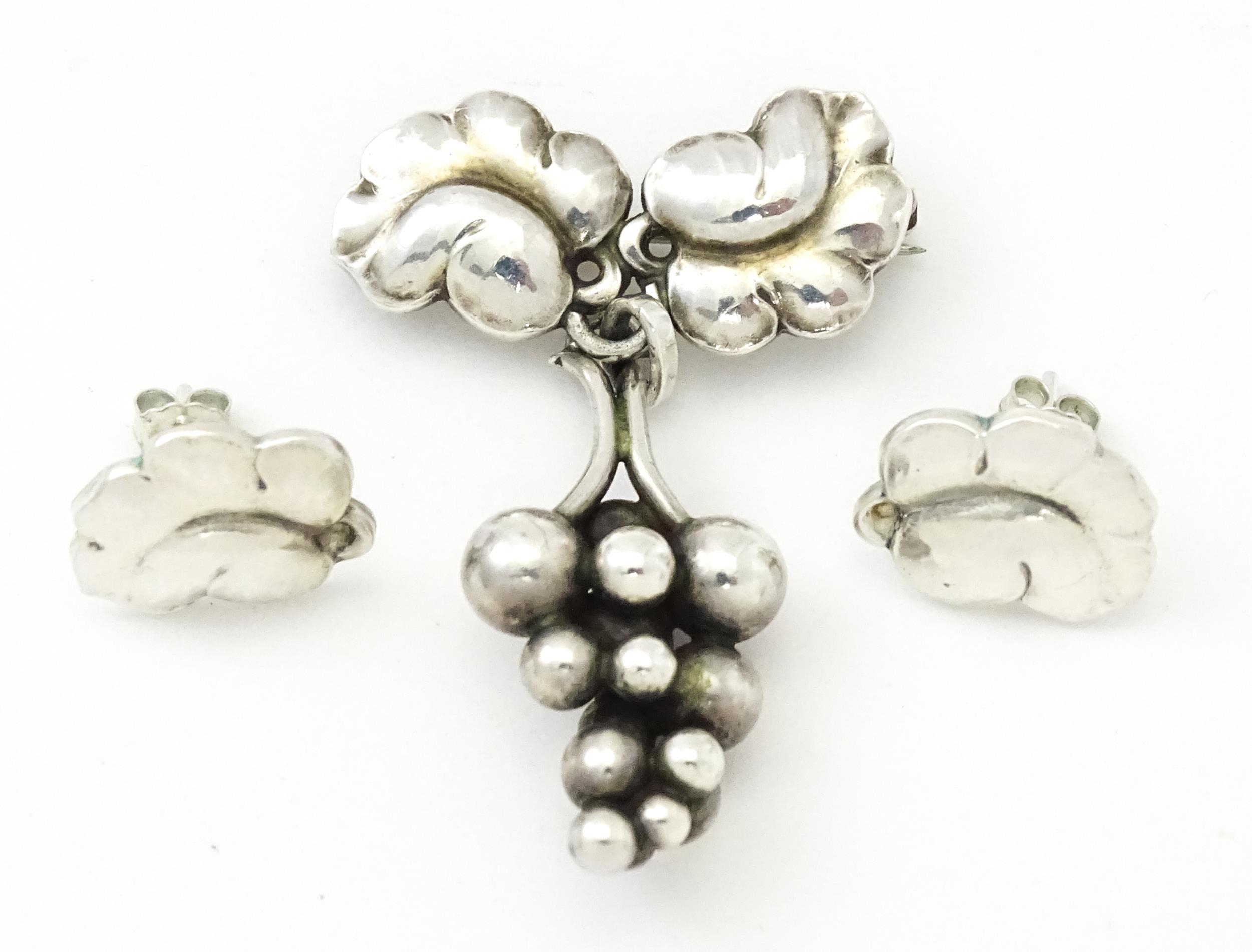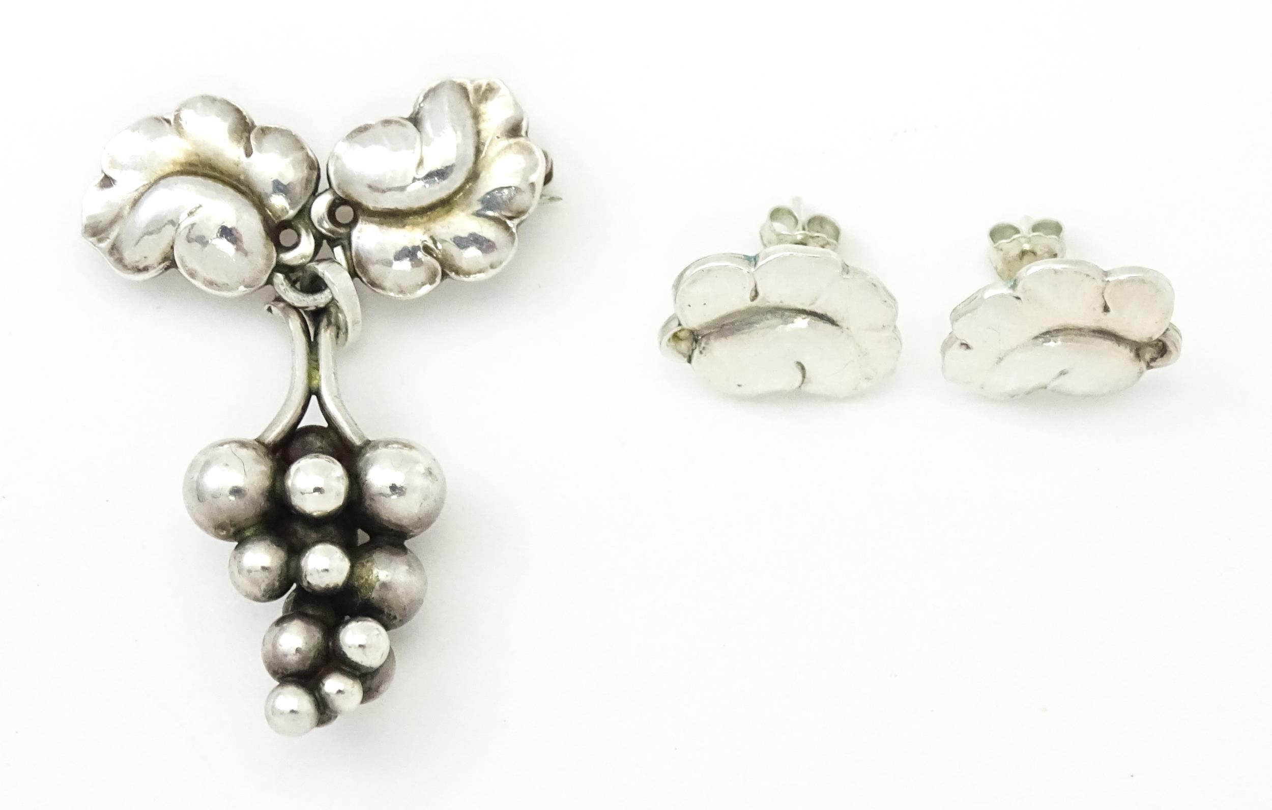 Scandinavian Silver : A Danish Georg Jensen pair of earrings, marked Georg Jensen Sterling Denmark and numbered 55. Together with a Danish Georg Jensen brooch in the Moonlight Grapes pattern Marked Georg Jensen Sterling Denmark and numbered 217A. The brooch Approx 1 1/4" wide (2+1) (approx 9.4g)