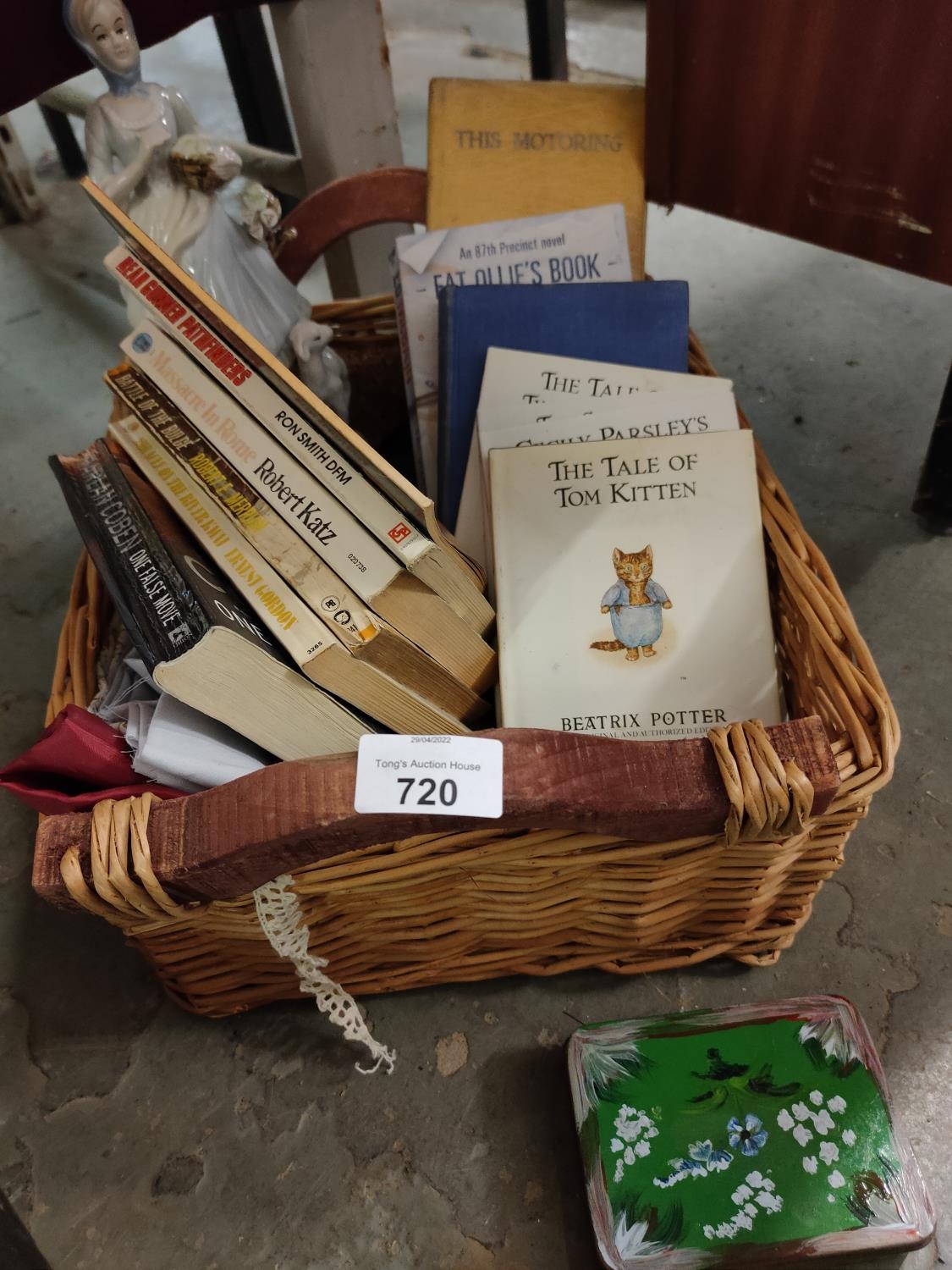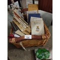Wicker Basket with contents of linen, figurine and vintage Books including Beatrix Potter, Battle of the Bulge and Miracle on the River Kwai