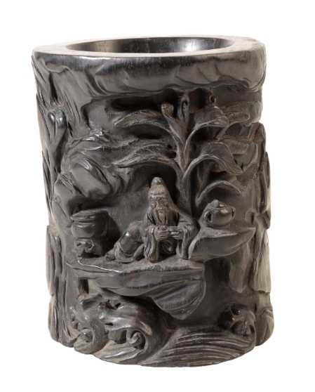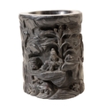 A CHINESE "ZITAN" BRUSH POT carved with an immortal climbing on a rocky outcrop in the shade of a tree, the reverse carved as a gnarled tree trunk, early Qing or later, 20cm high x 16cm wide