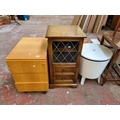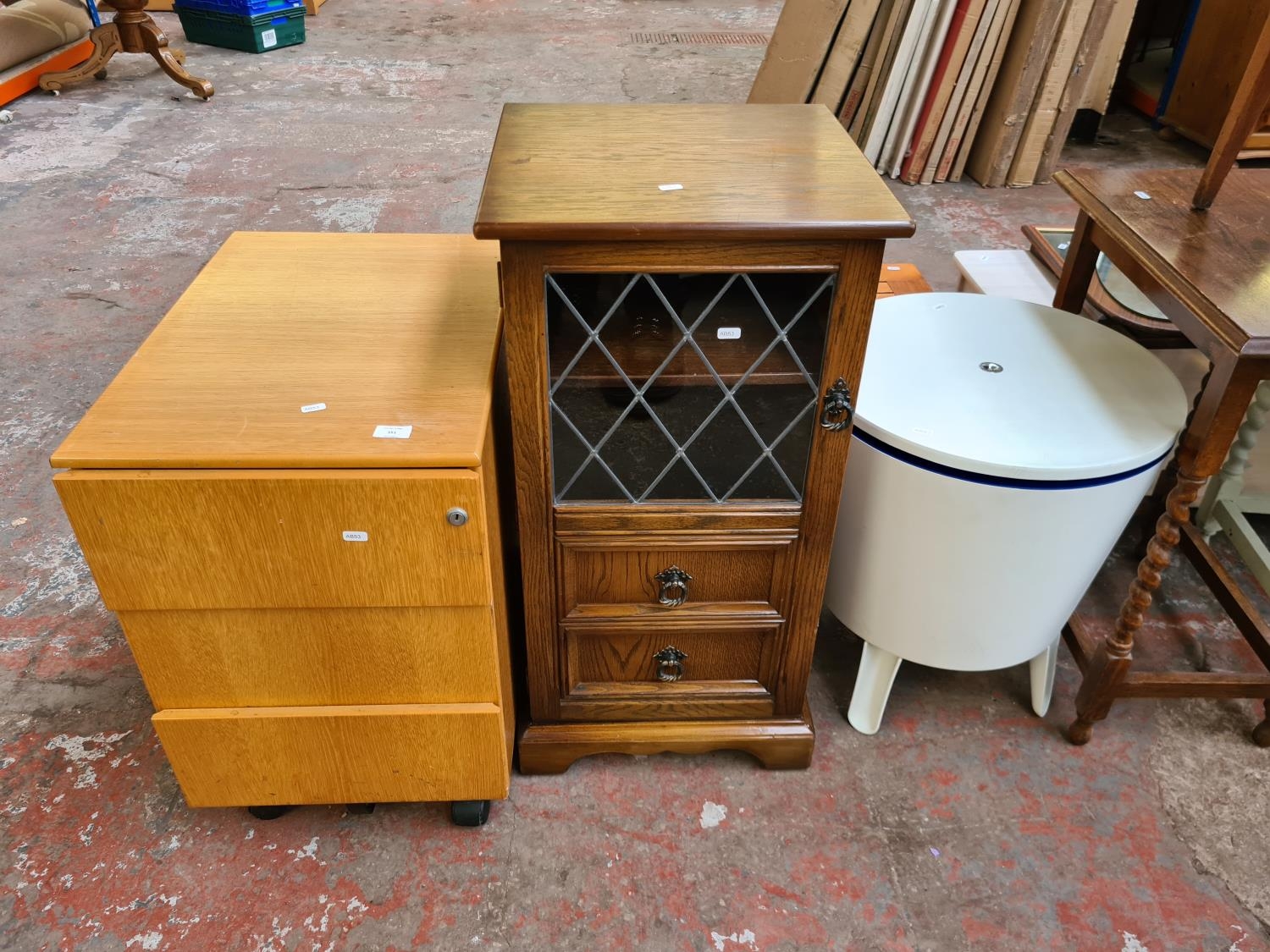 Three items, a modern Exel oak effect filing cabinet, Priory style oak hi-fi cabinet and a mid 20th century style white ice bucket/side table