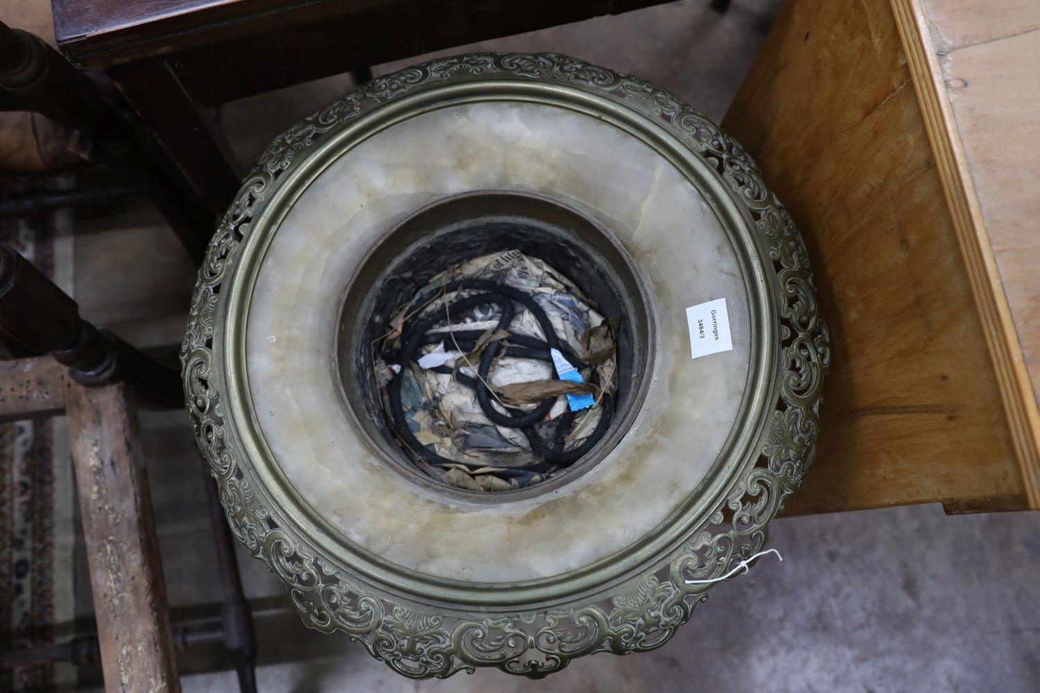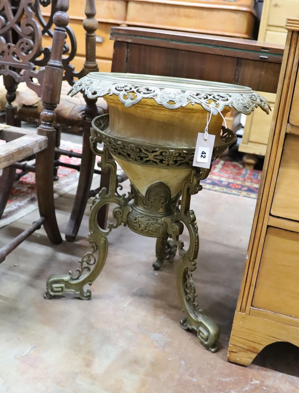 A Chinese cast brass and alabaster jardiniere, diameter 50cm, height 62cm