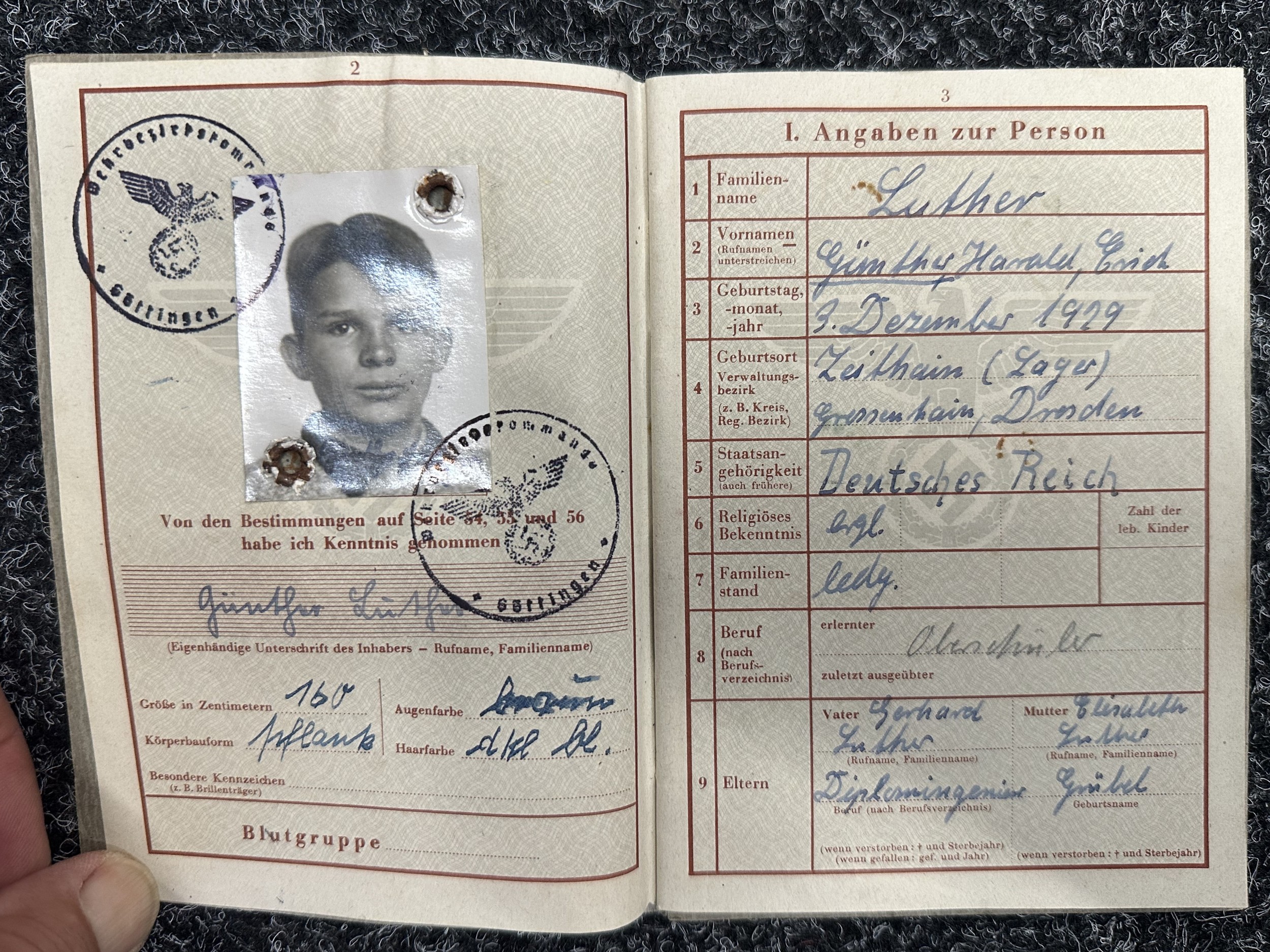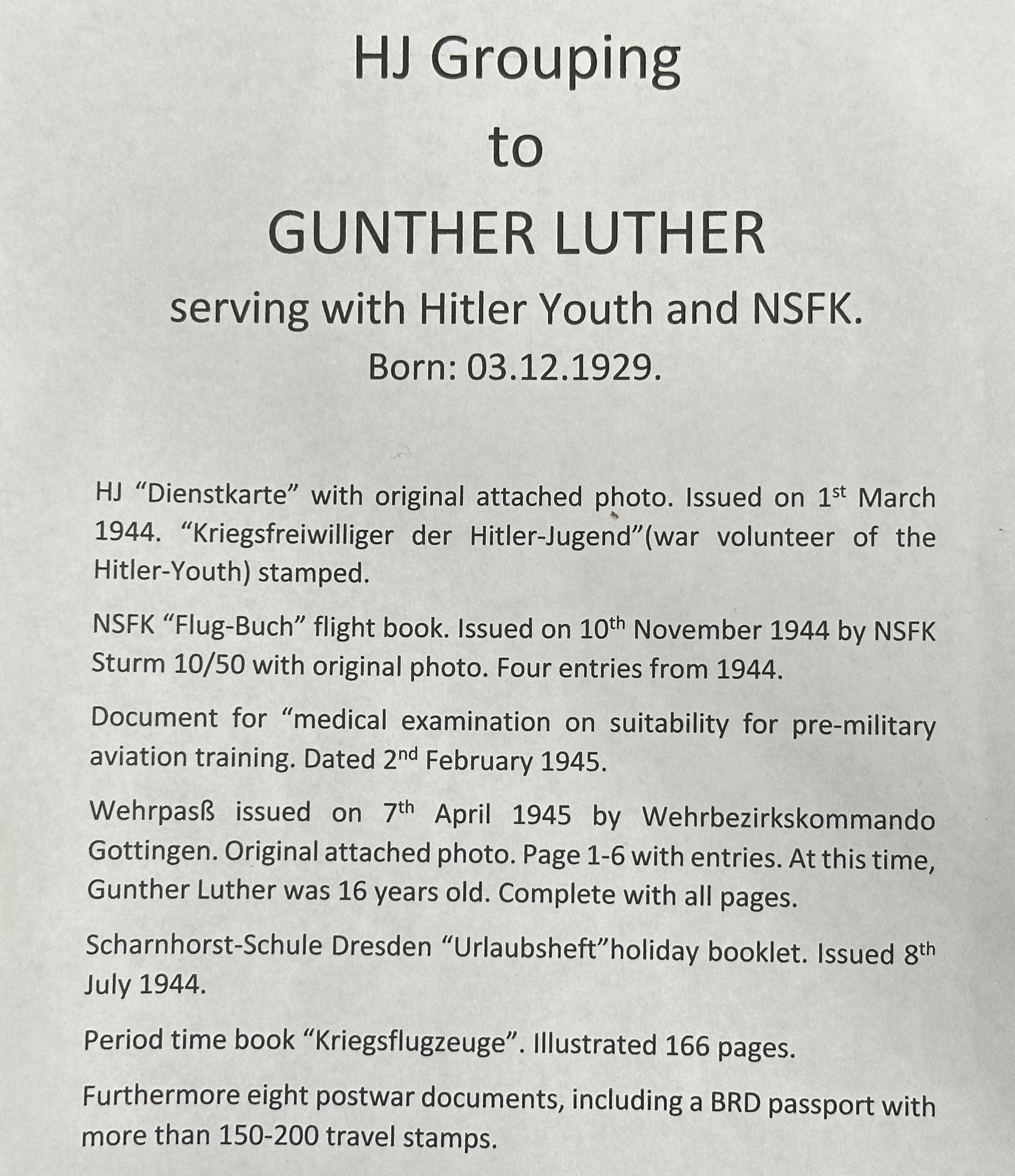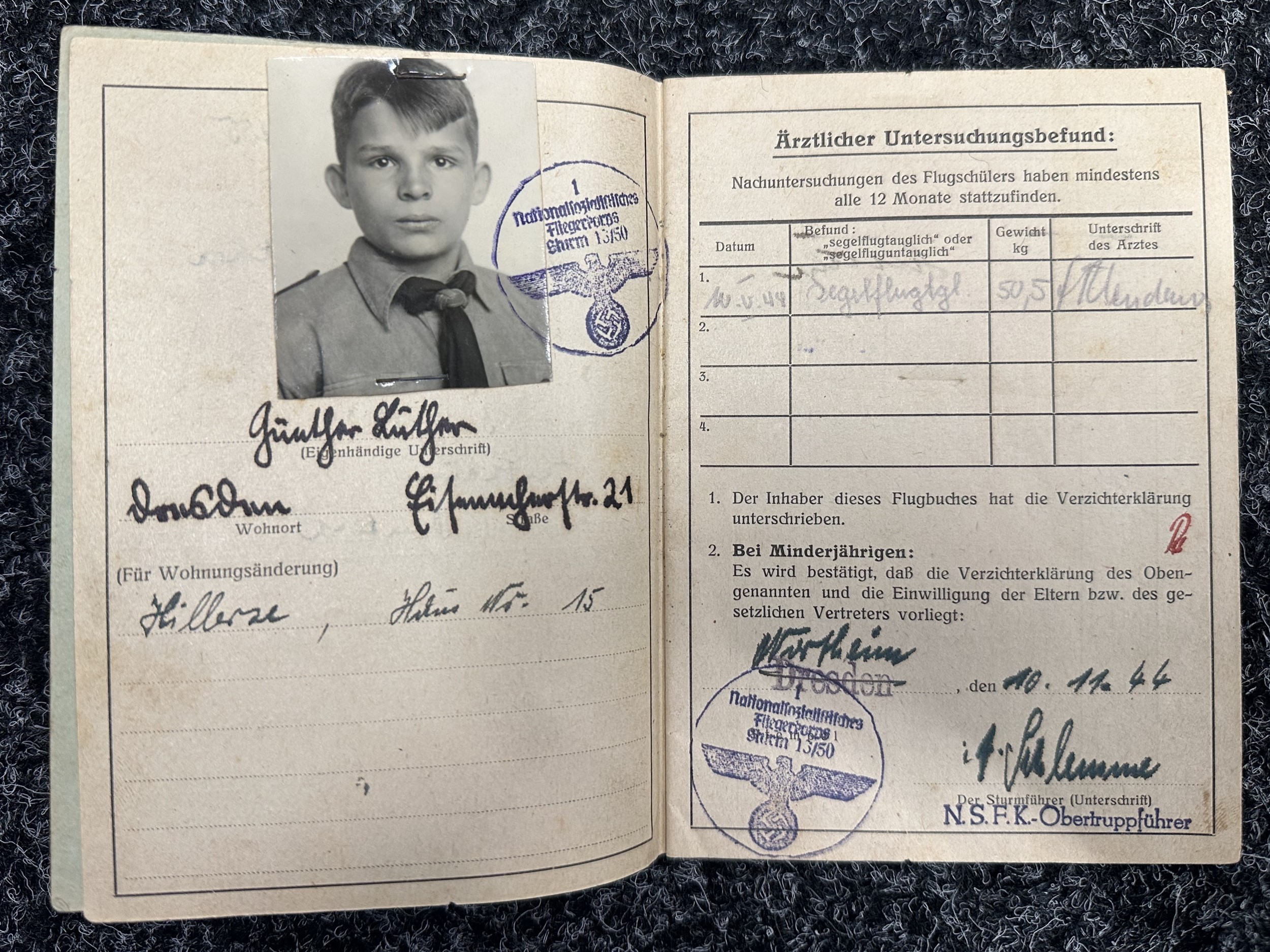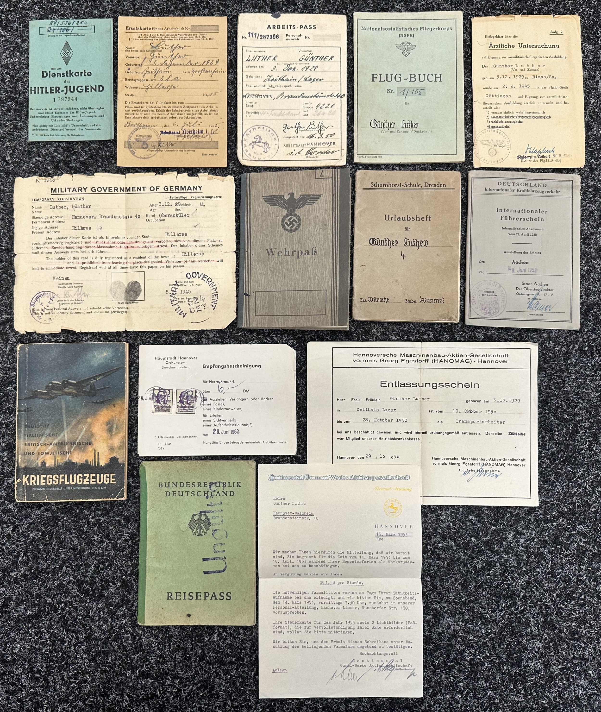 WW2 Third Reich HJ/NSFK/Wehrpass Paperwork Group to Gunther Luther born 1929 comprising of: HJ Deinstkarte with photo, NSFK Flugbuch with photo, Document for medical exam for pre military aviation training 2/2/45, Wehrpass issued 7/4/45 with photo aged 16 plus other spare photos, Scharnhorst Schule Dresden booklet July 1944, Aircraft recognition book, postwar documents including BRD Passport with photo.