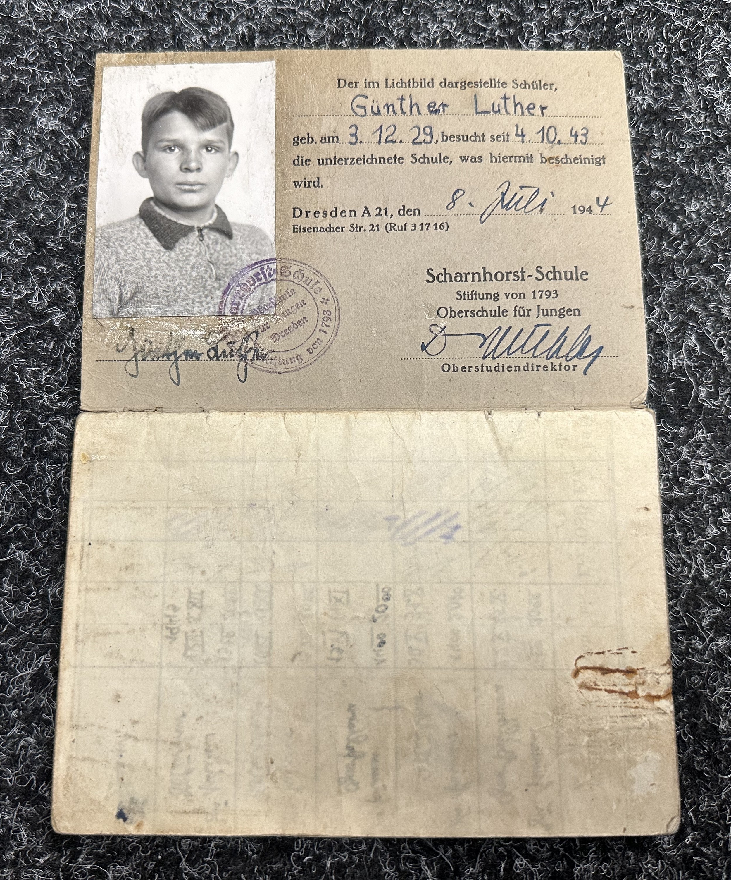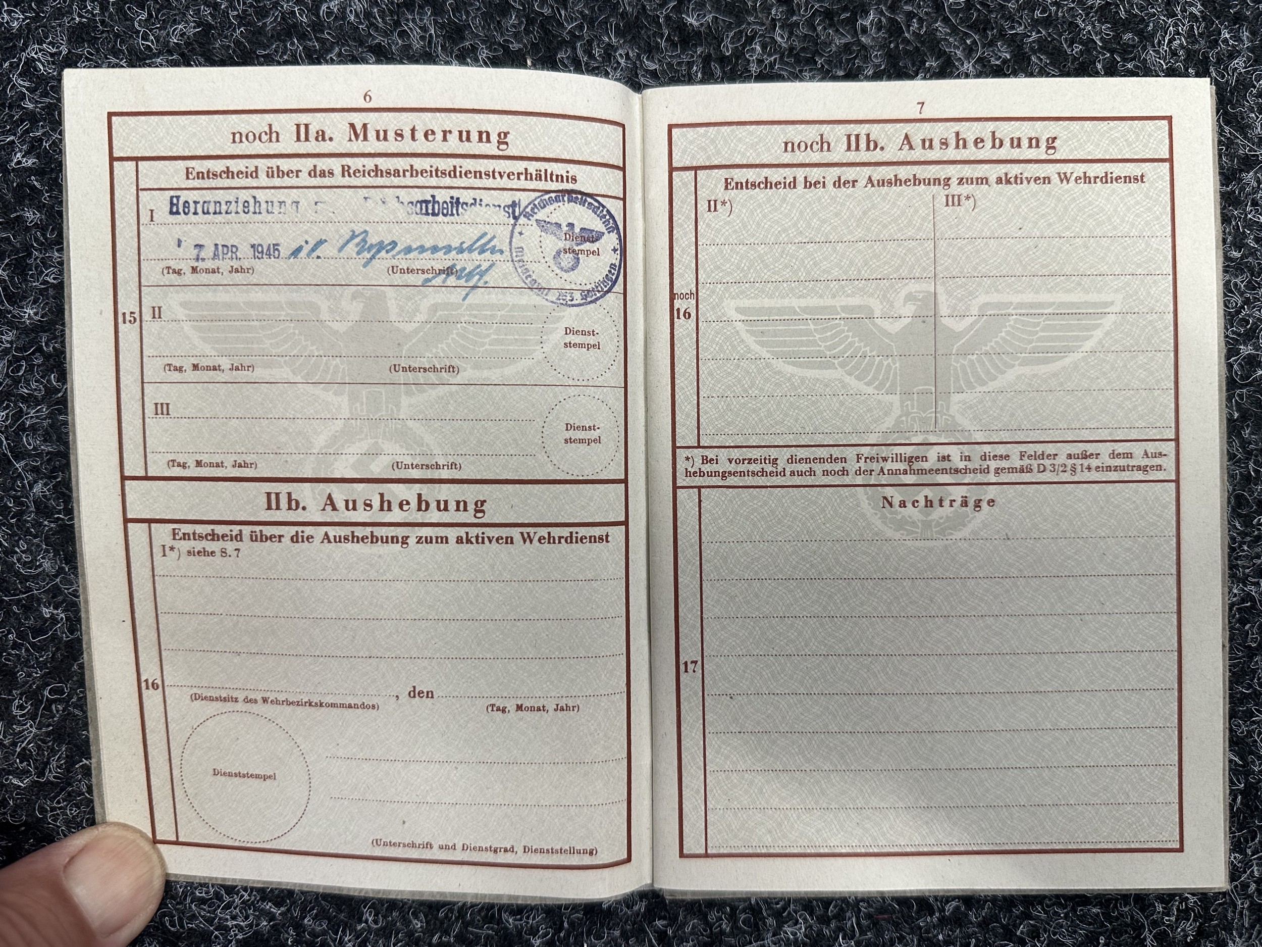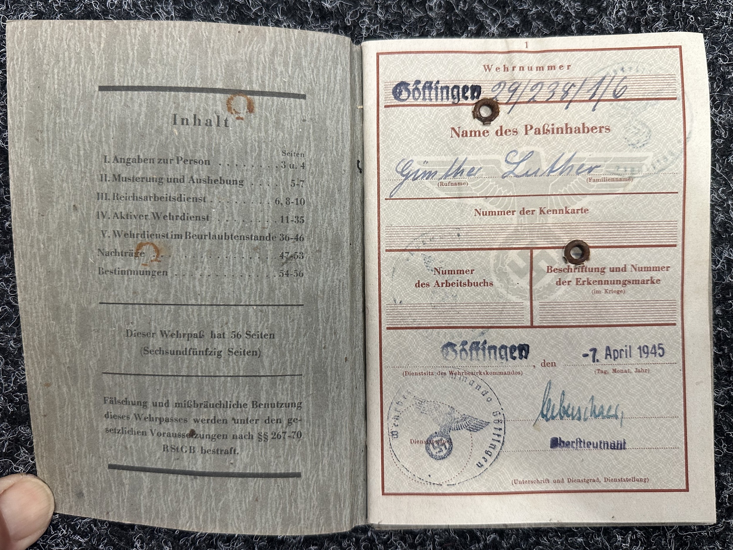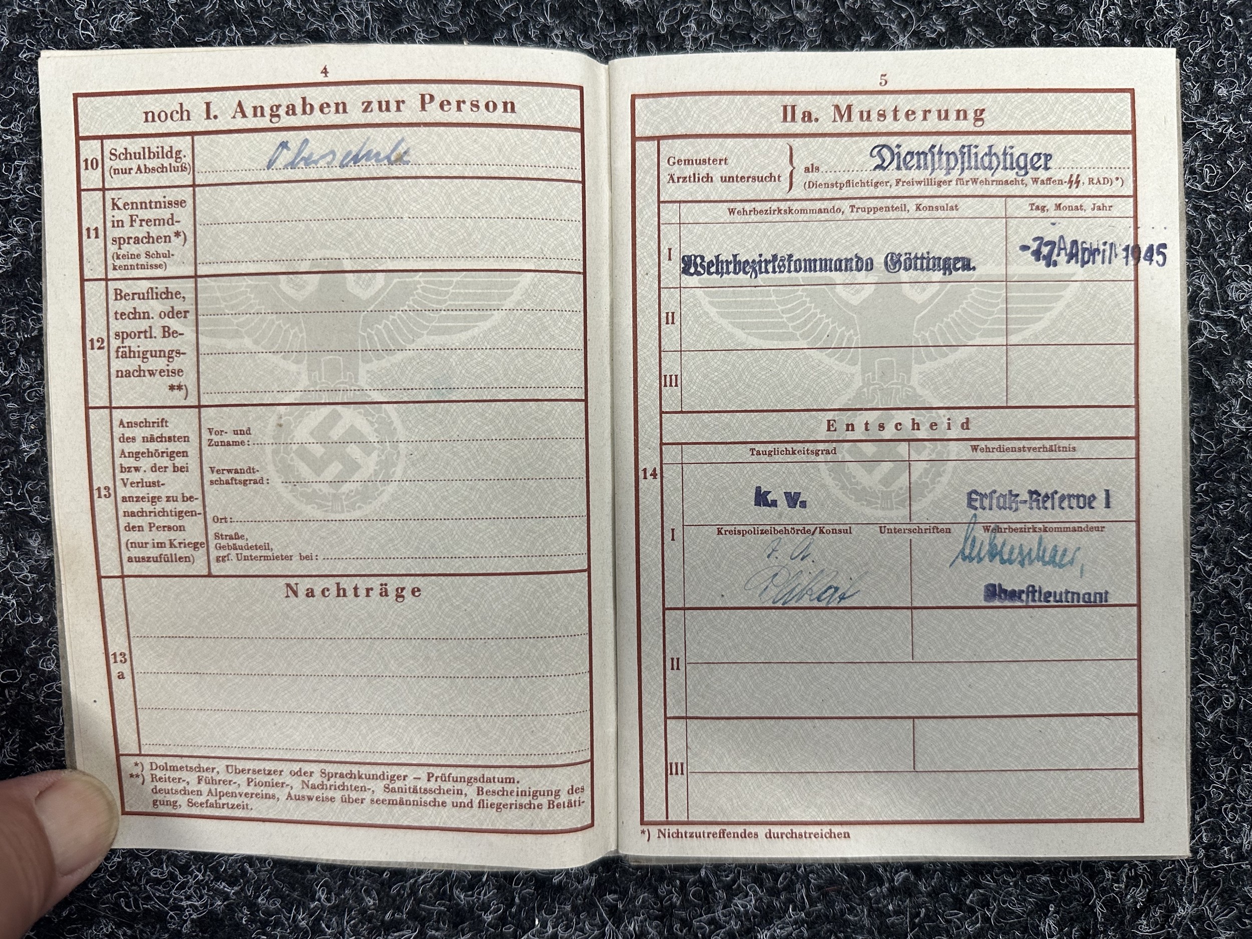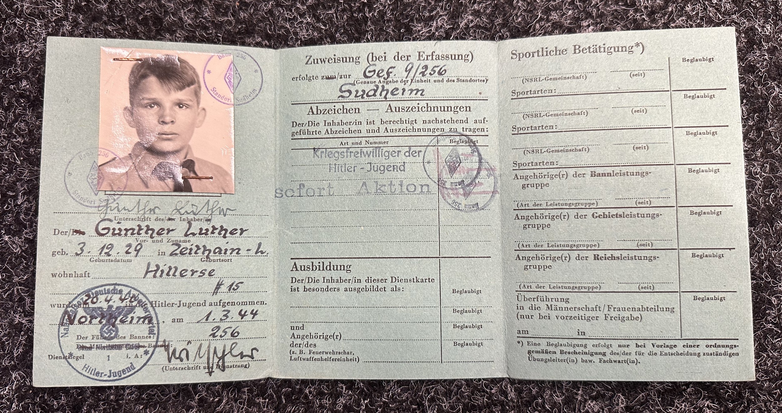 WW2 Third Reich HJ/NSFK/Wehrpass Paperwork Group to Gunther Luther born 1929 comprising of: HJ Deinstkarte with photo, NSFK Flugbuch with photo, Document for medical exam for pre military aviation training 2/2/45, Wehrpass issued 7/4/45 with photo aged 16 plus other spare photos, Scharnhorst Schule Dresden booklet July 1944, Aircraft recognition book, postwar documents including BRD Passport with photo.
