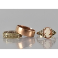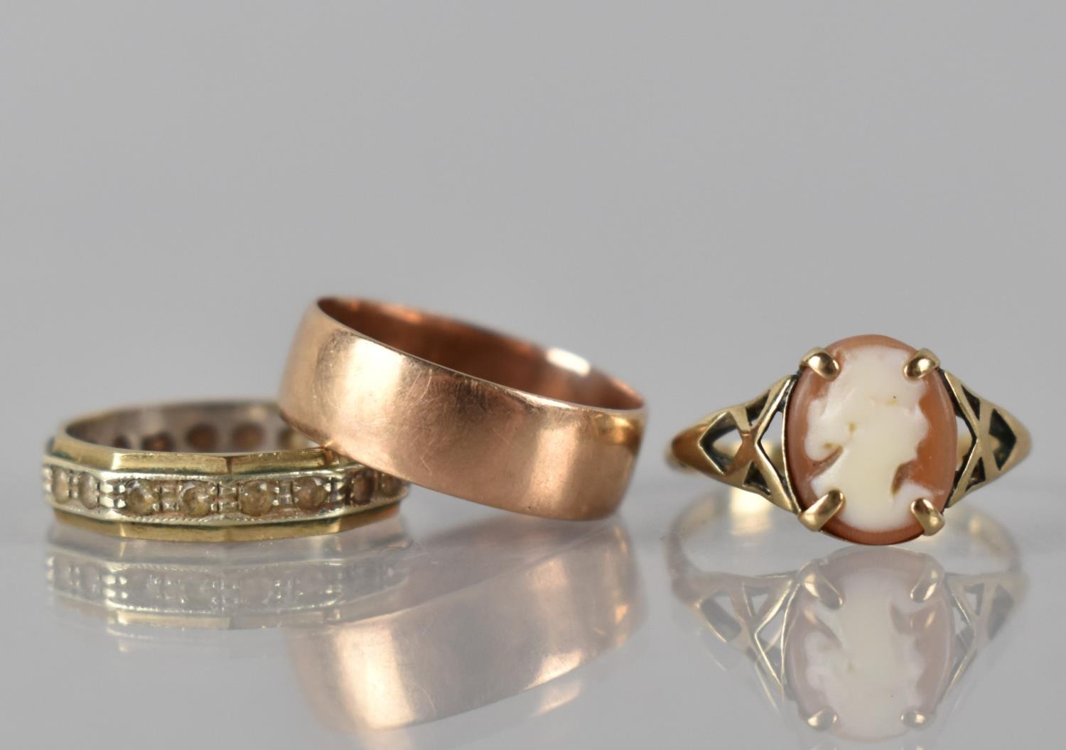 Three 9ct Gold Mounted Rings to include Rose Gold Wedding Band, Birmingham 1902, Makers Mark S&G, Size L, A Faceted Gold and Silver Eternity Band with White Stone Chips, Size J, and a 9ct Gold Cameo Ring with Oval Shell Plaque Depicting Maiden, Pierced Shoulders to a D Shape Band, Stamped Internally 9ct, Total Weight 5.8gms