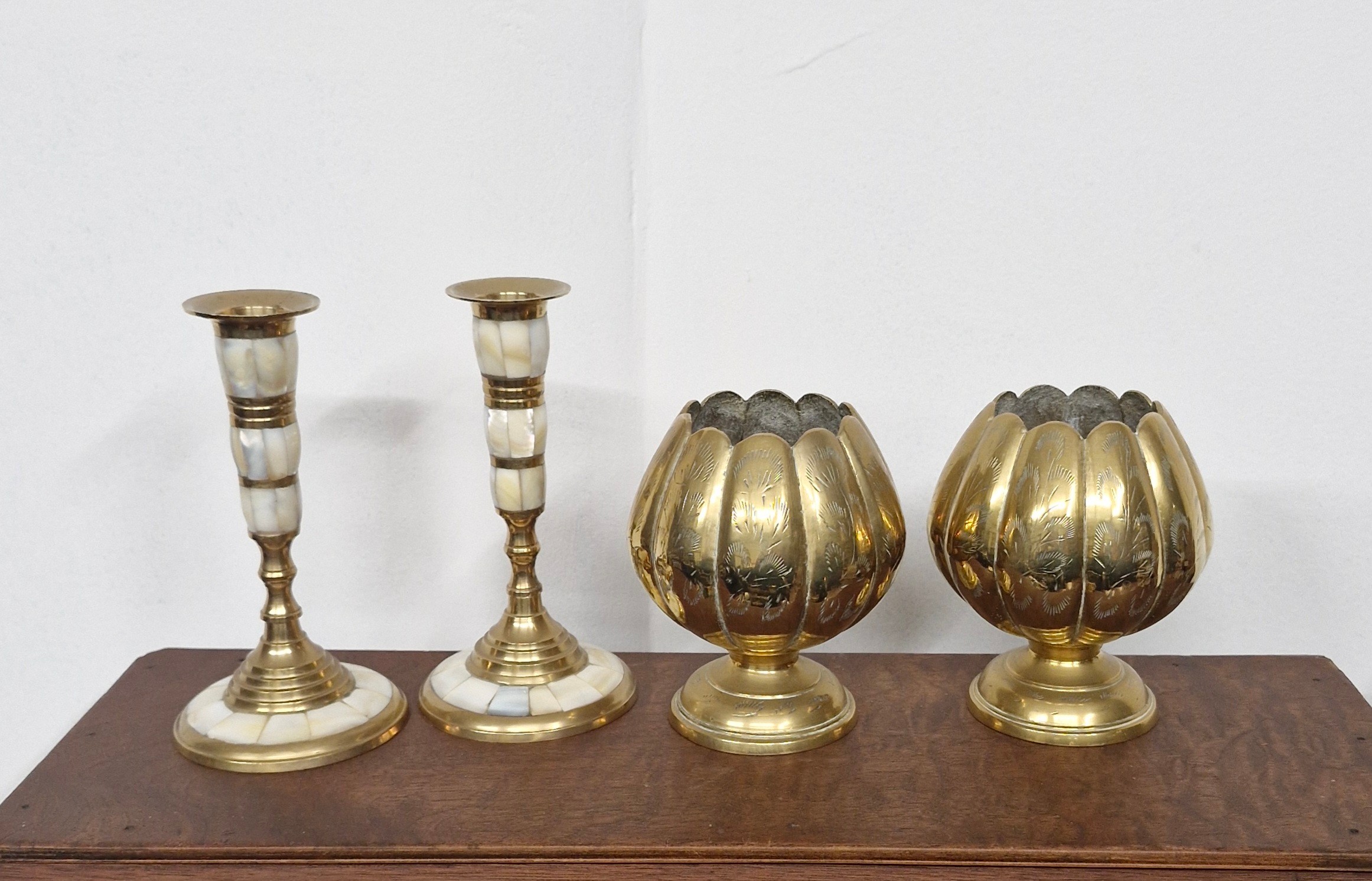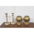 A pair of brass decorative candlesticks and a pair of brass lotus vases -